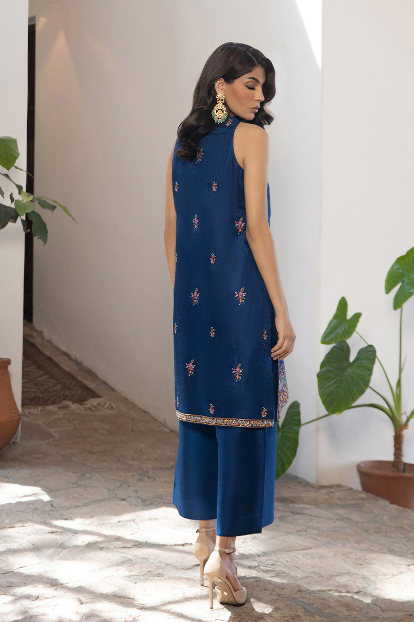 A montana blue, silk jamawar shirt designed with hand embroidery on the front and back; paired with matching, raw silk plain culottes. This outfit is made complete with a heirloom,...