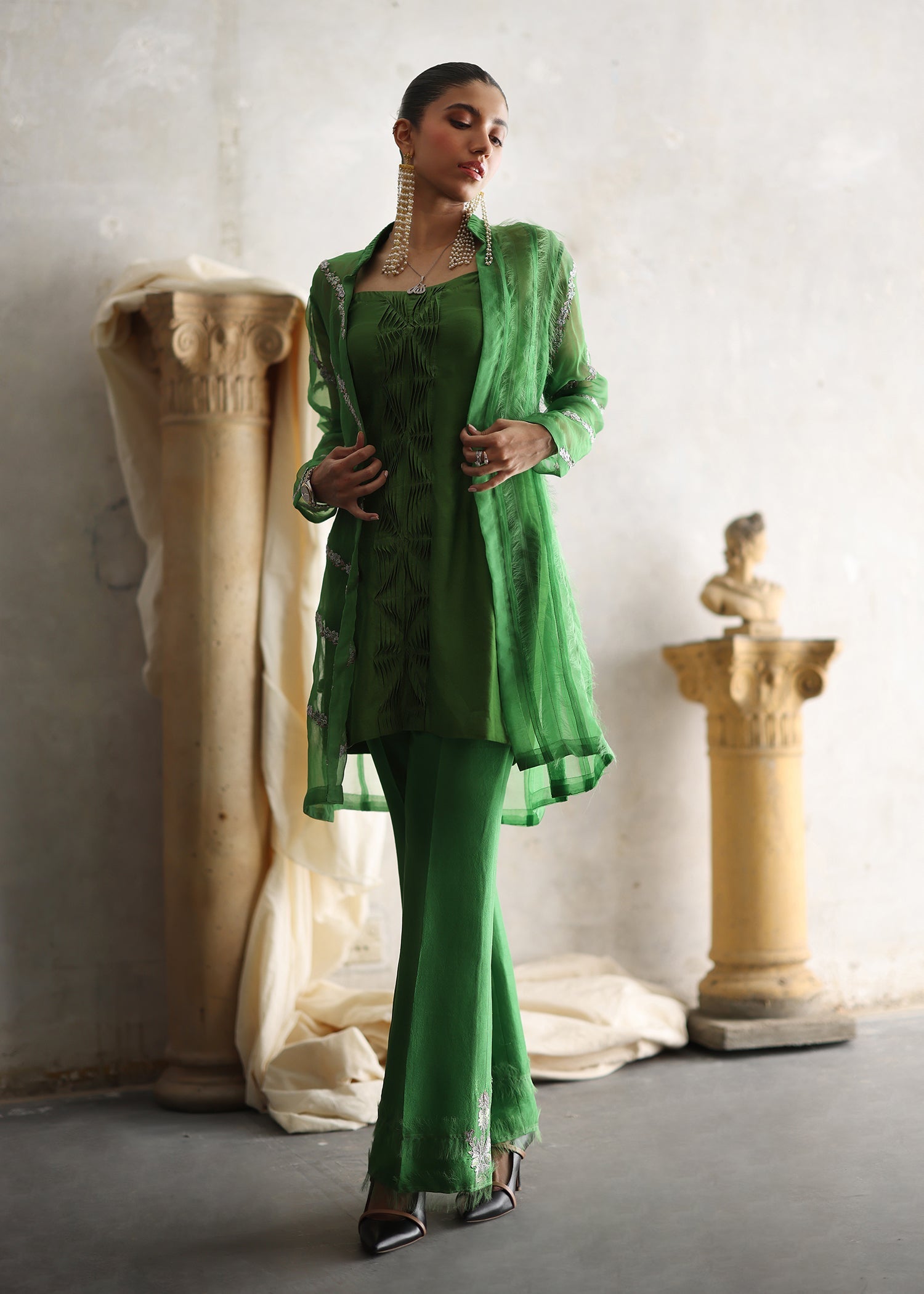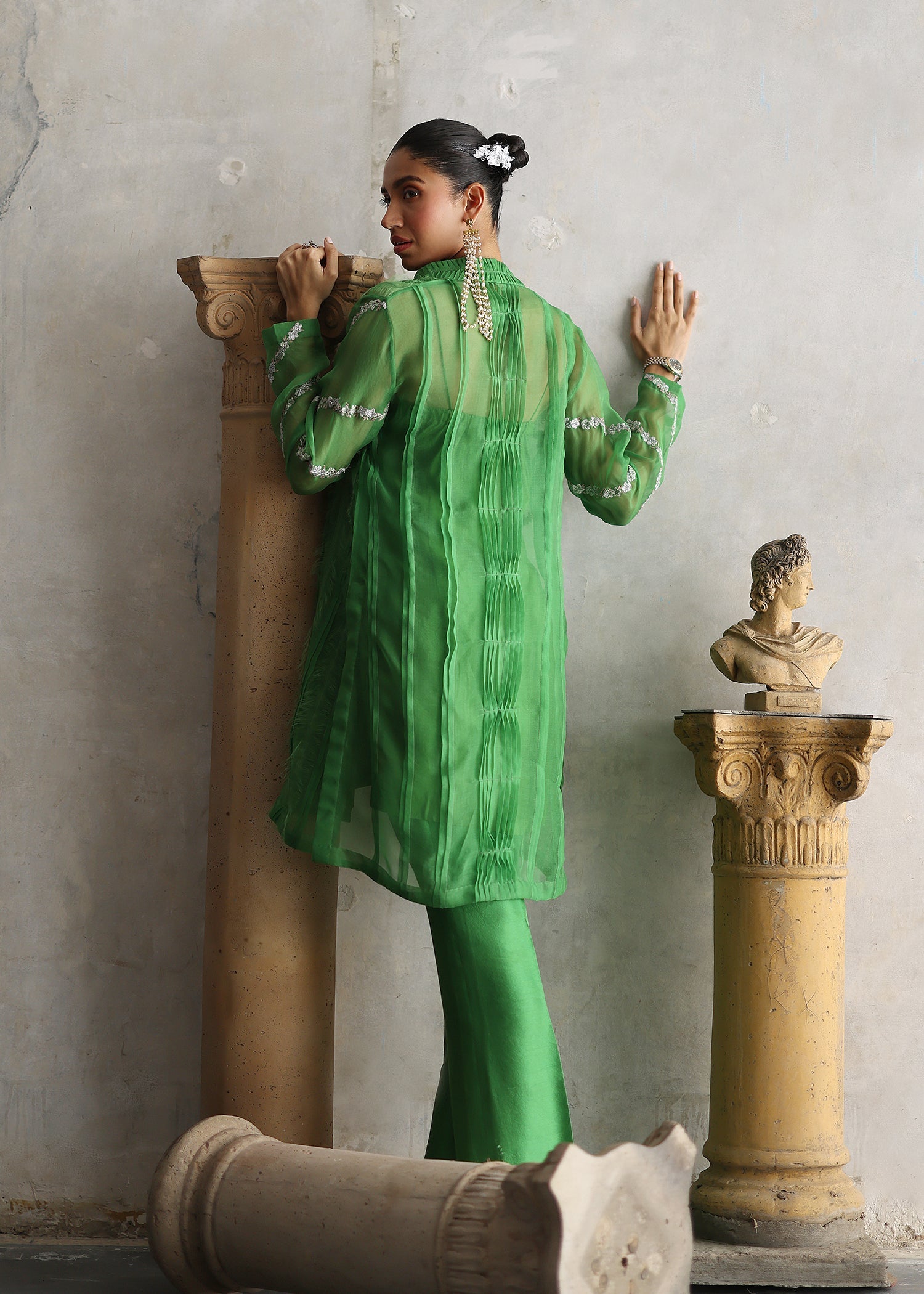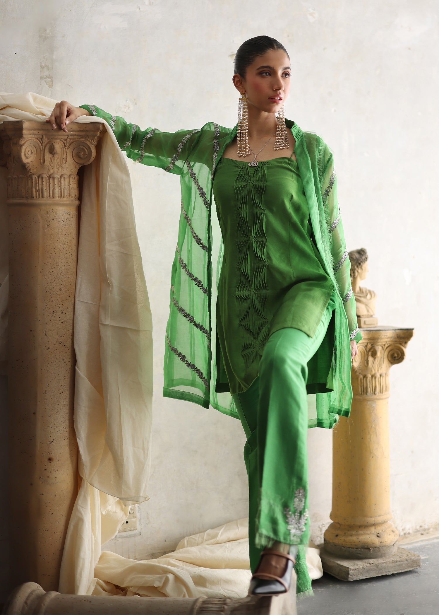 Color: Grass Green Description: Elevate your style with this chic organza open jacket. The diagonal embroidery, vertical pleats, and edgy fray details create a captivating effect. Paired with a stunning...