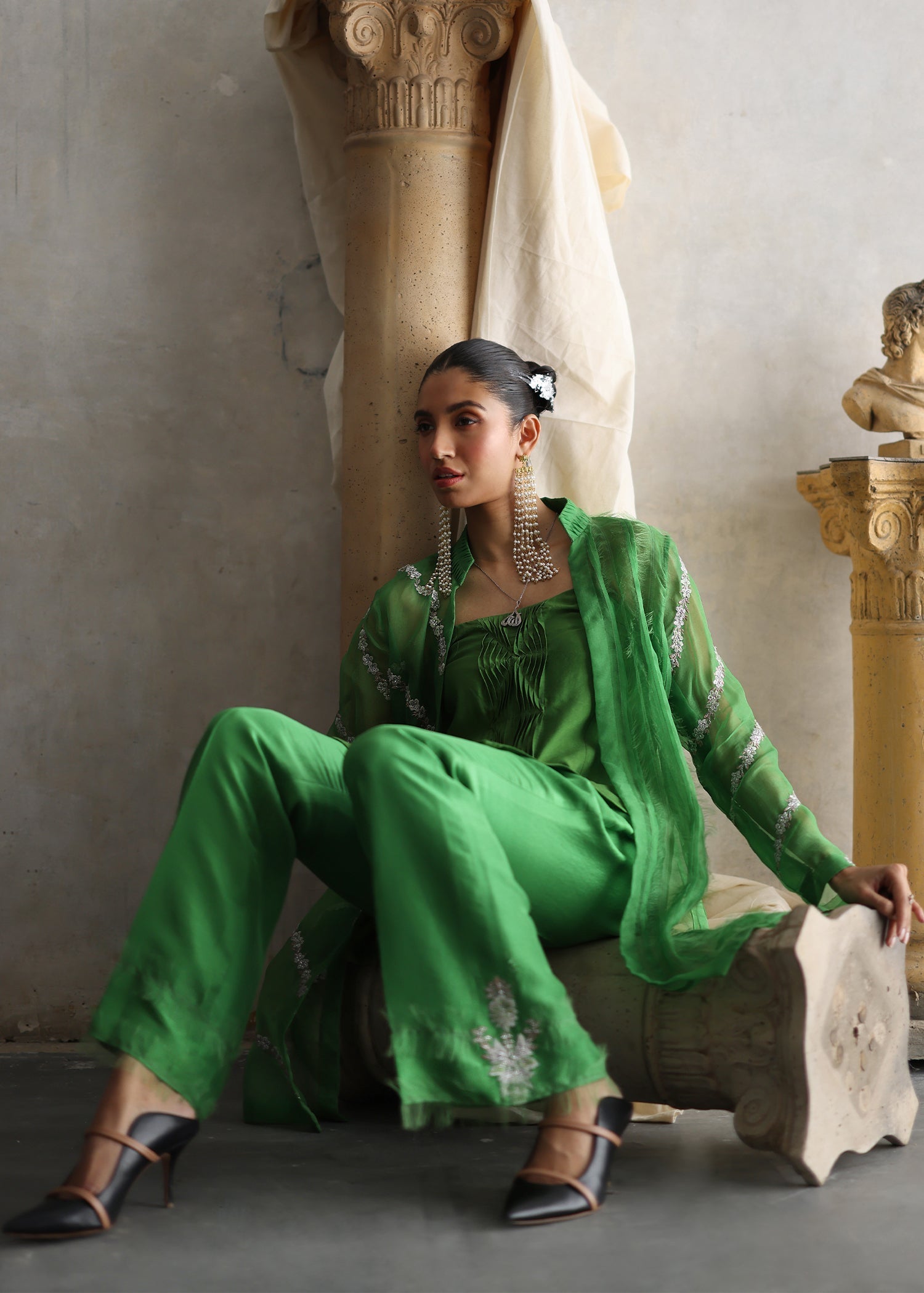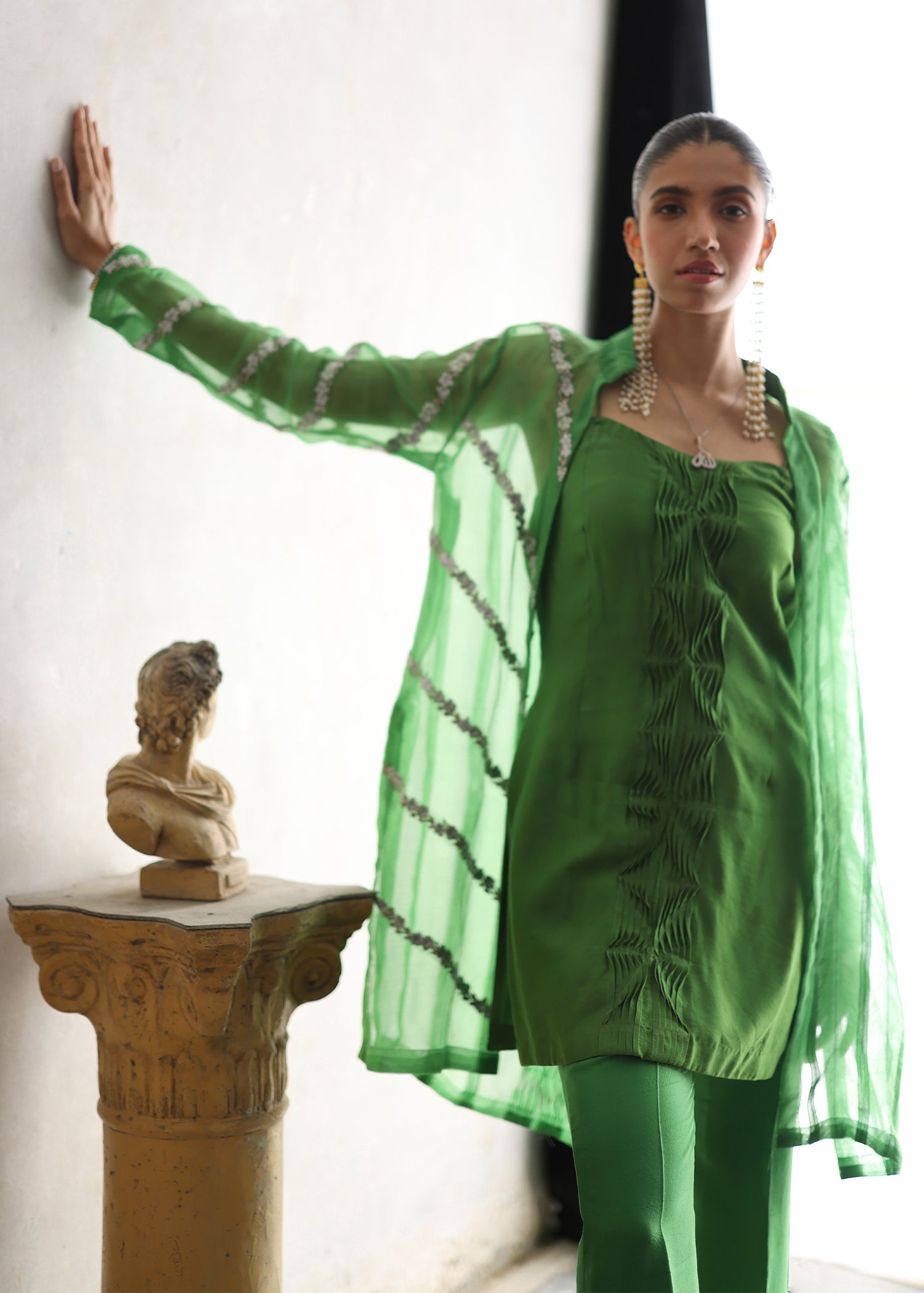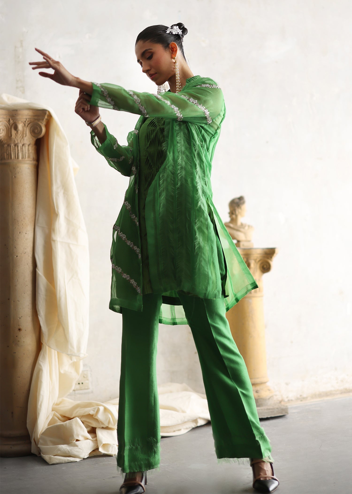 Color: Grass Green Description: Elevate your style with this chic organza open jacket. The diagonal embroidery, vertical pleats, and edgy fray details create a captivating effect. Paired with a stunning...