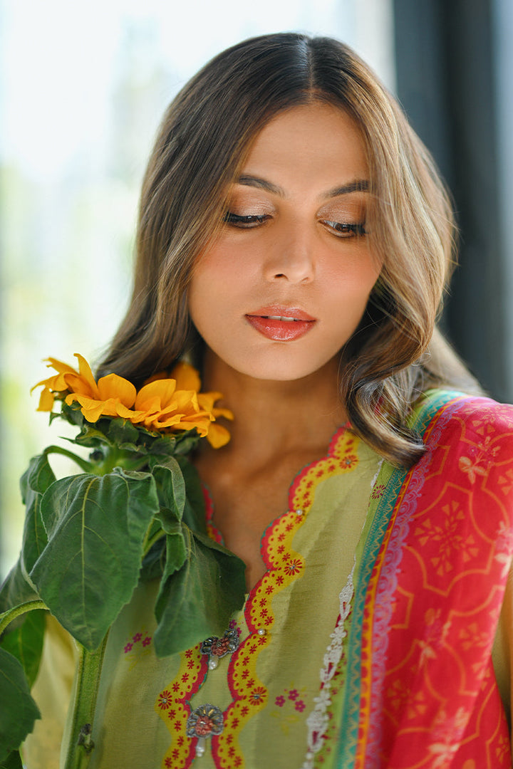 This mint green floral printed pure rawsilk shirt is a vibrant blend of delicate blooms in shades of yellow, pink, and ivory, creating a soft yet lively look. The shirt is meticulously finished with an embroidered border, adding a touch of intricate craftsmanship,while hand embroidery accents on the design offer a personalized, artisanal finish. Paired with a luxurious printed silk dupatta, the ensemble exudes elegance, with the rich silk fabric enhancing the colors and floral motifs for a truly refined and graceful appearance. Pants are an add on. Shirt maximum length 52