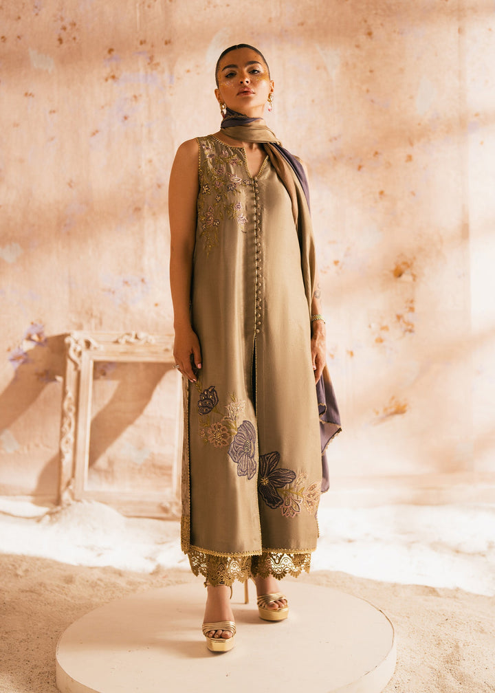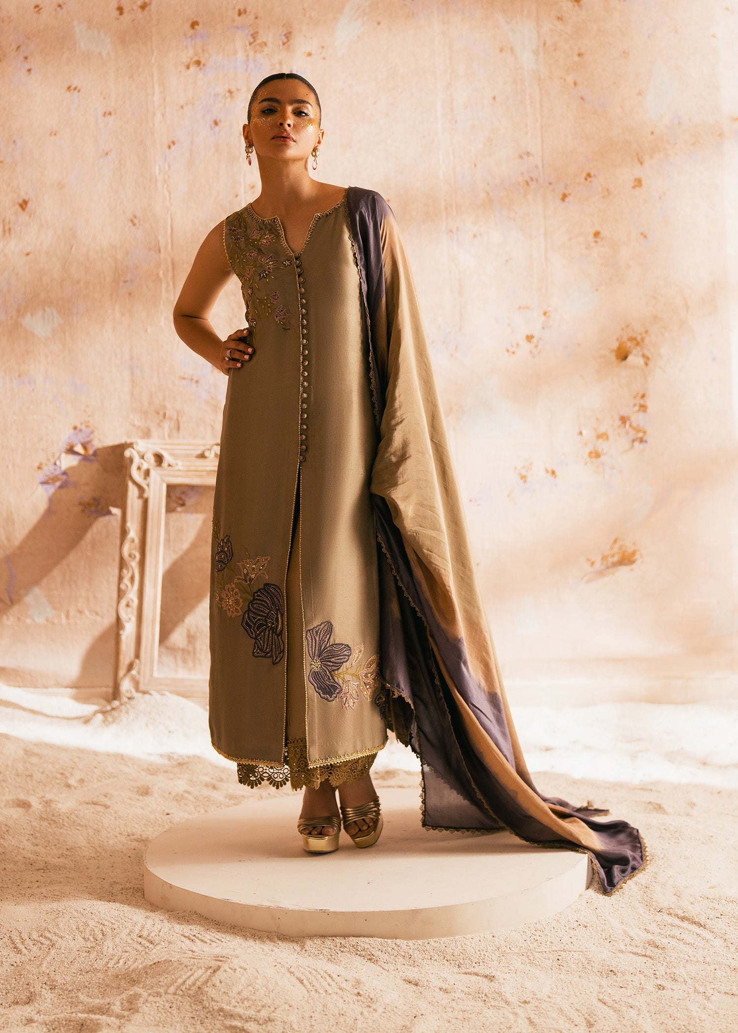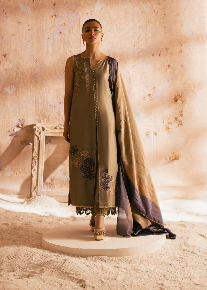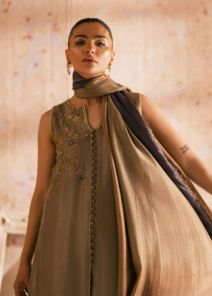 This chic ensemble features a straight-cut shirt with exquisite embroidery, complemented by embellished pants and a hand dyed pure silk dupatta in rich, harmonious tones.