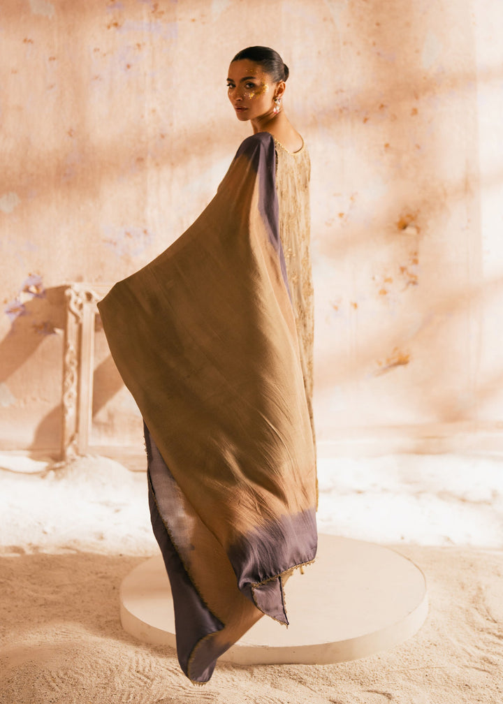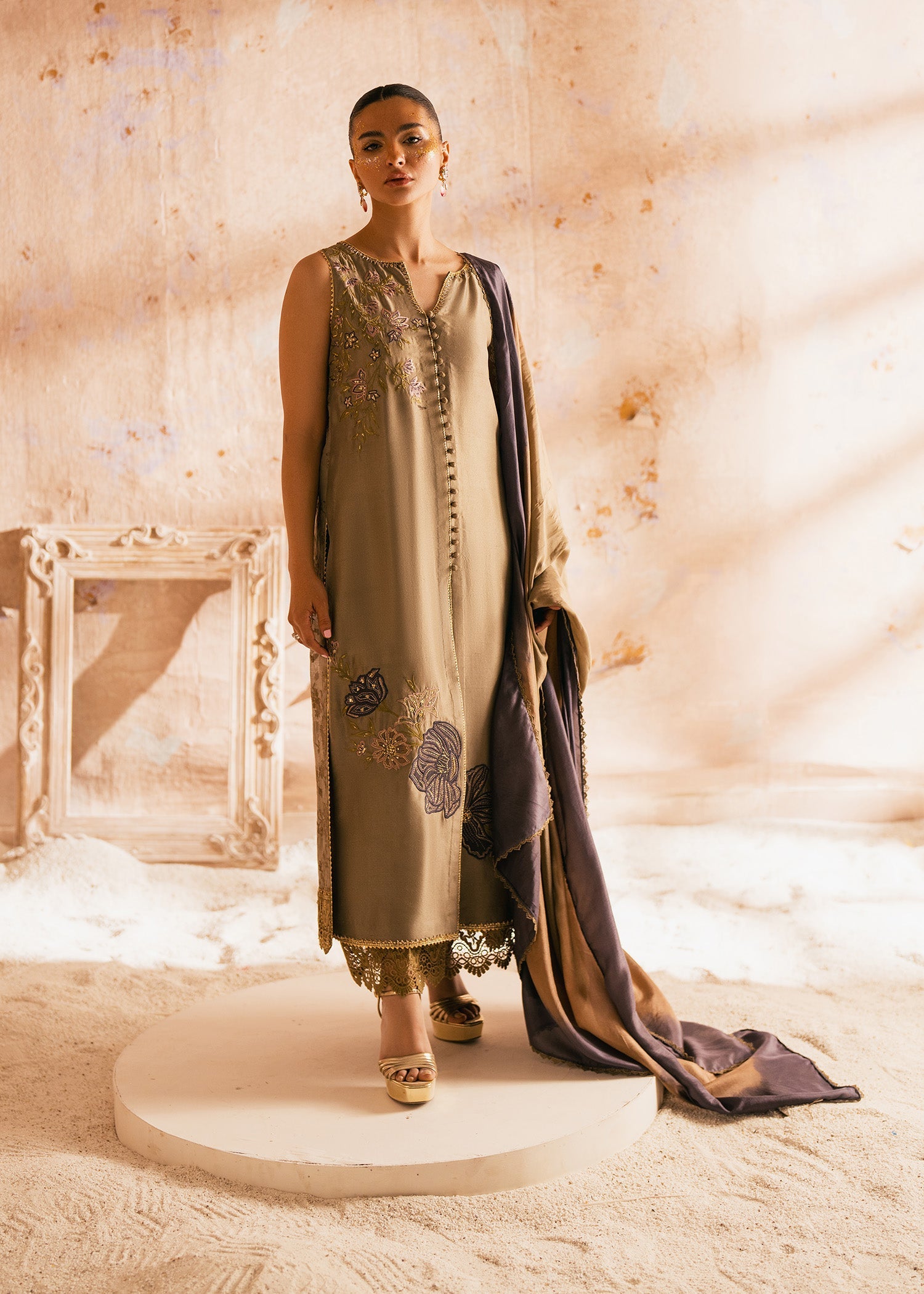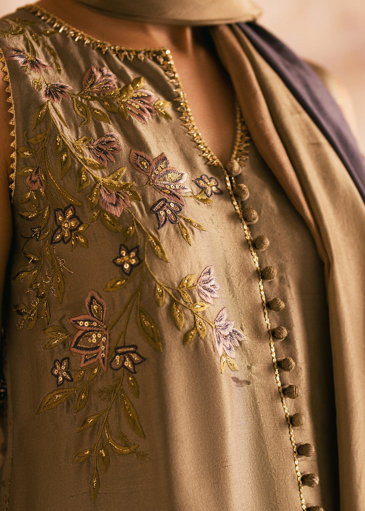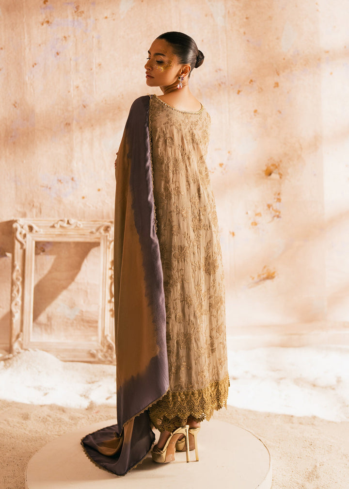 This chic ensemble features a straight-cut shirt with exquisite embroidery, complemented by embellished pants and a hand dyed pure silk dupatta in rich, harmonious tones.