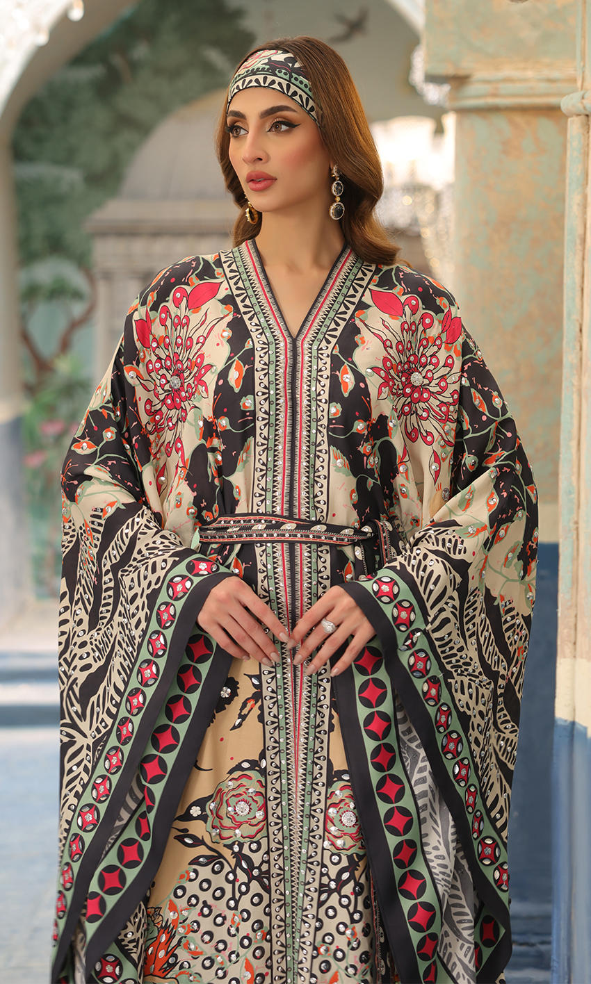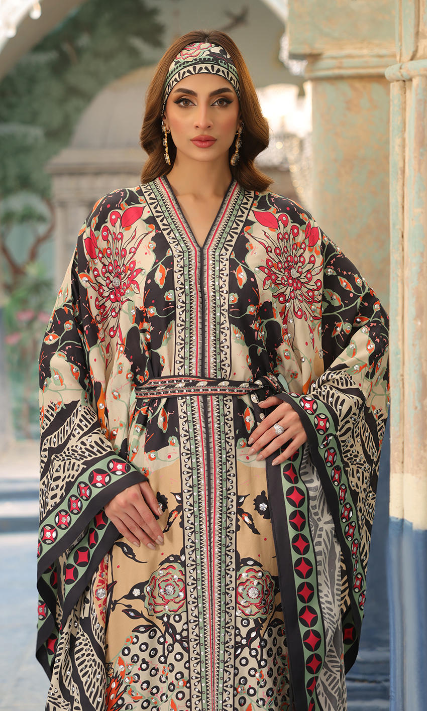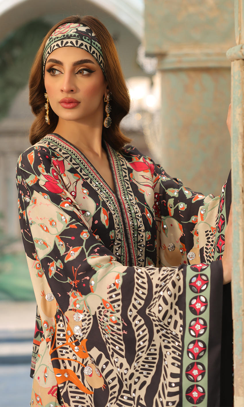 A bold print with uplifting sequin detailing, to make this a statement boho chic look, paired with a scarf and pants.