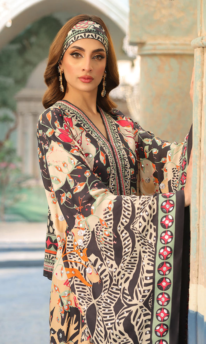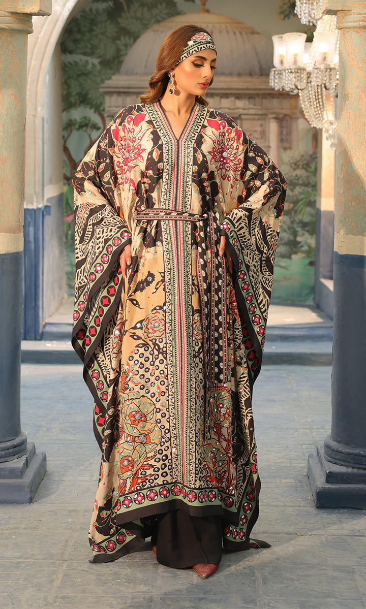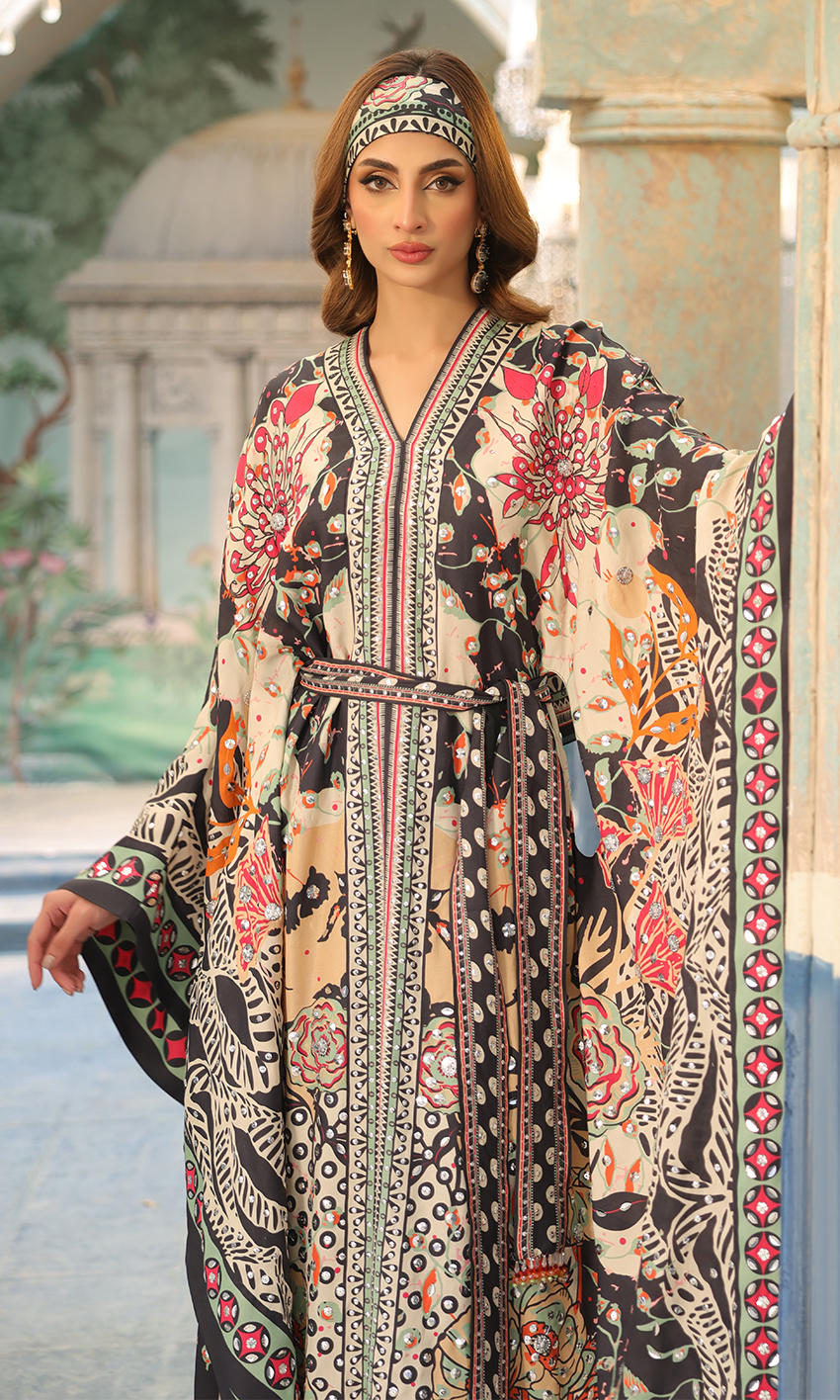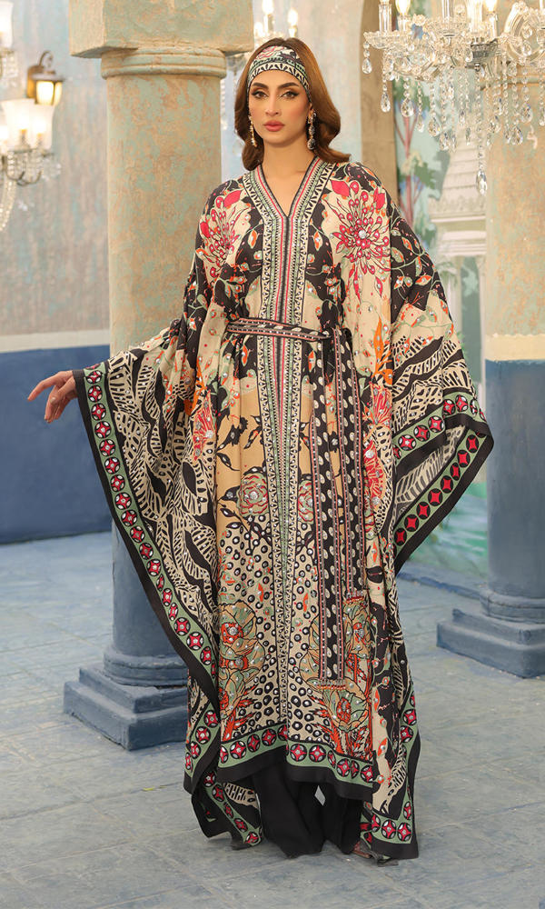 A bold print with uplifting sequin detailing, to make this a statement boho chic look, paired with a scarf and pants.