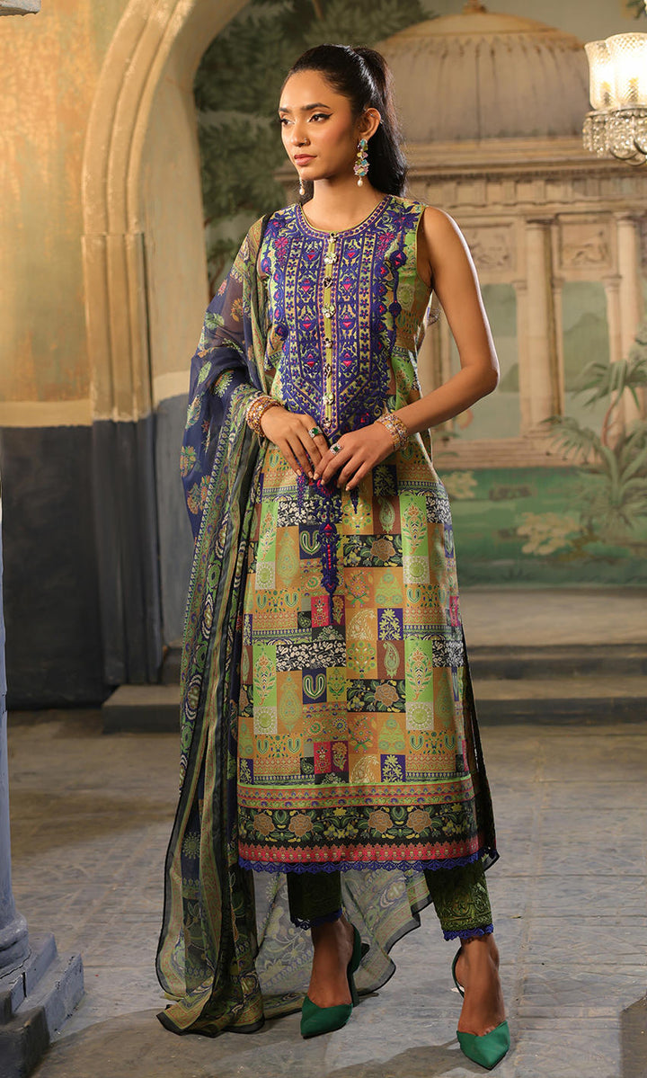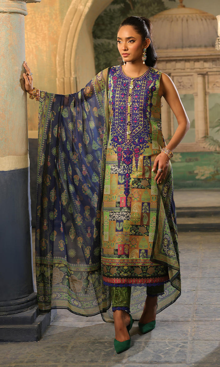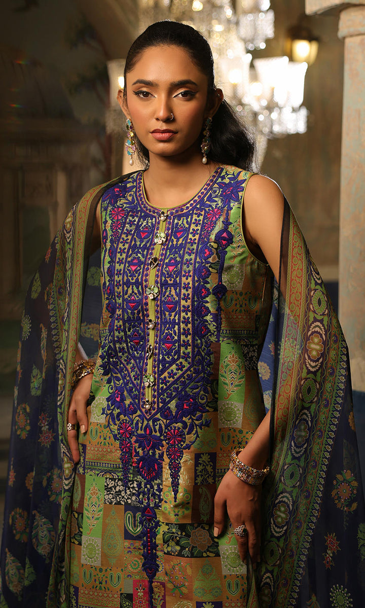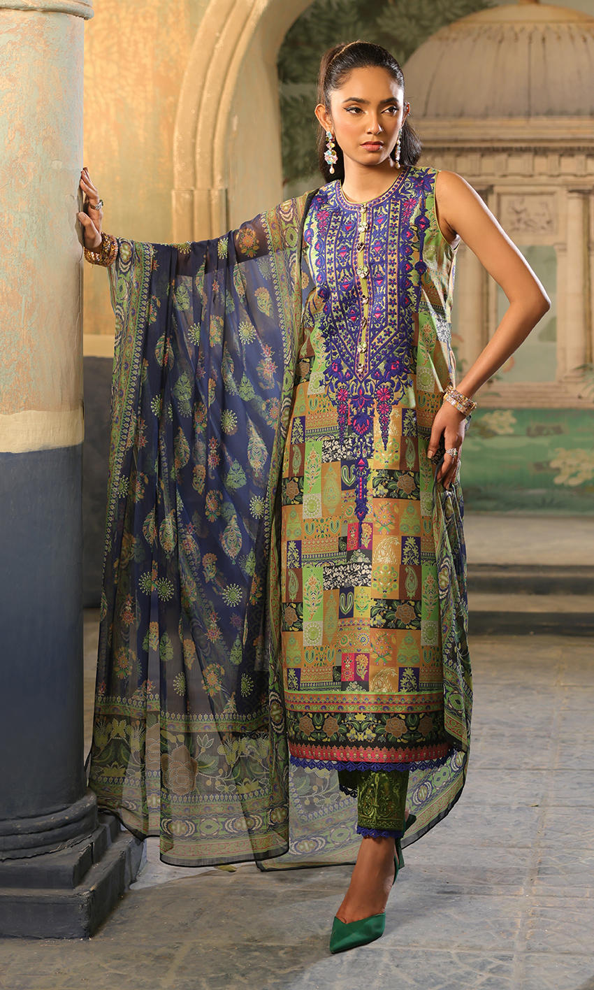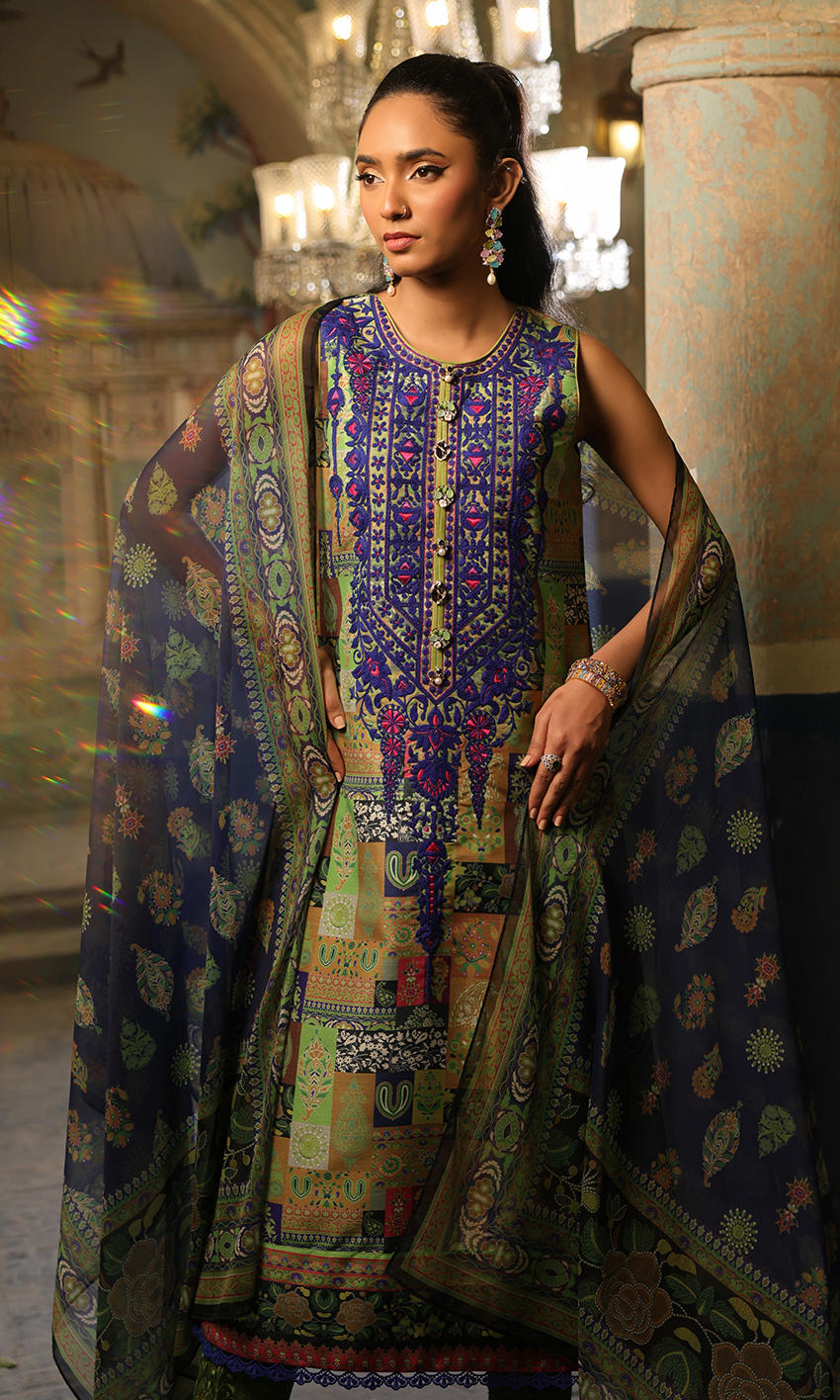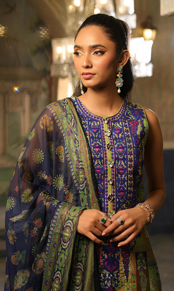 A combination of green, blues and purple with an elaborate embroidered neckline and matching border on pants.