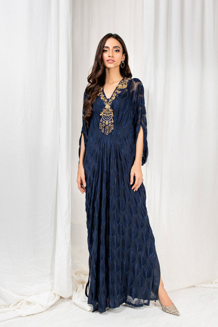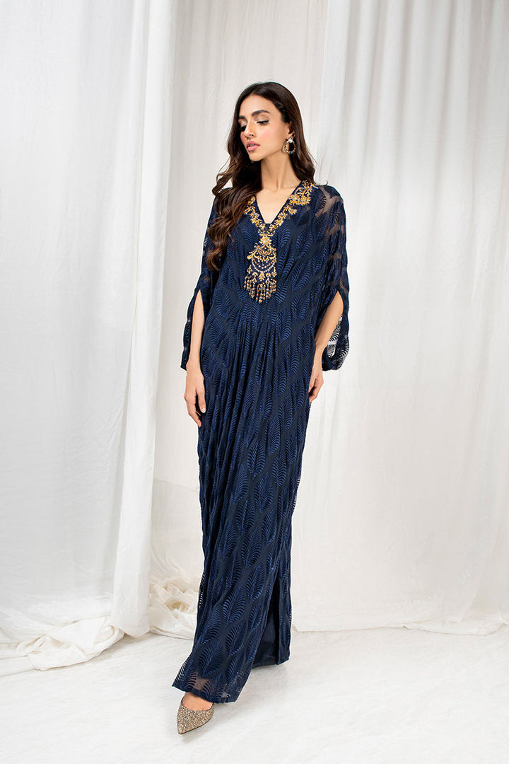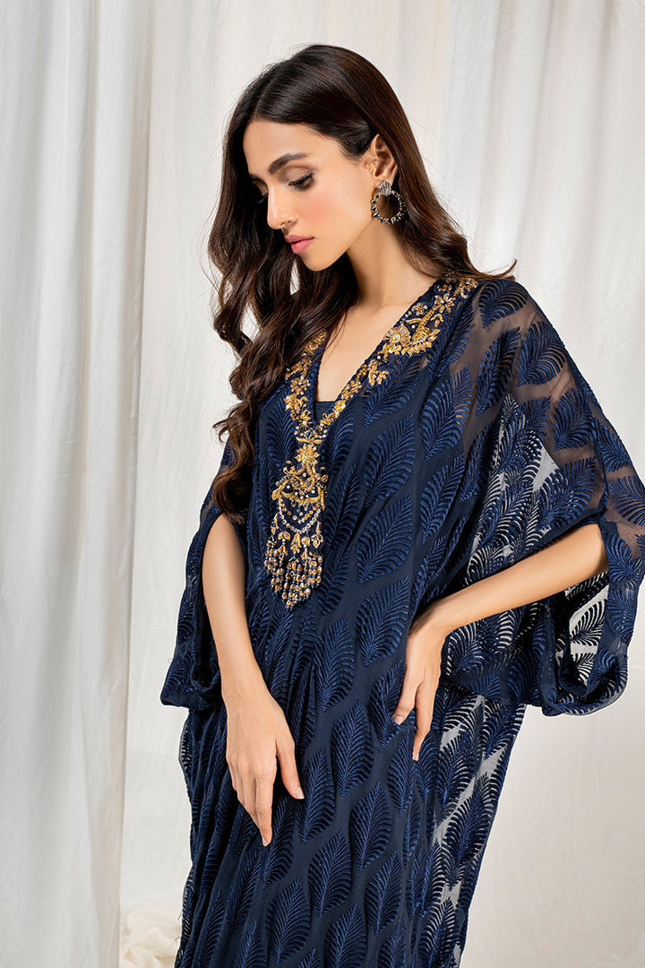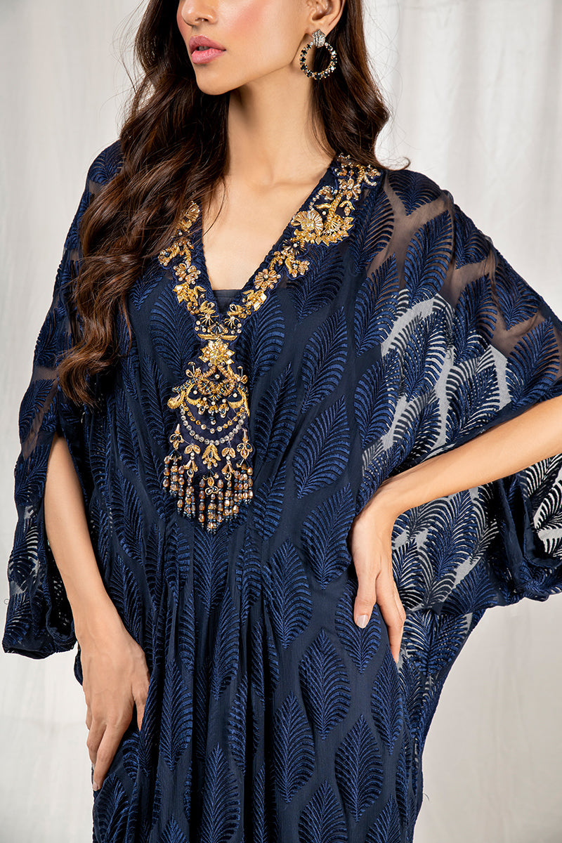 Wear this draped outfit to any event- day or night! The pleated chiffon kaftaan will add some flare to your look as well as keep you cool through the day. The navy blue and golden crystal embellishment on the neck keeps it trendy and formal.