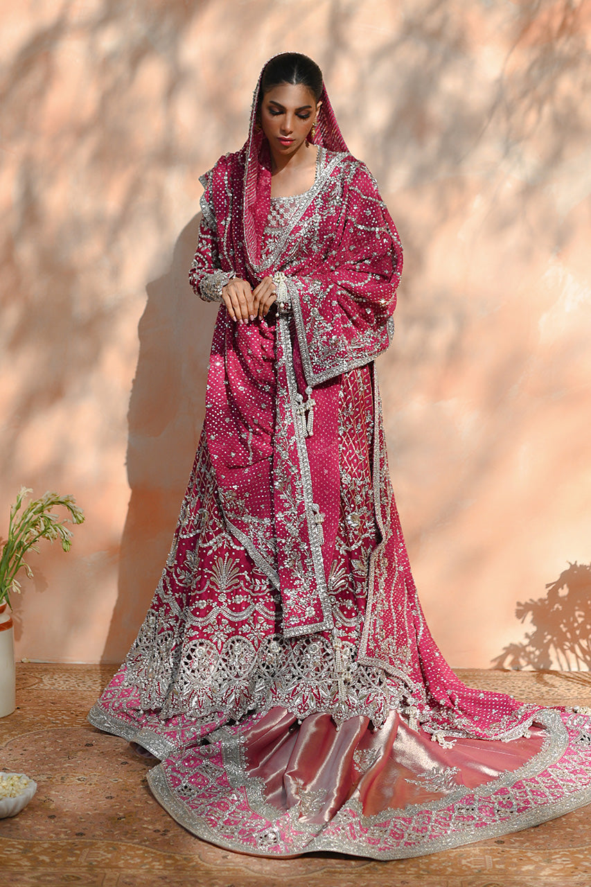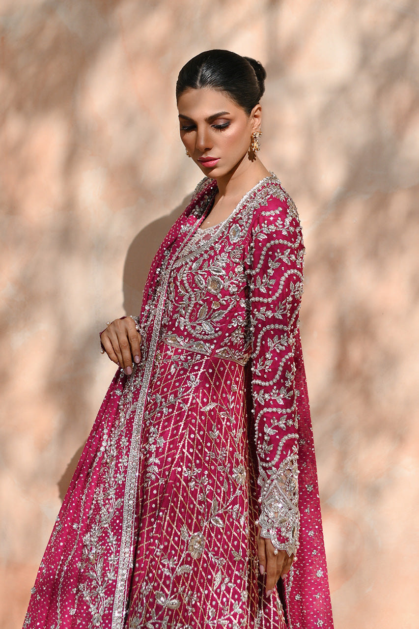 Handcrafted by our master artisans, this bright pink cotton net peshwas is intricately embellished in silver zardoze and sequin work. Cut from tissue, the lehnga is intricately embroidered with glistening details. A heavily embroidered cotton net dupatta with bold silver details completes the look.
