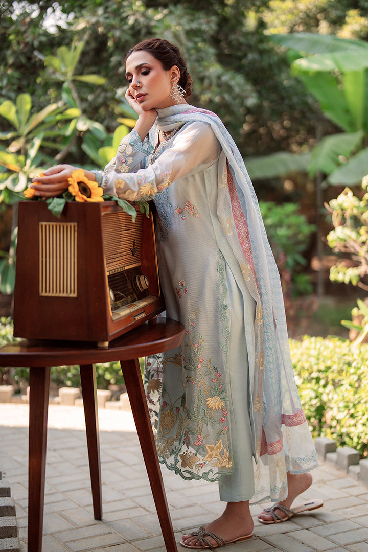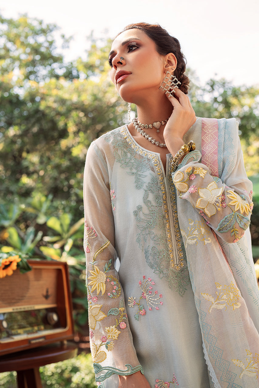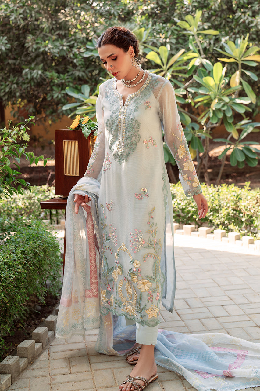 Brimming with signature N|F details & romance, 'Naila' is impossible to resist! Cut from scrumptous silk karandi, this powder blue shirt is aesthetically embroidered in floral blooms! It is paired...