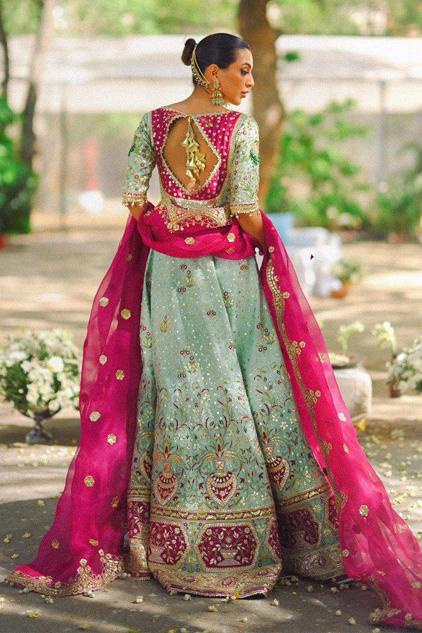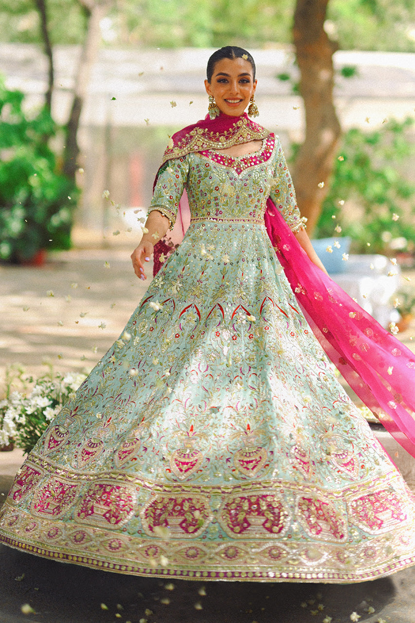 A celadon hued cotton net peshwas is meticulously detailed with zardoze, resham and finished with gota. A fuchsia coloured organza dupatta with scattered gota details and scalloped edges complements the look.