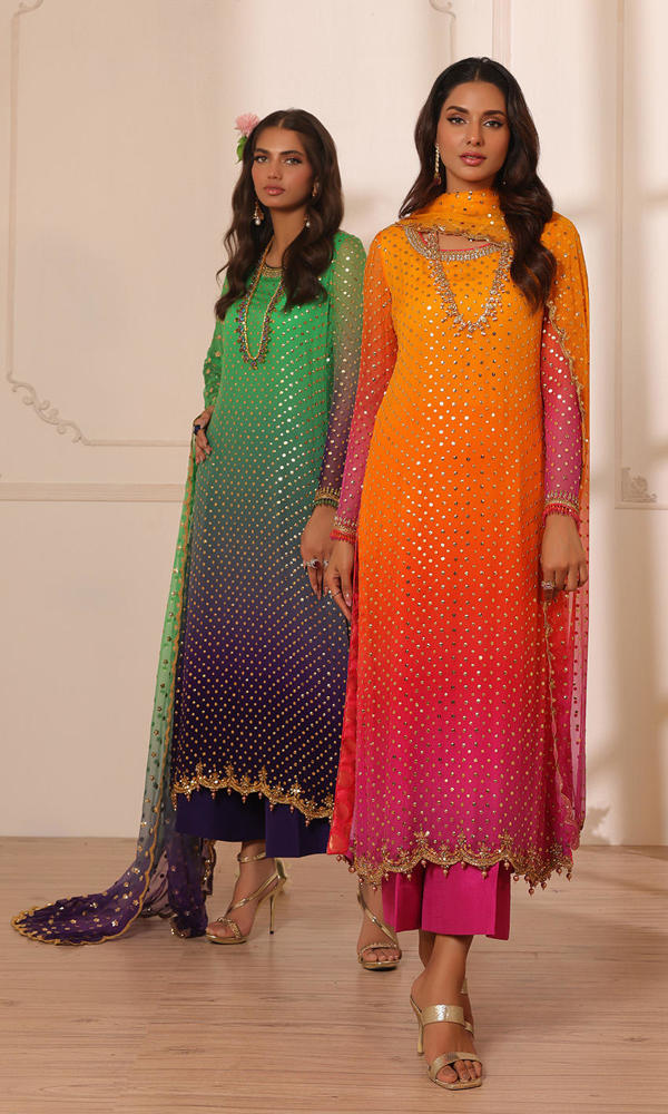 Signature gold sequin work on a shaded based with kundan and crystal detailing on the neckline, sleeves and hem. Paired with a scalloped sequins chiffon dupatta and straight raw silk...