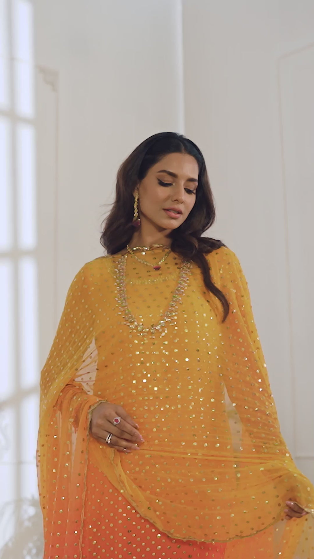 Signature gold sequin work on a shaded based with kundan and crystal detailing on the neckline, sleeves and hem. Paired with a scalloped sequins chiffon dupatta and straight raw silk pants.