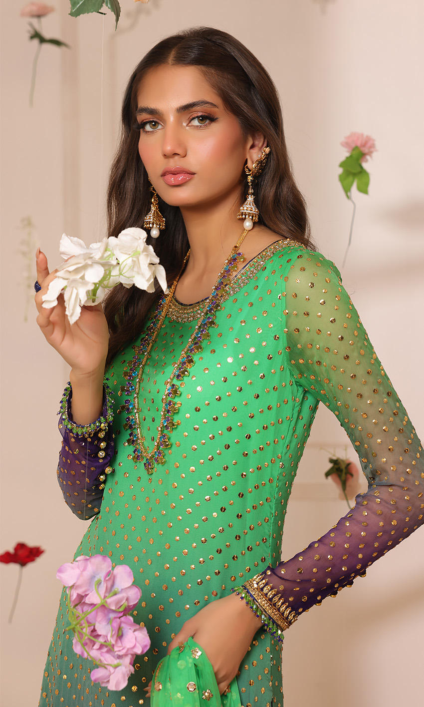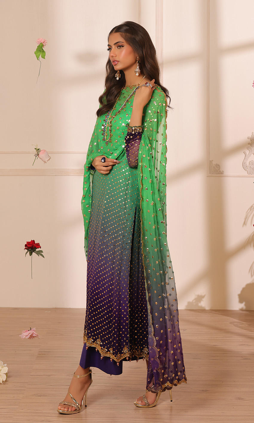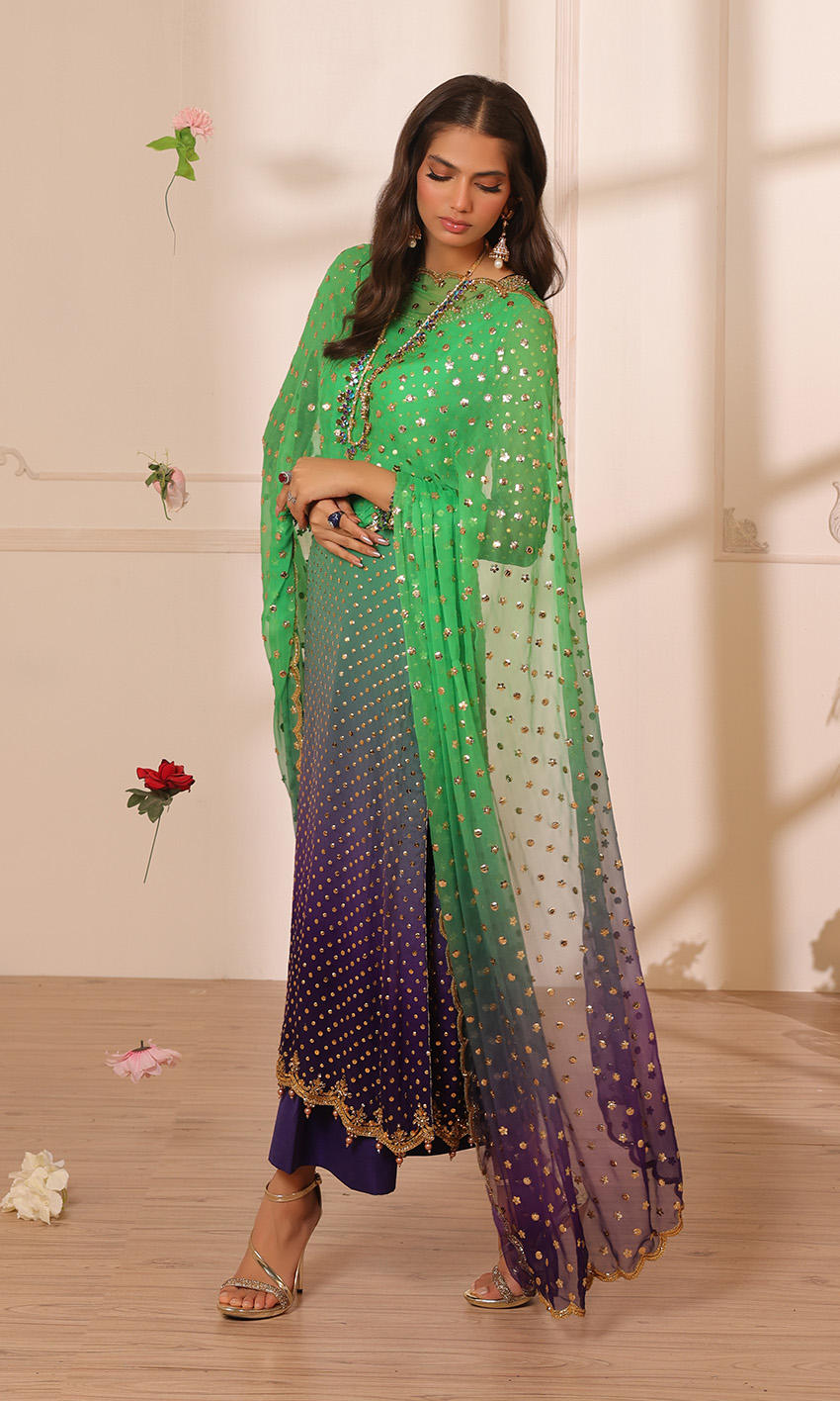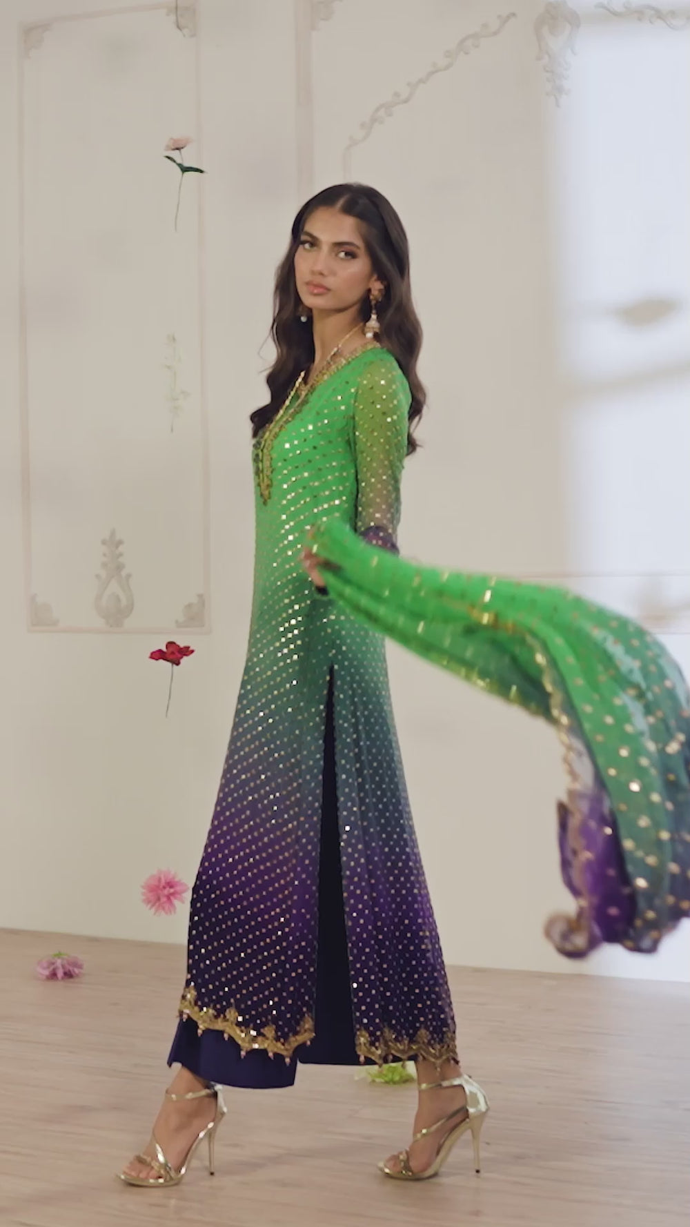 Signature gold sequin work on a shaded based with kundan and crystal detailing on the neckline, sleeves and hem. Paired with a scalloped sequins chiffon dupatta and straight raw silk pants.