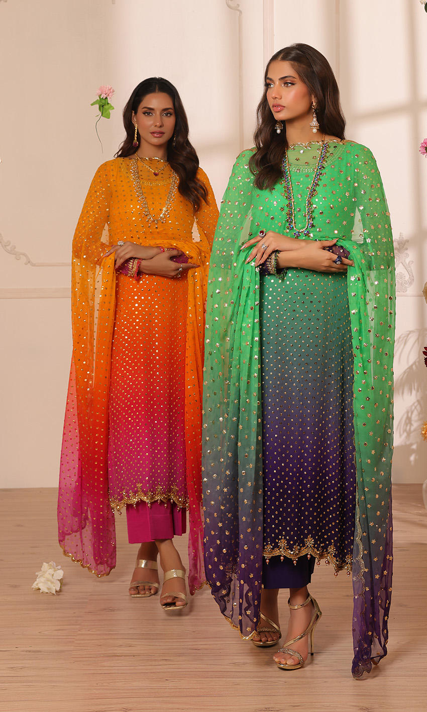 Signature gold sequin work on a shaded based with kundan and crystal detailing on the neckline, sleeves and hem. Paired with a scalloped sequins chiffon dupatta and straight raw silk...