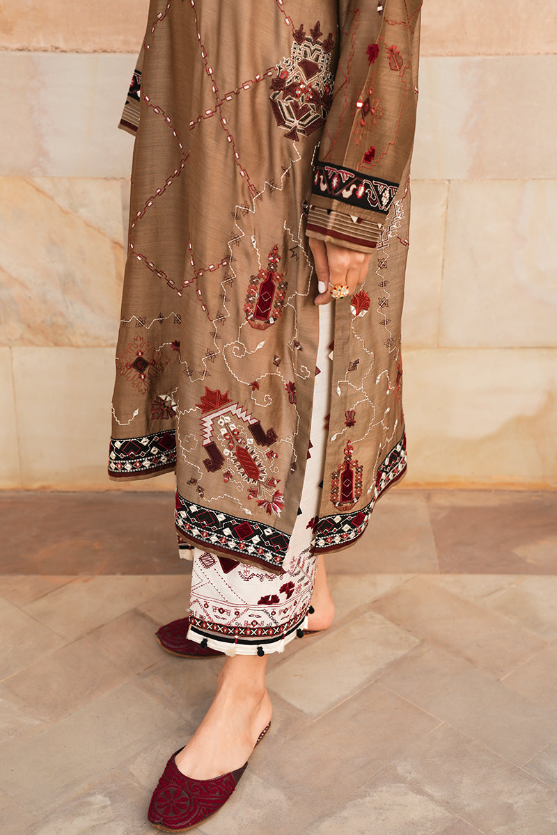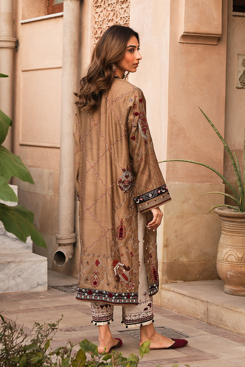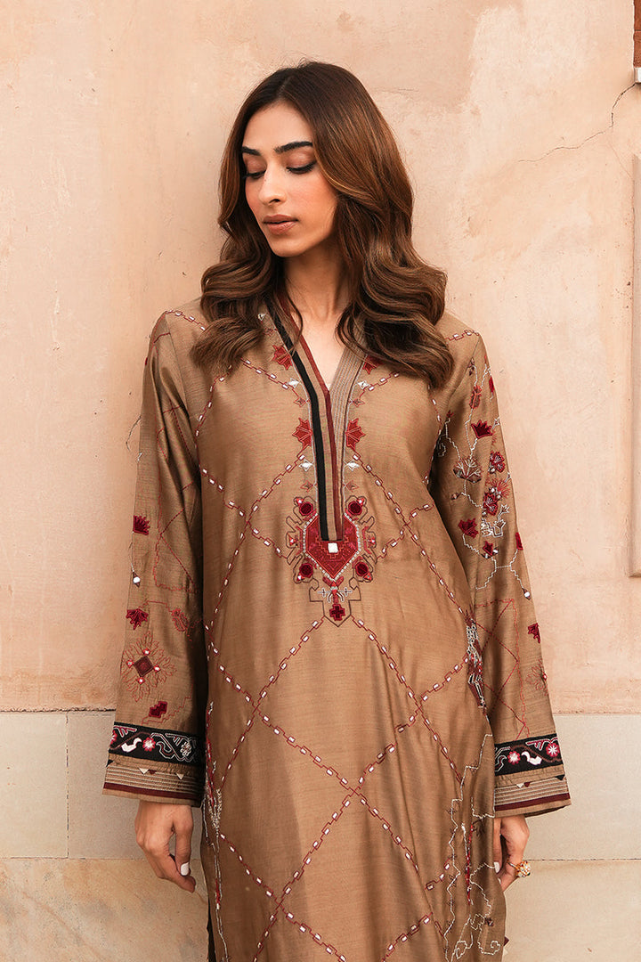 A celebration of intricate craftsmanship, the Nargis outfit features a khadi silk shirt adorned with applique work, mirror embellishments, and resham machine embroidery. Organza and staple cotton appliques, along with delicate corn details, enhance the sleeves and side chok. Pleats and pintucks on the sleeves add a touch of texture. The khadi silk izaar is embellished with resham embroidery, applique work, and mirror accents, elevated by velvet balls and tassel hangings for a statement finish.