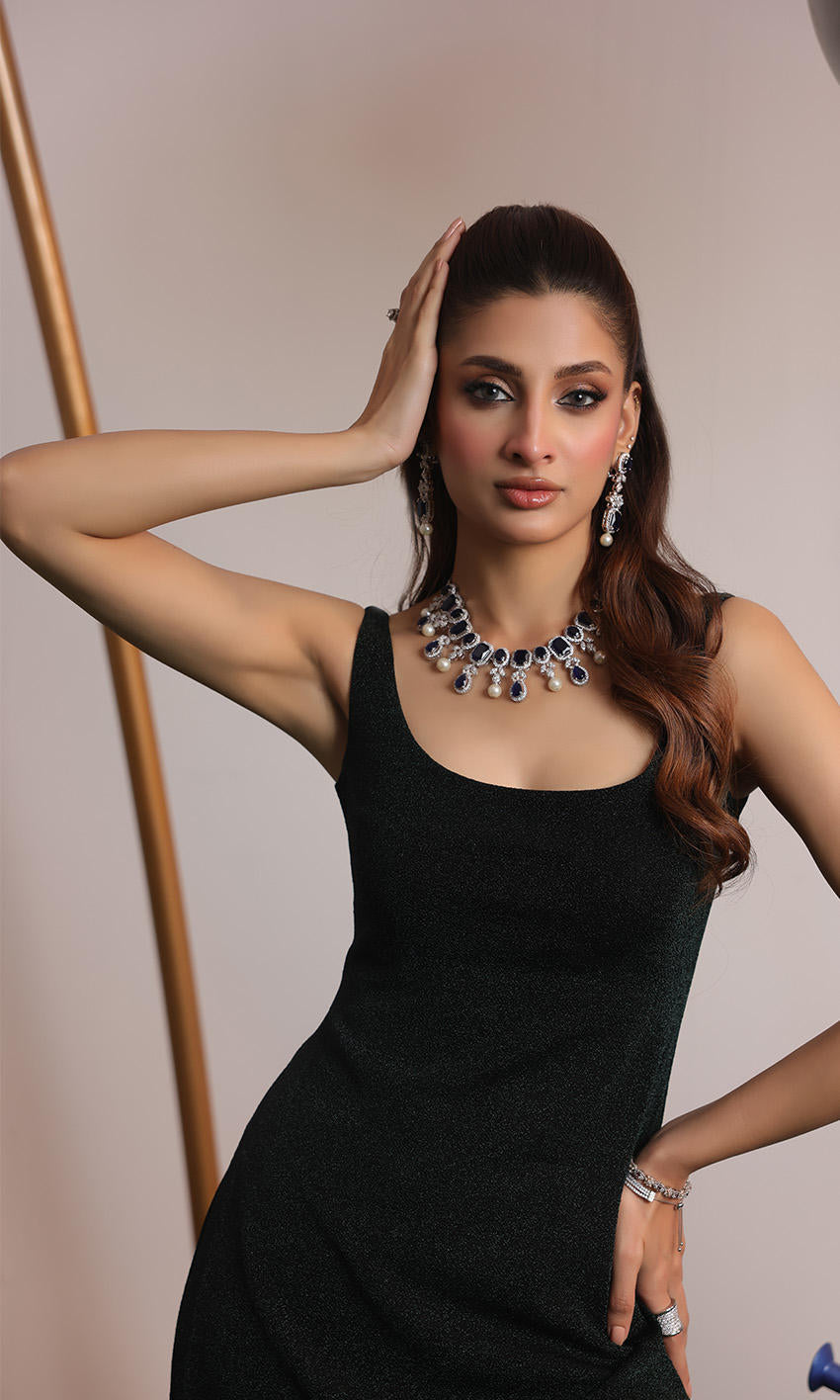 Exude elegance in a stunning two-piece moonlight contemporary silhouette, featuring flared pants rendered in a captivating bottle green color.