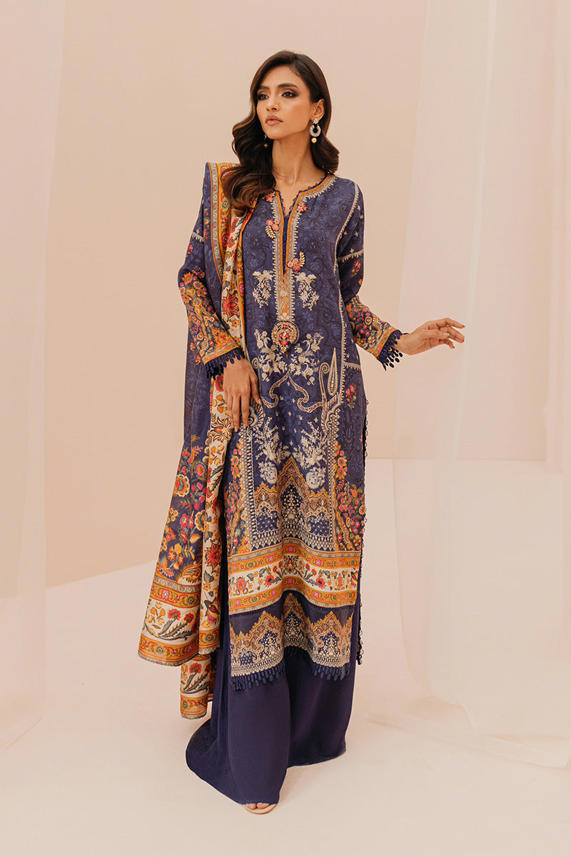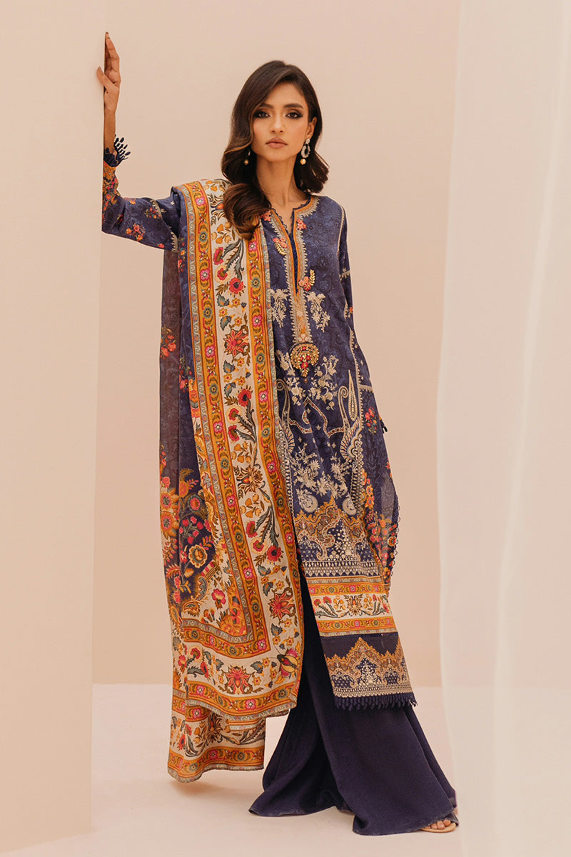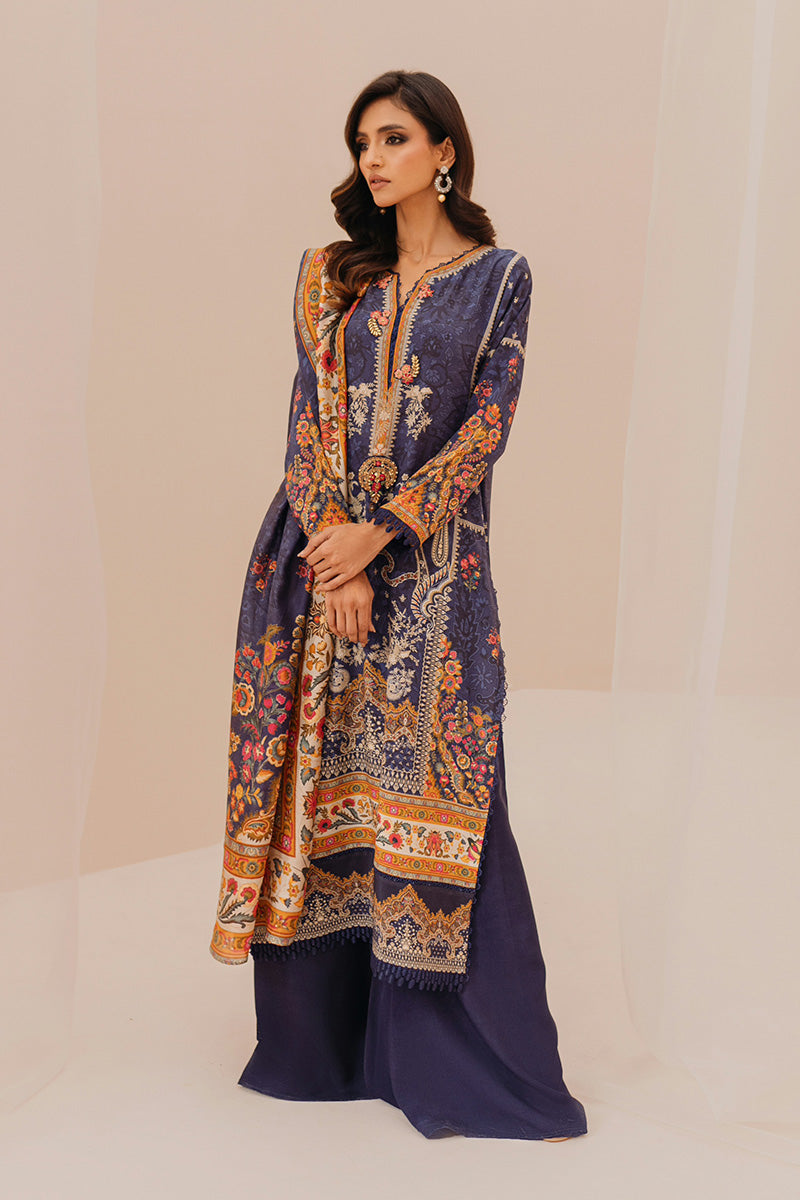 Our signature Mina Hasan digital print kurtas come back in a straight silhouettes and striking colors! Choose this navy blue option for effortless elegance ! Comes with hand worked button details and feminine lace edgings. Shirt and Dupatta are included, pants are optional.