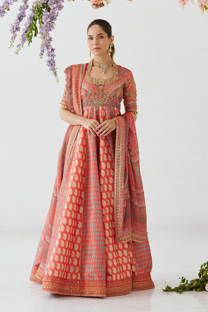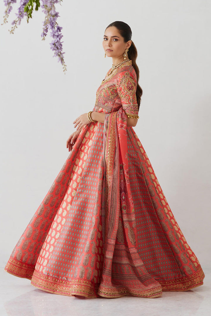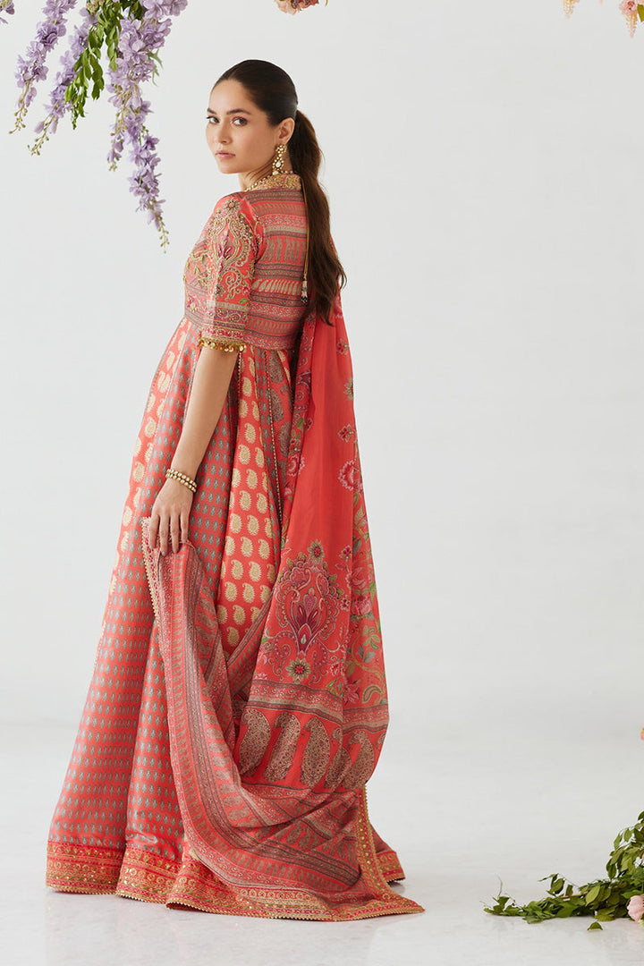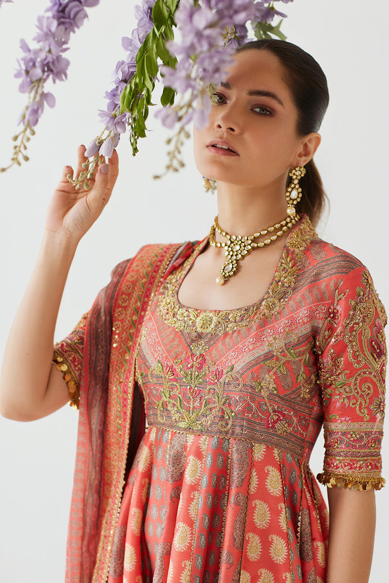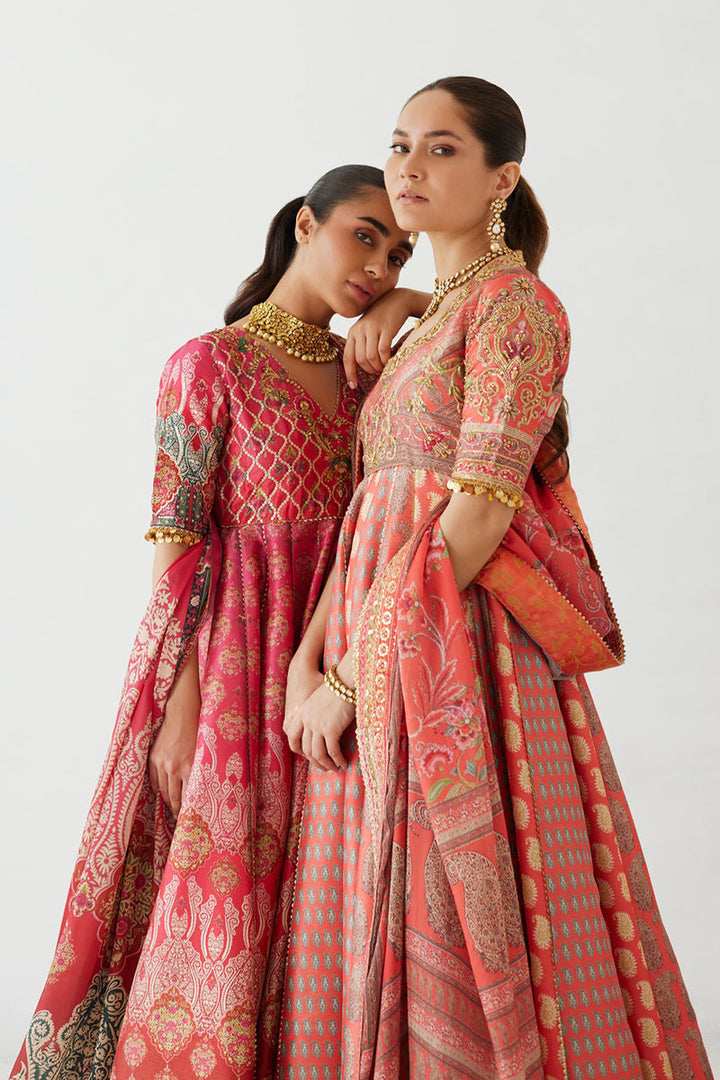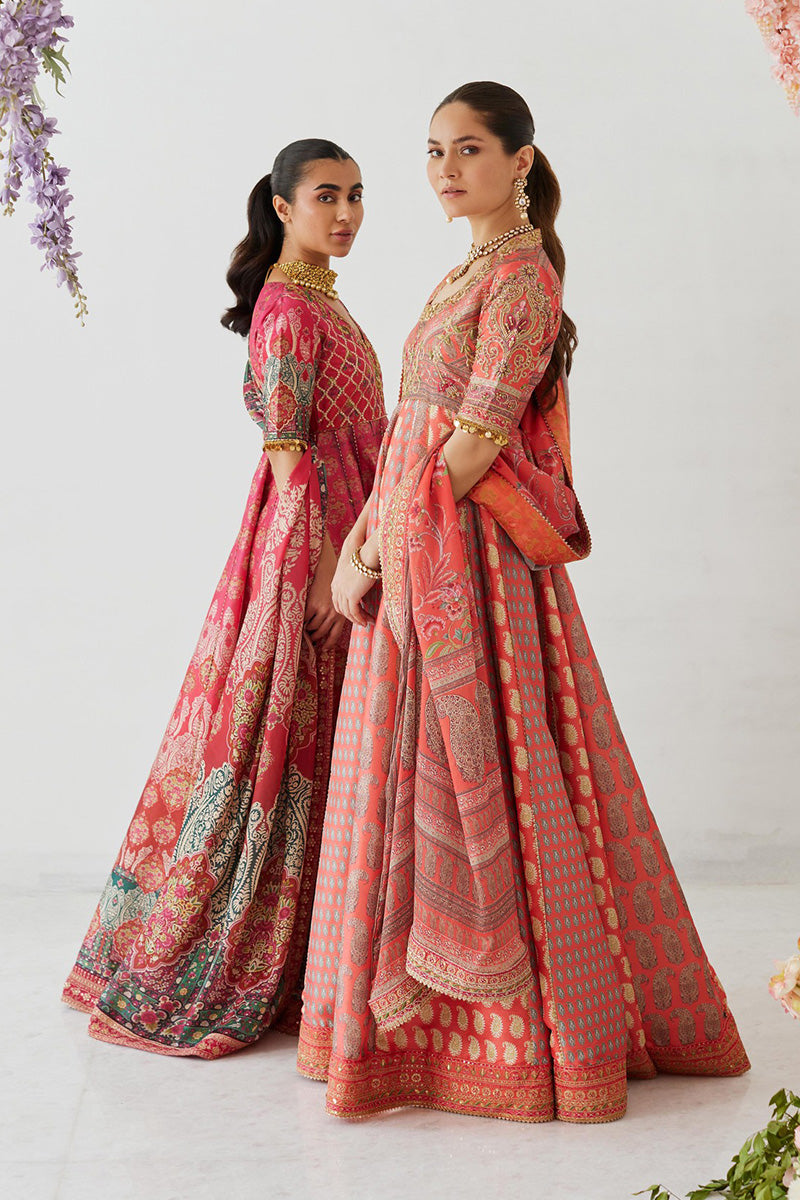Classic and elegant, this signature Mina Hasan printed pishwas is striking and beautiful with a zardozi hand embellished neckline and sleeves and embroidered border on the flare and dupatta. The outfit is completed with an organza dupatta.The outfit includes a dupatta, pishwas and pants.