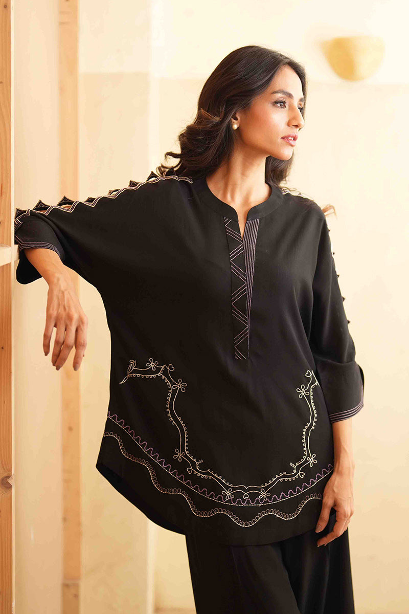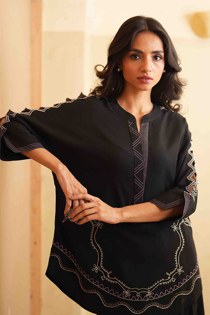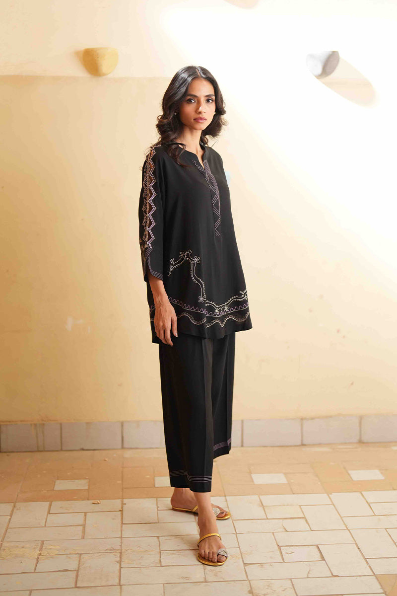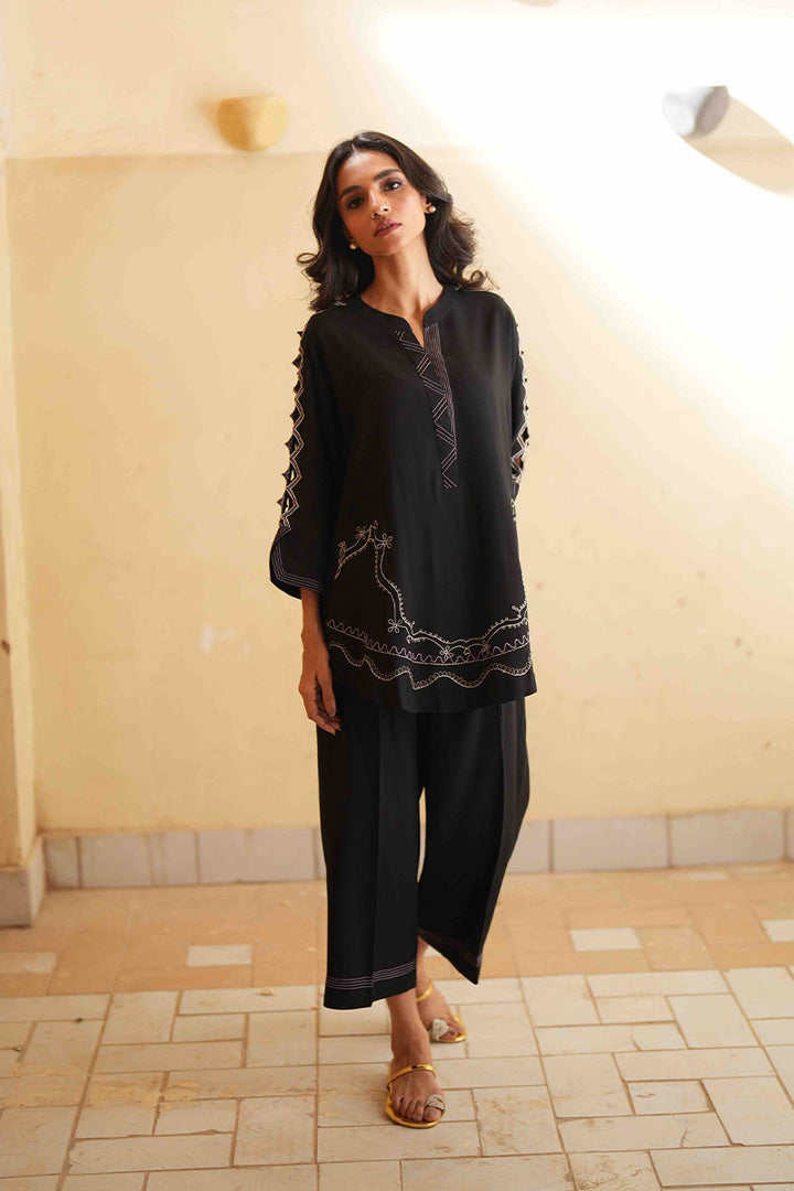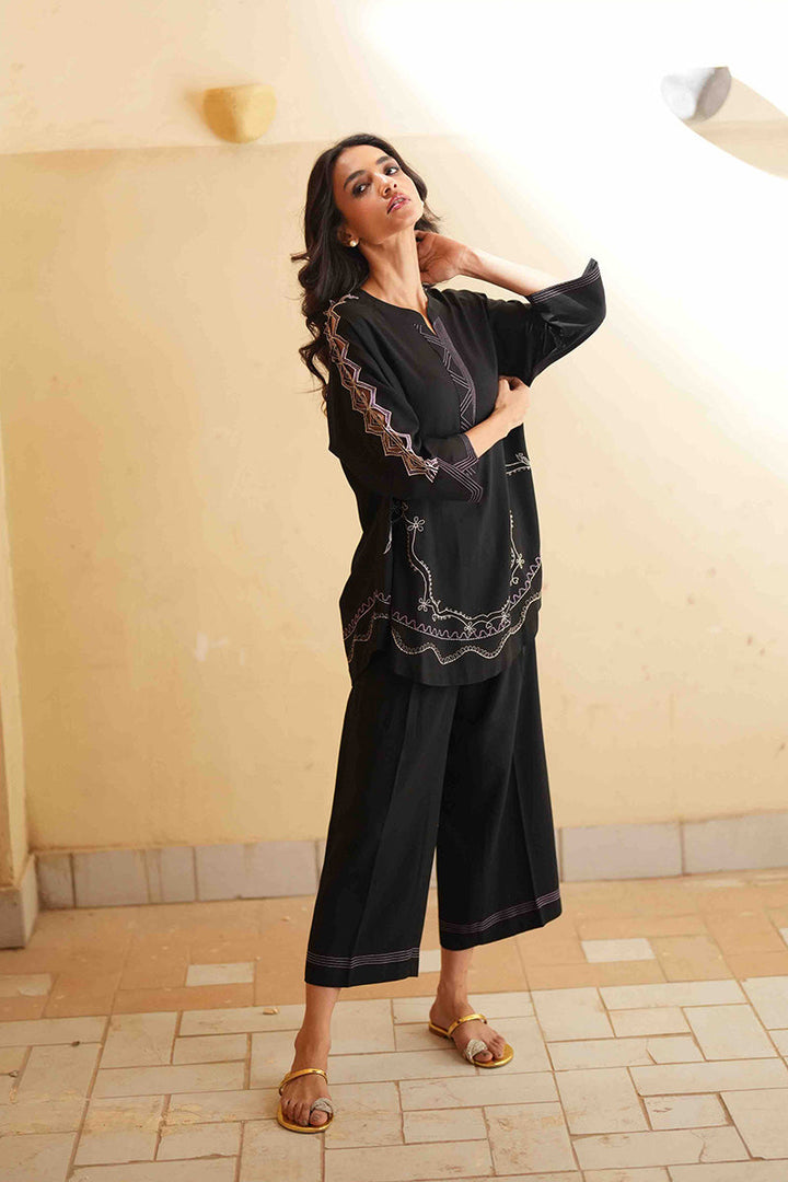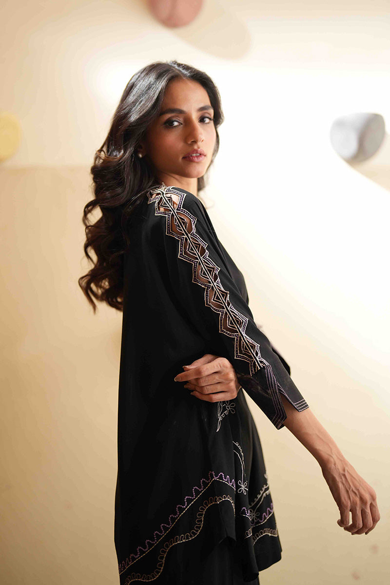 This stunning Black Kimono co-ord set is a masterpiece of elegance and sophistication. Crafted from luxurious Marina fabric, the classic kimono cut flows beautifully, while the intricate machine embroidery, resham...