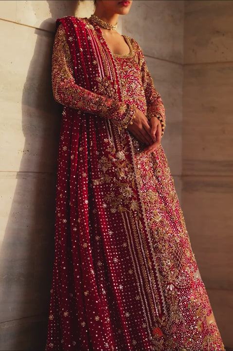 An opulent bridal kalidaar in deep garnet, layered with velvet and net, featuring zardoze, tilla, and resham embroidery in gold and antique silver. Paired with an oxblood chiffon dupatta and...