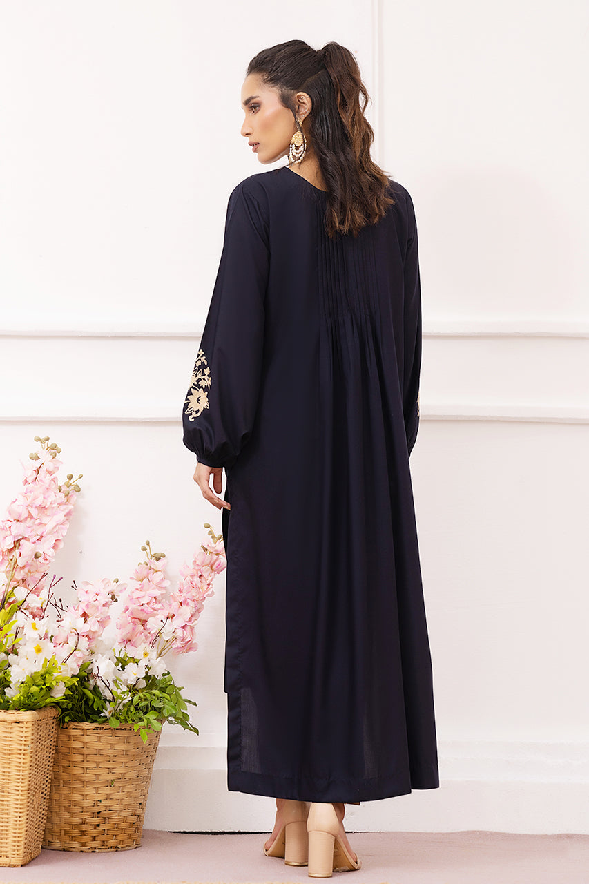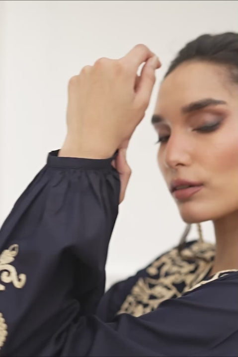 Unveiling a symphony in blue: our newest ensemble elegantly crafted from pure, wrinkle-free cotton. This two-piece dazzles with its precision ari embroidery. Flowing pleats cascade gracefully down the back, whilethe lantern sleeves, embellished with delicate embroidered motifs, amplify its opulence. Paired with chic slit pants, this outfit transcends fleeting trends, serving as a quintessential testament to luxury and refined sophistication.