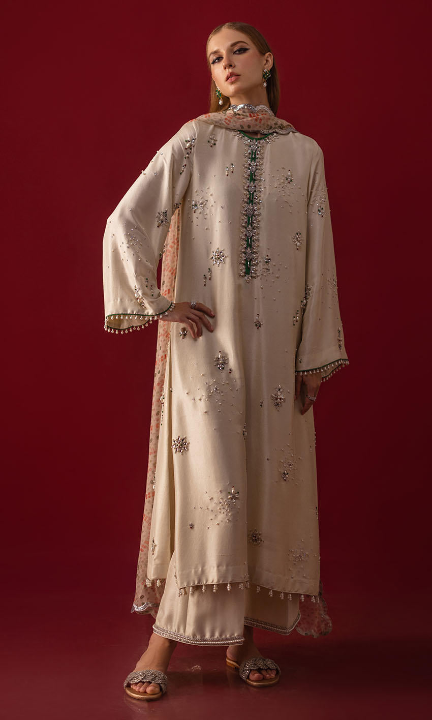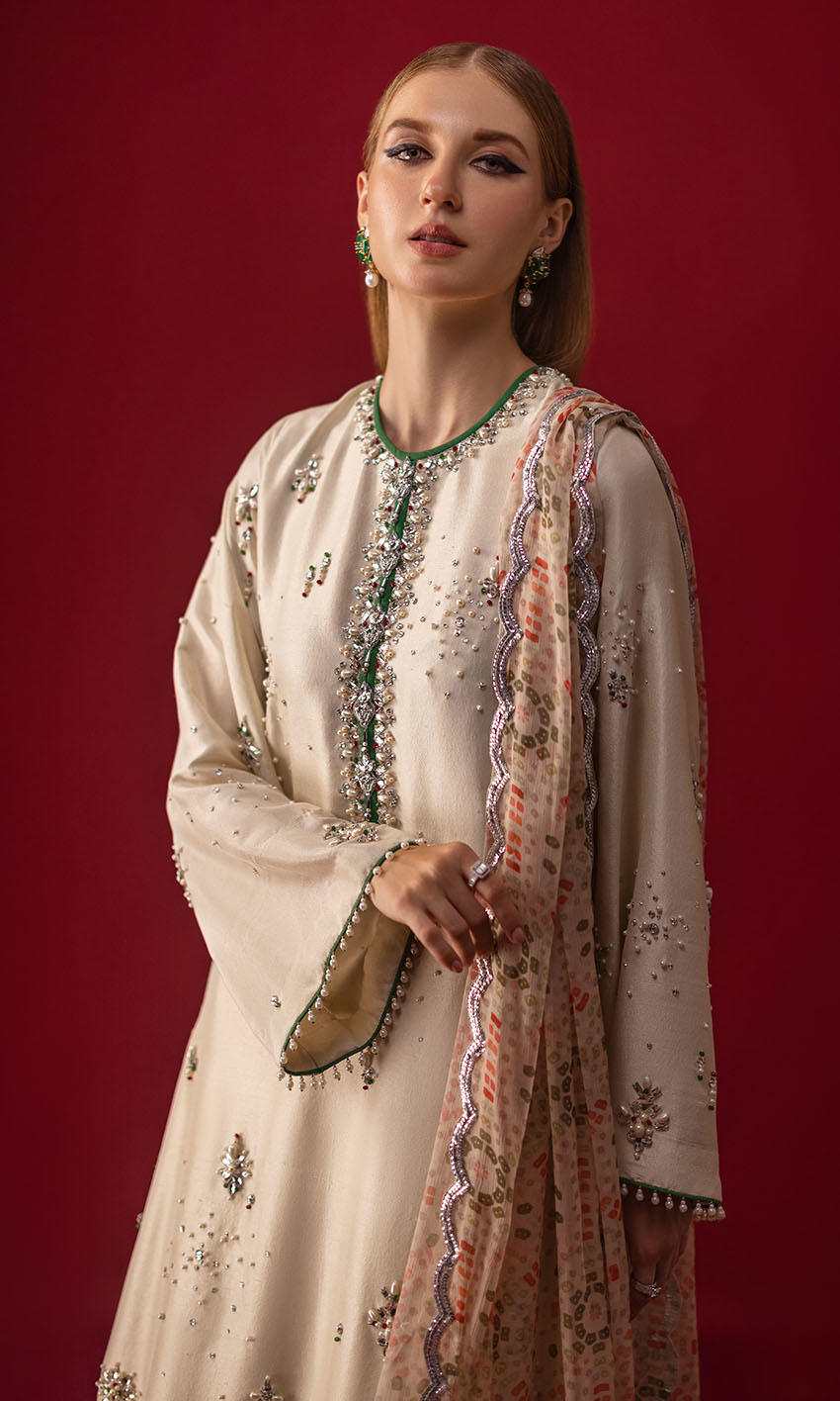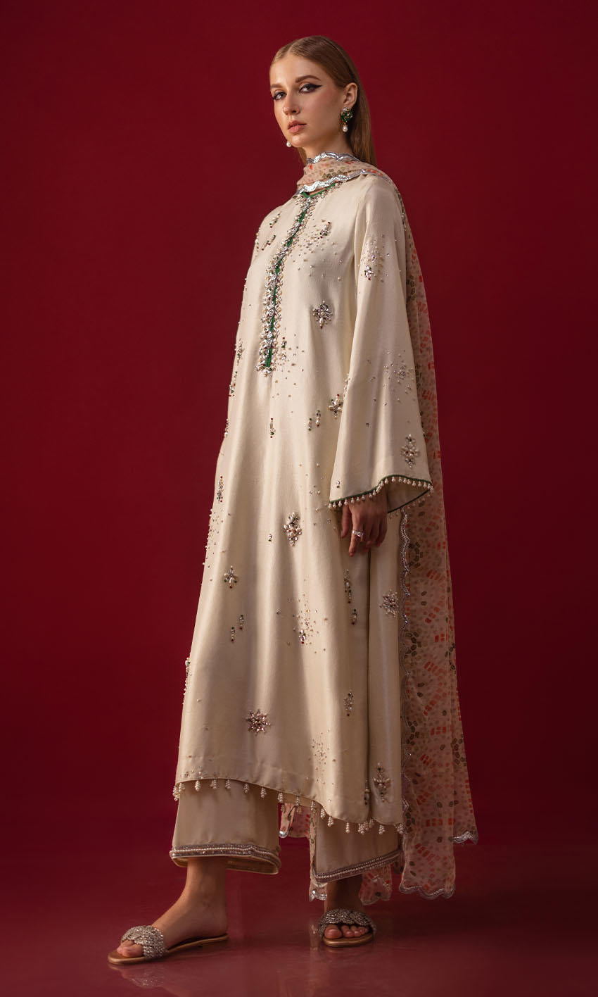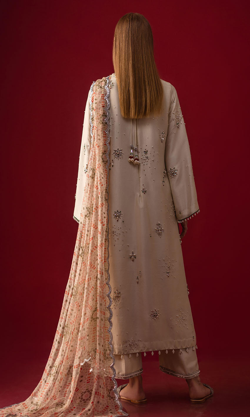 Exquisite raw silk shirt featuring an intricately embellished neckline and delicate handwork detailing. Paired with raw silk pants with a sequin border and a beautiful printed chiffon dupatta with a sequin scallop border, adding a touch of luxury and sophistication.