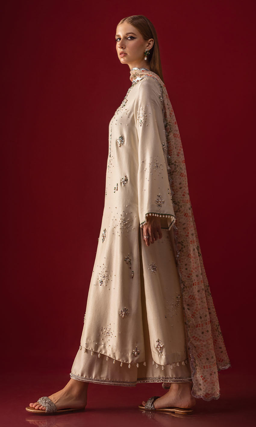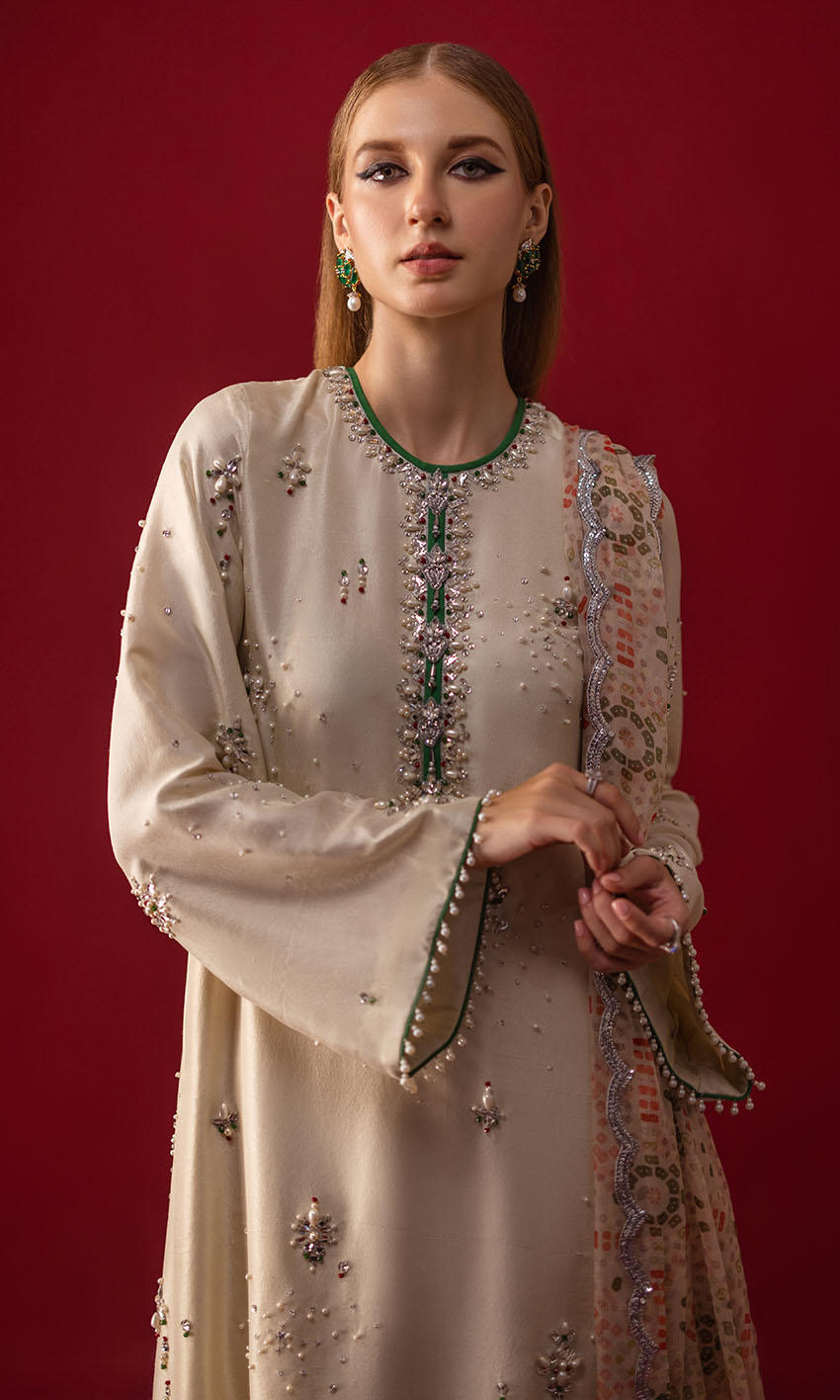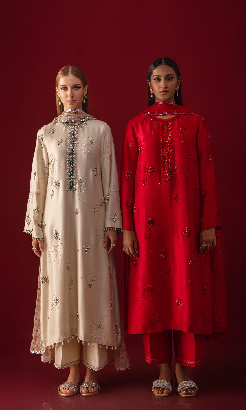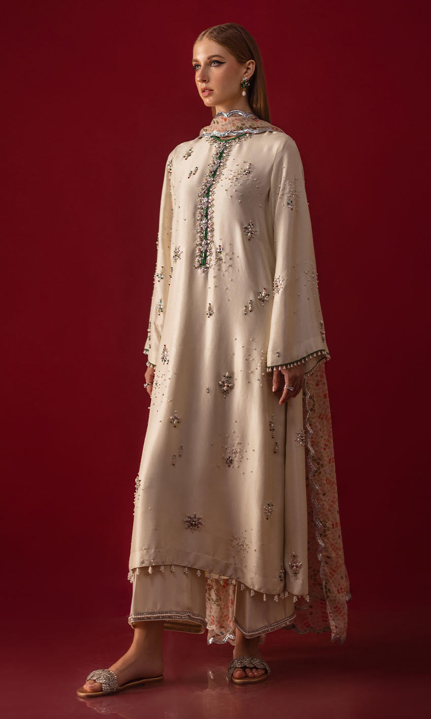 Exquisite raw silk shirt featuring an intricately embellished neckline and delicate handwork detailing. Paired with raw silk pants with a sequin border and a beautiful printed chiffon dupatta with a sequin scallop border, adding a touch of luxury and sophistication.