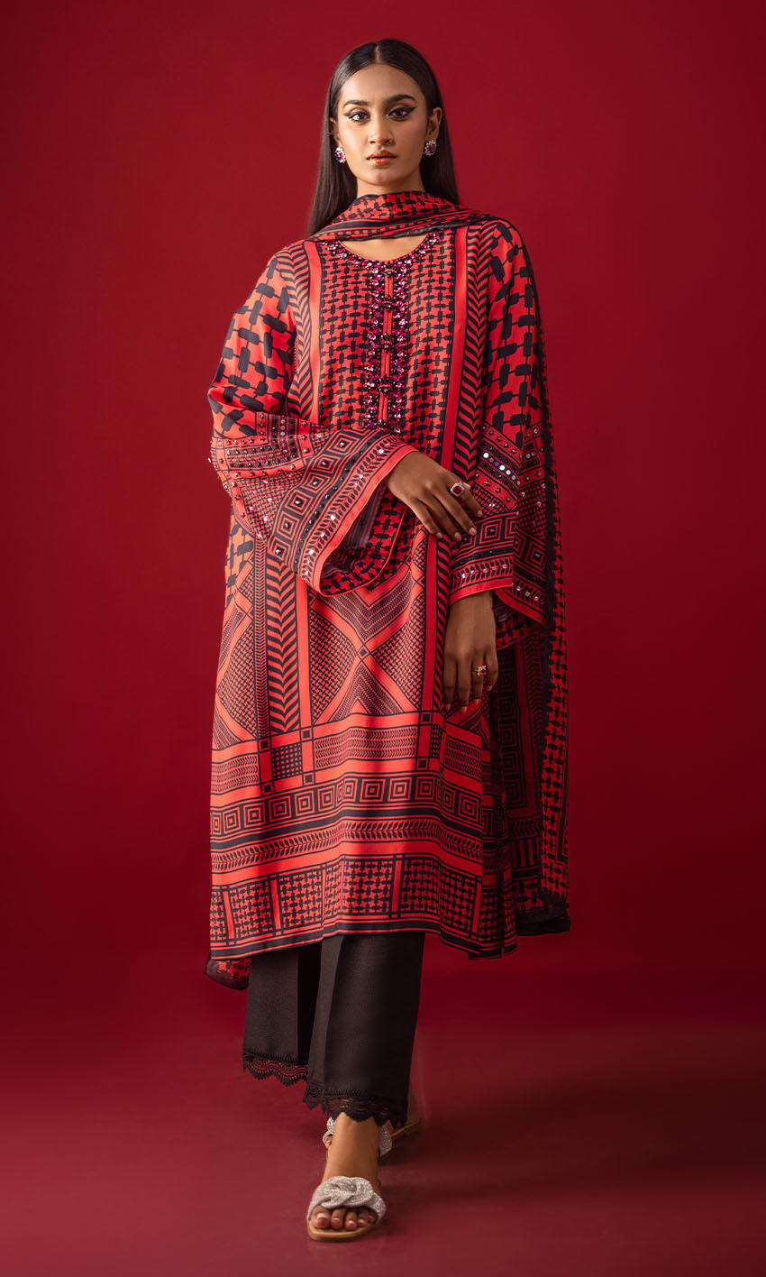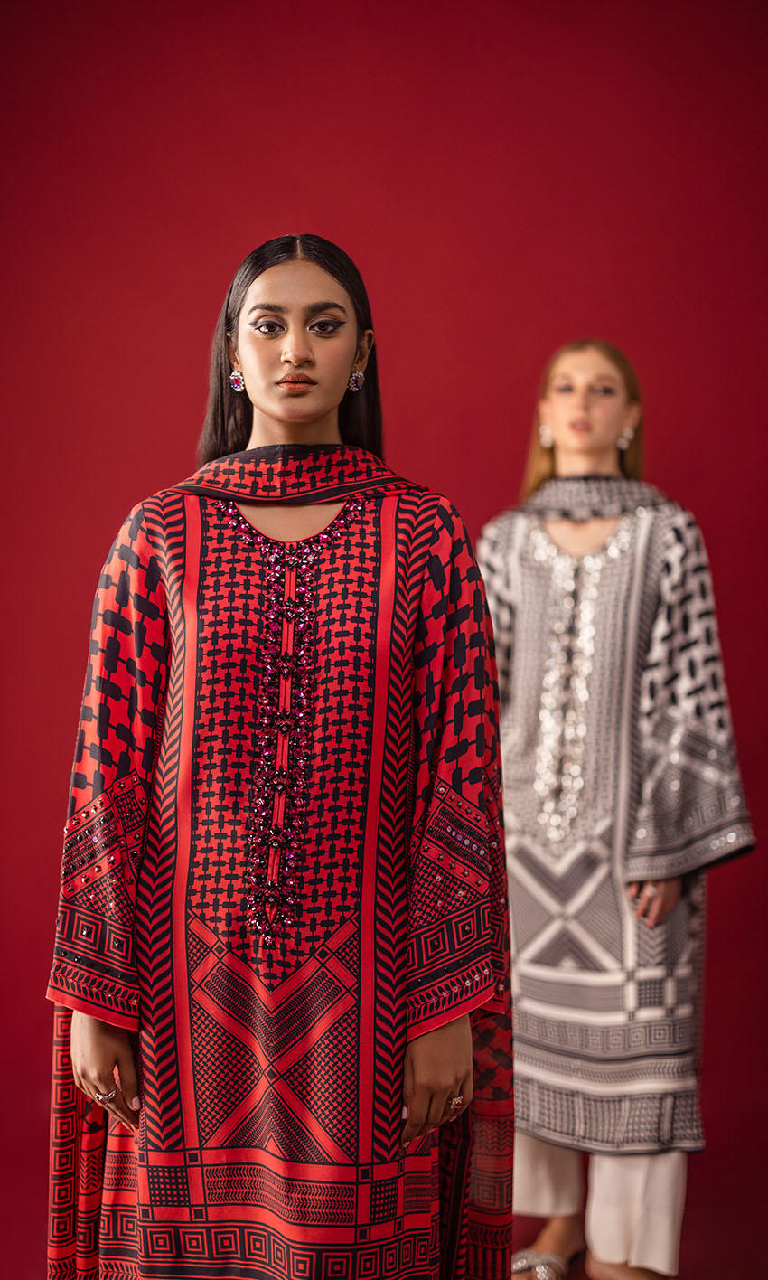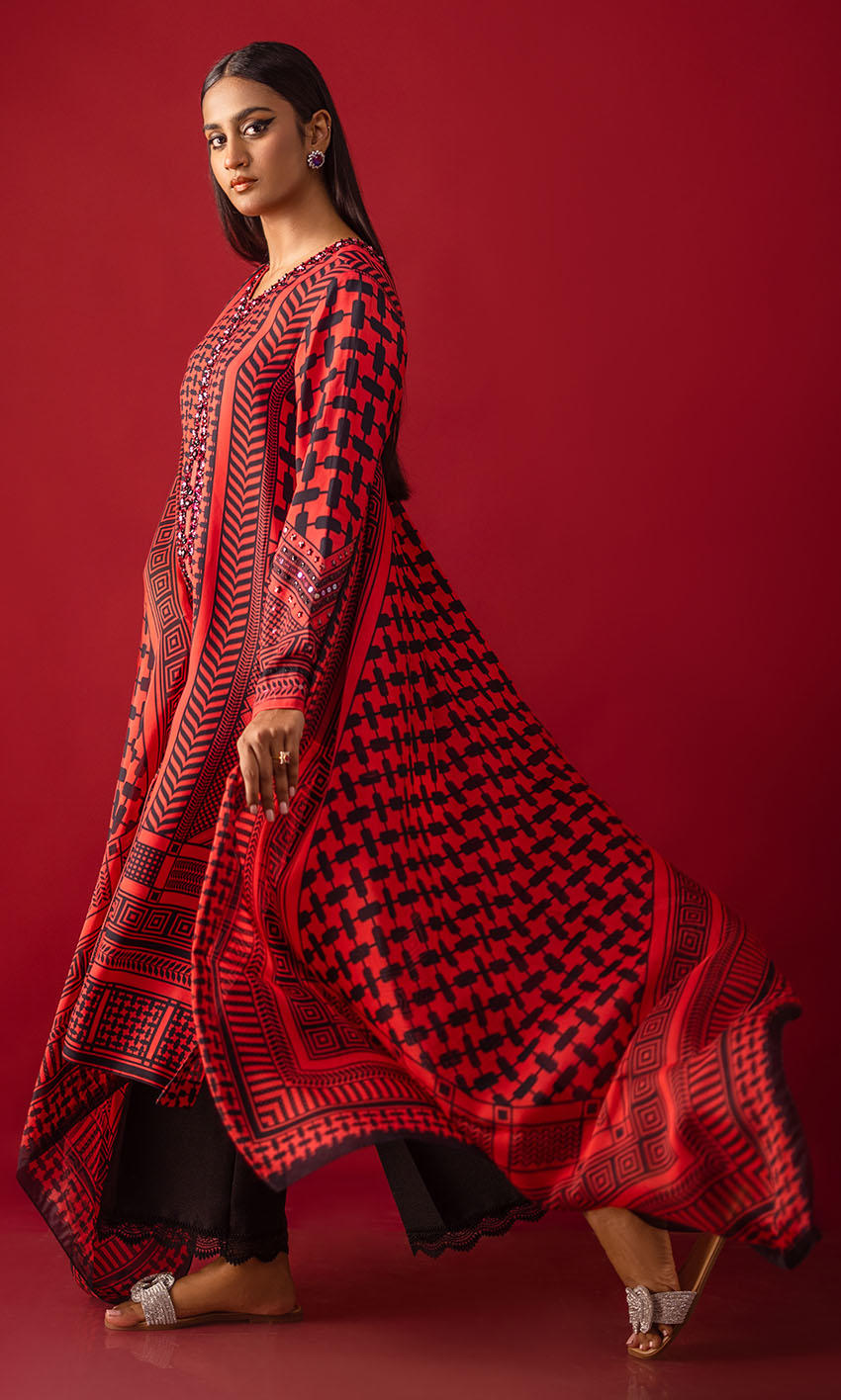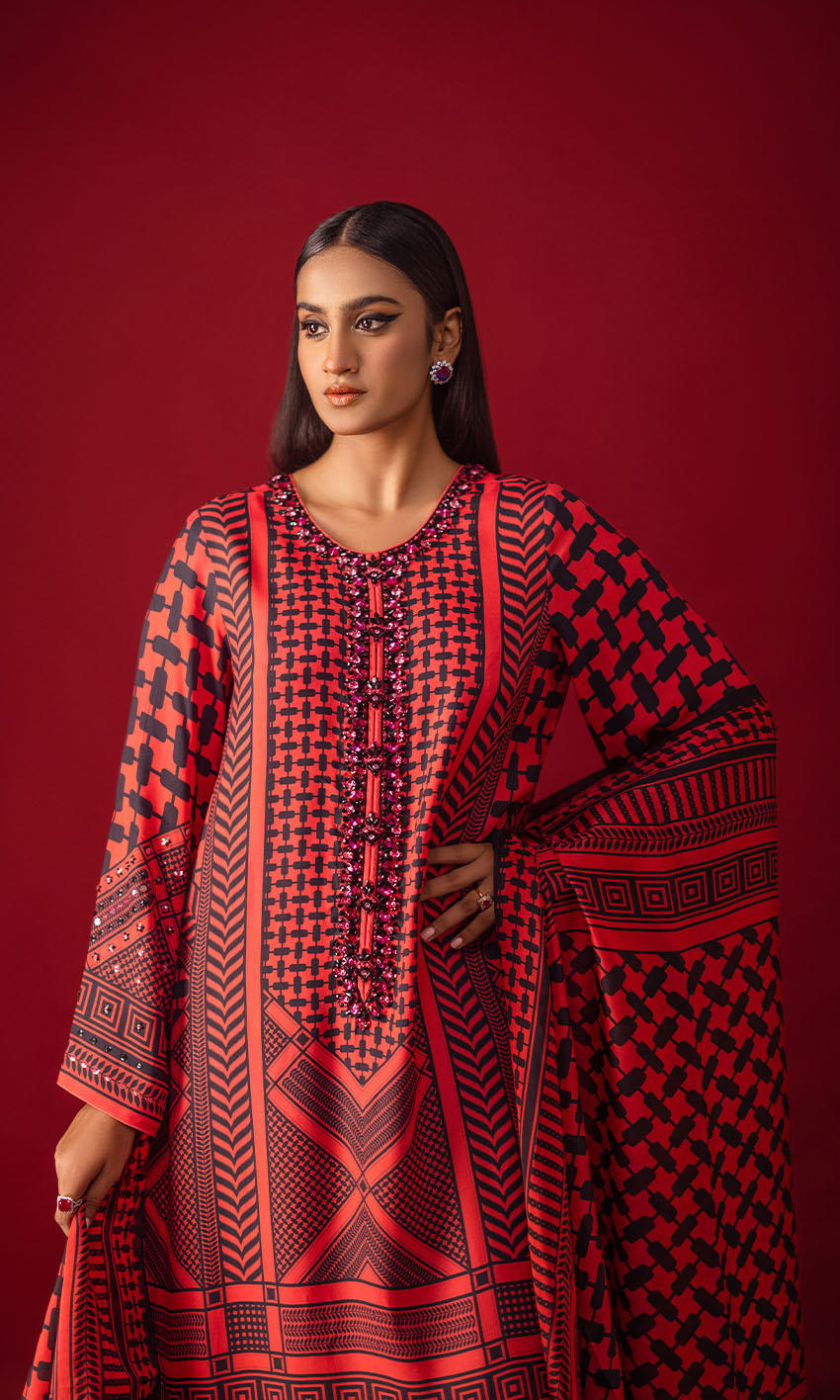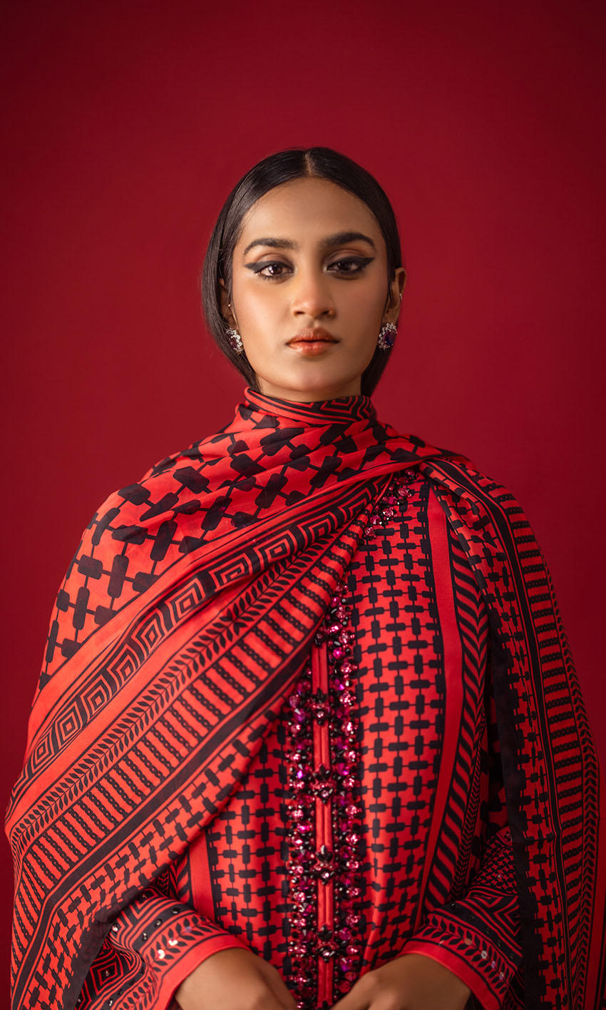 Printed crepe shirt featuring a dazzling jewelled hand embellished neckline and sleeves, paired with sleek black ezaar pants adorned with delicate lace and a stunning silk printed dupatta.