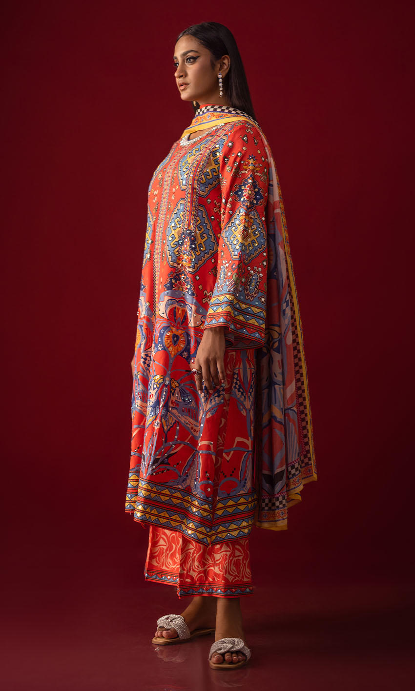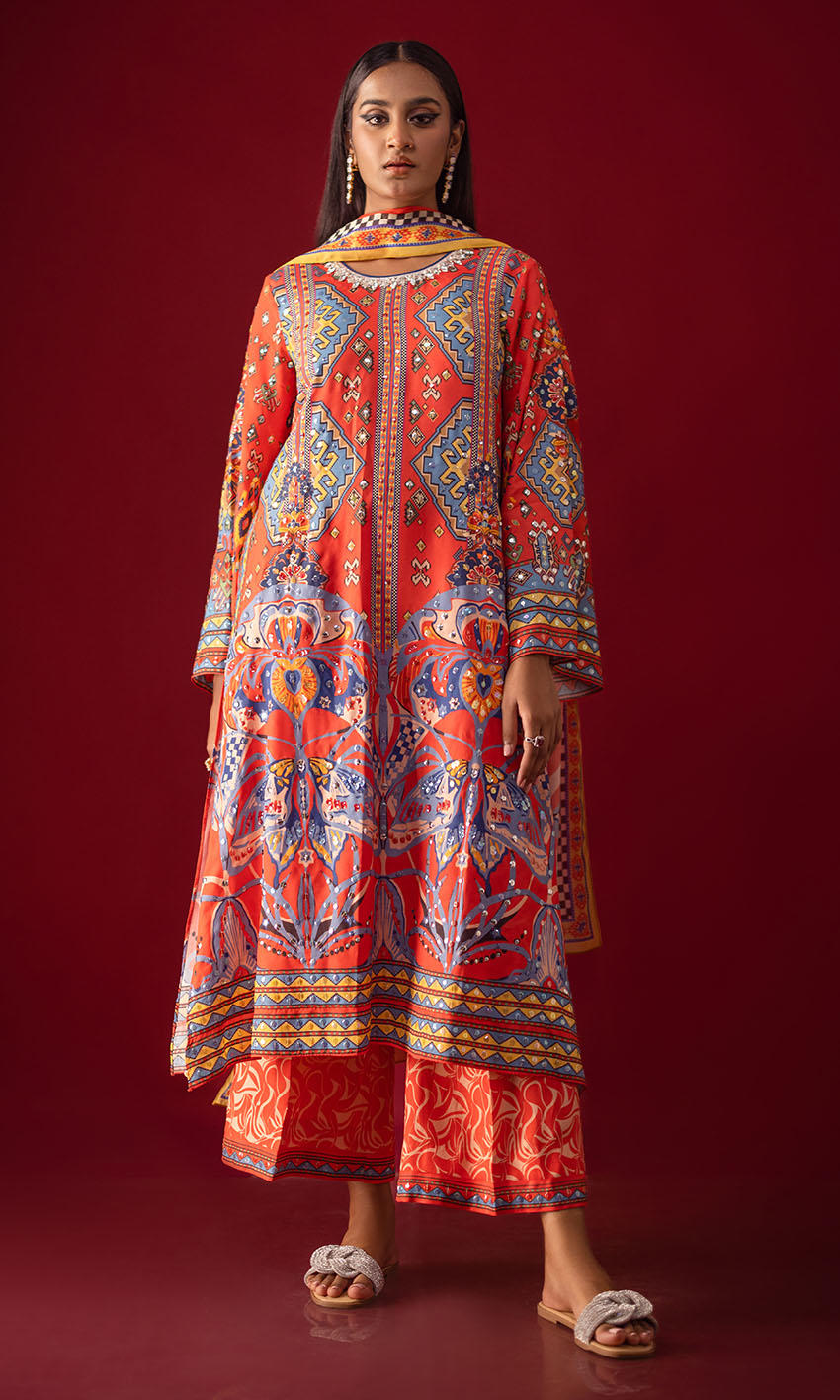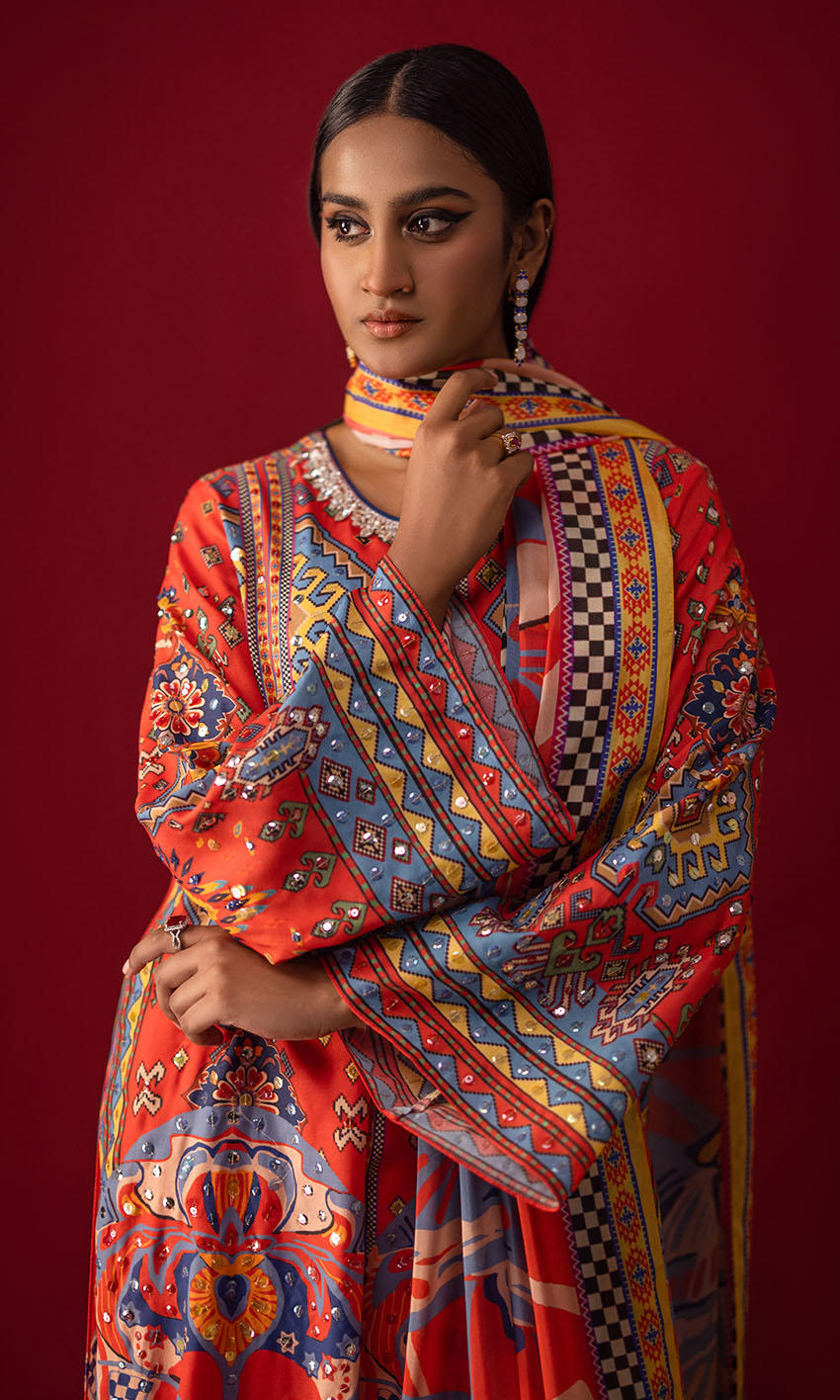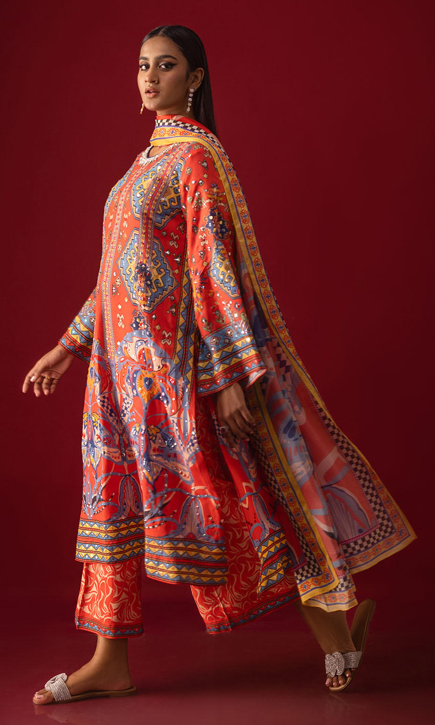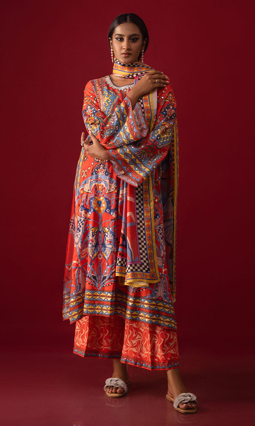 Crepe printed shirt featuring a hand embellished neckline and intricate handwork detailing that beautifully enhances the print. Paired with matching crepe printed pants adorned with a border for a coordinated...