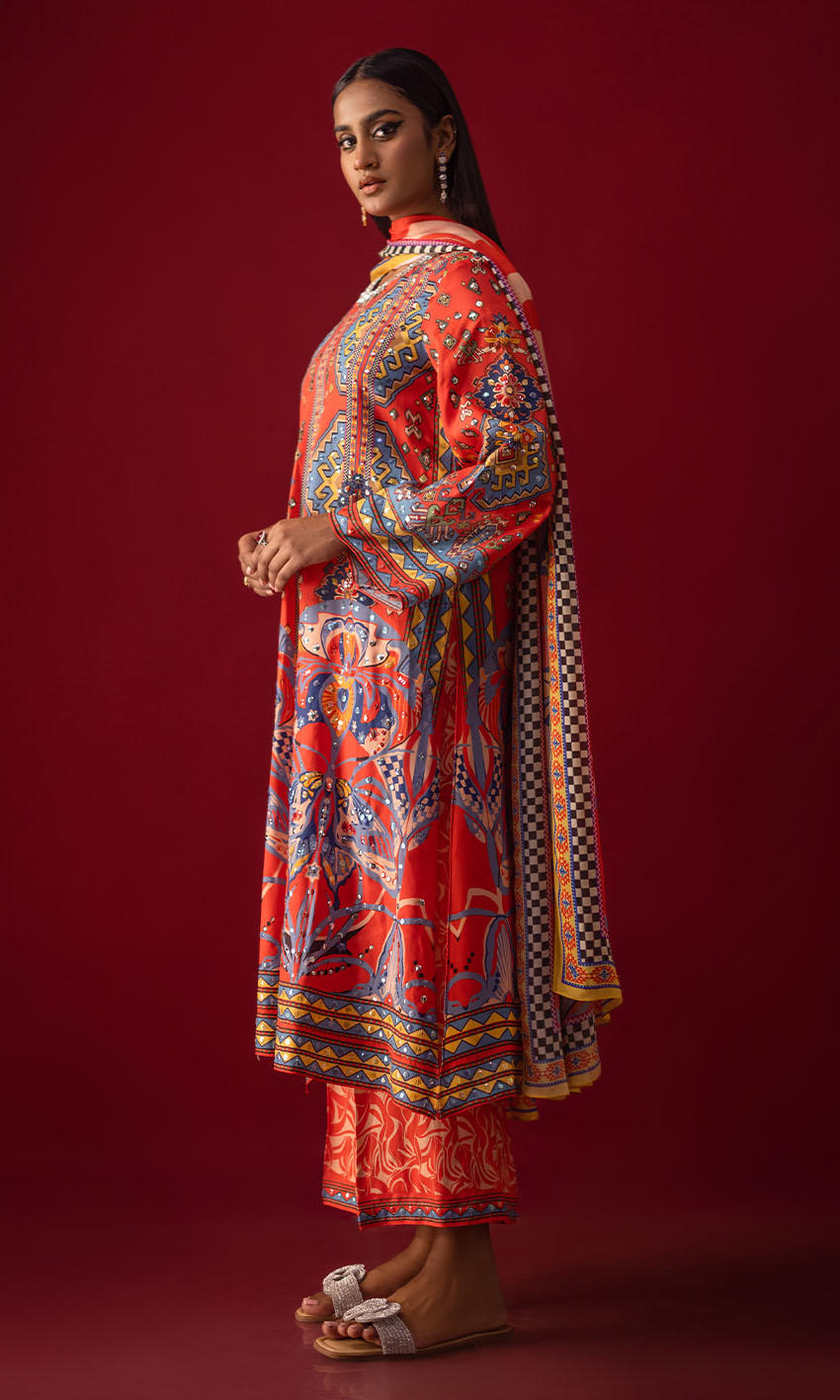Crepe printed shirt featuring a hand embellished neckline and intricate handwork detailing that beautifully enhances the print. Paired with matching crepe printed pants adorned with a border for a coordinated look.