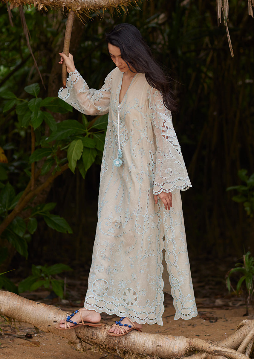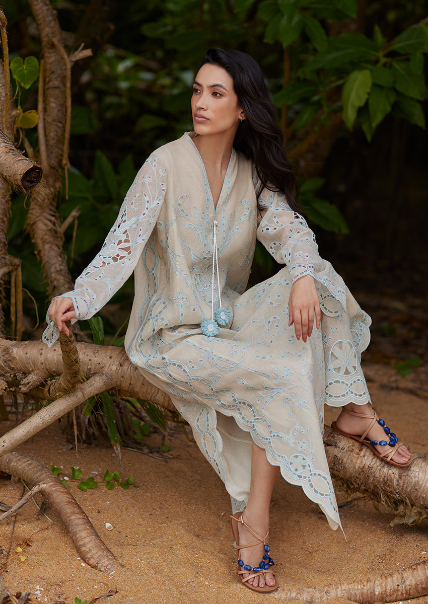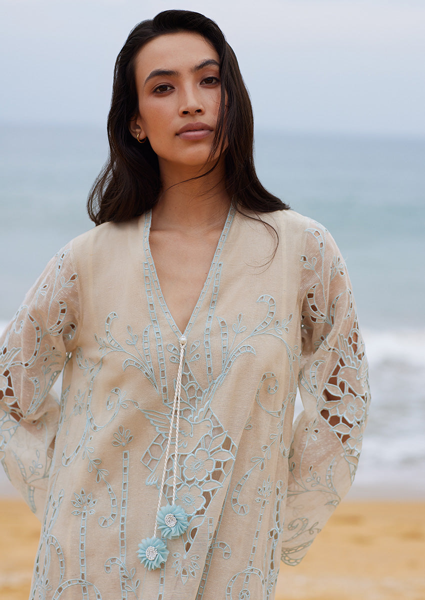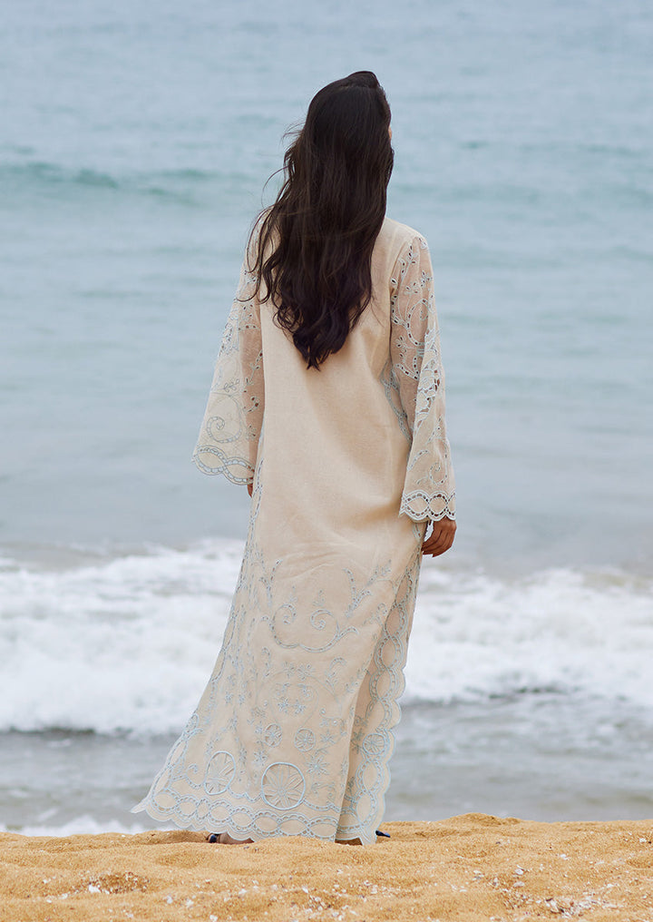 An ethereal vision, this airy kaftan is fashioned from a delicate beige hued khaddi corduroy, kissed with intricate sky tinted embroidery. The lined fabric whispers luxury, while scalloped lace sleeves and playful cutwork embroidery adds a poetic feel. A tasseled neckline with dainty floral tassels complete the dreamy vibe.