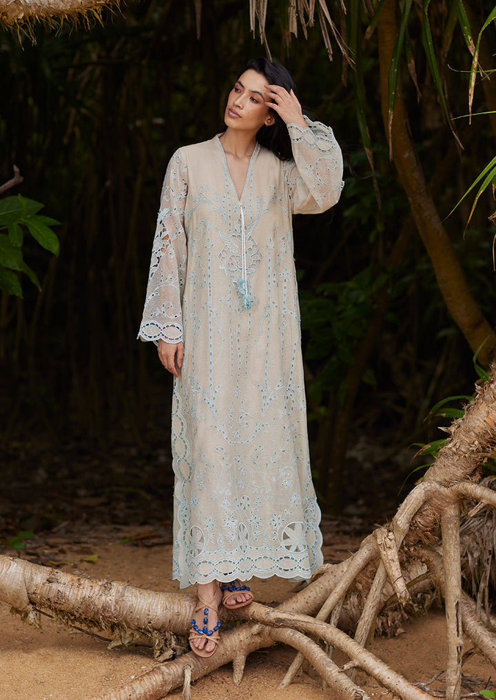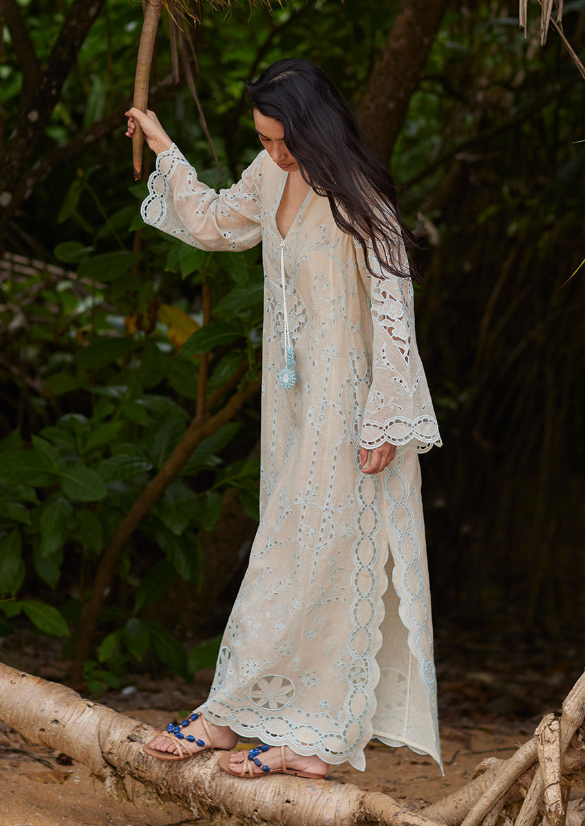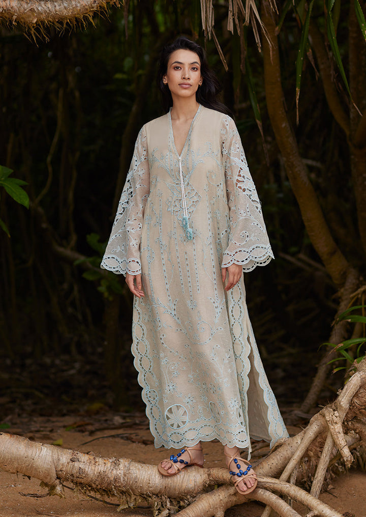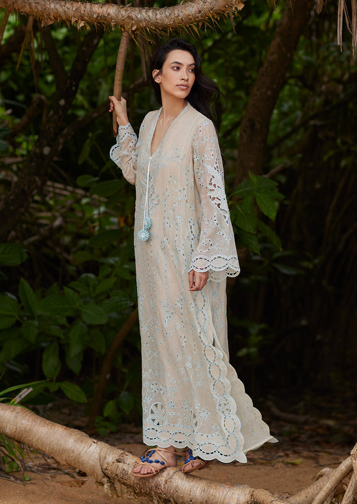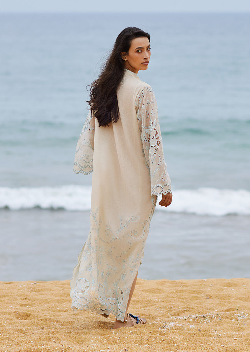An ethereal vision, this airy kaftan is fashioned from a delicate beige hued khaddi corduroy, kissed with intricate sky tinted embroidery. The lined fabric whispers luxury, while scalloped lace sleeves and playful cutwork embroidery adds a poetic feel. A tasseled neckline with dainty floral tassels complete the dreamy vibe.