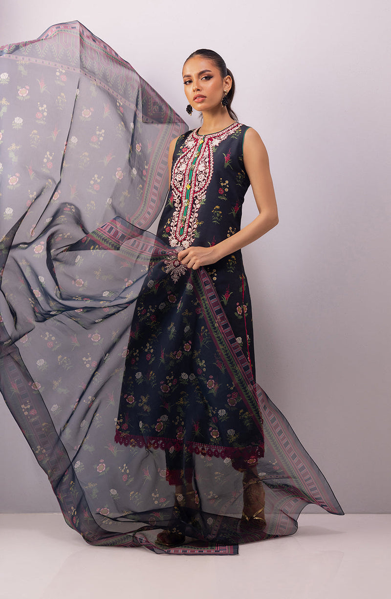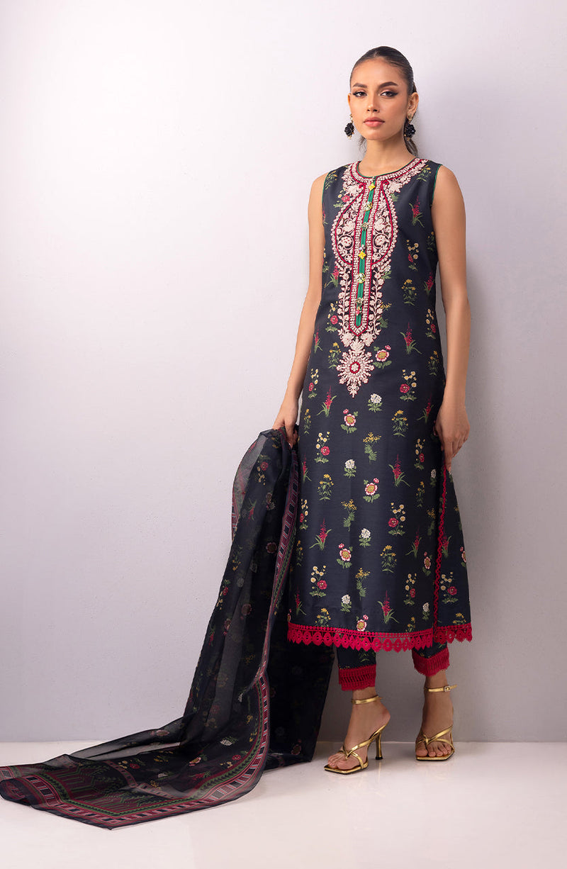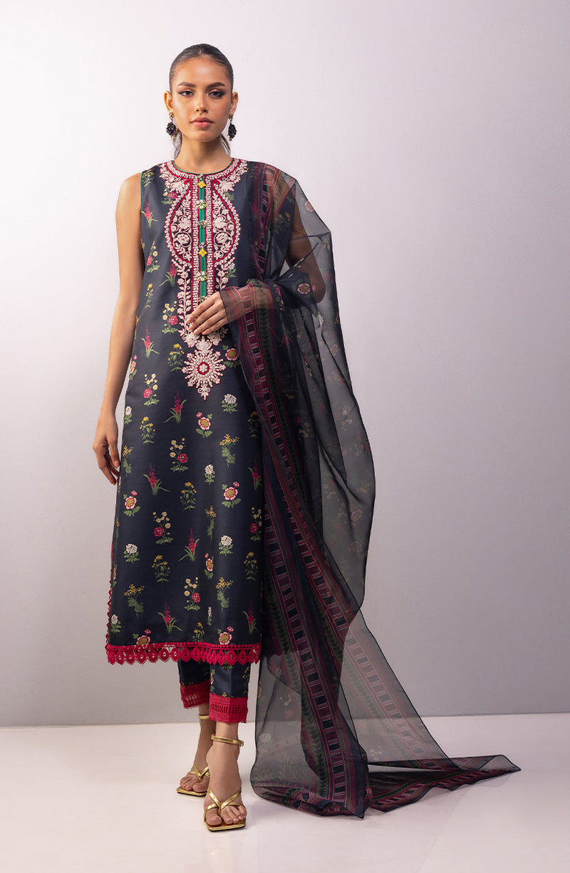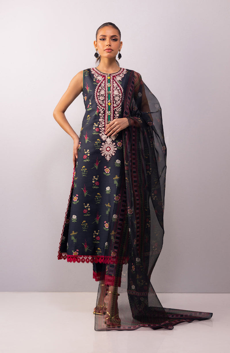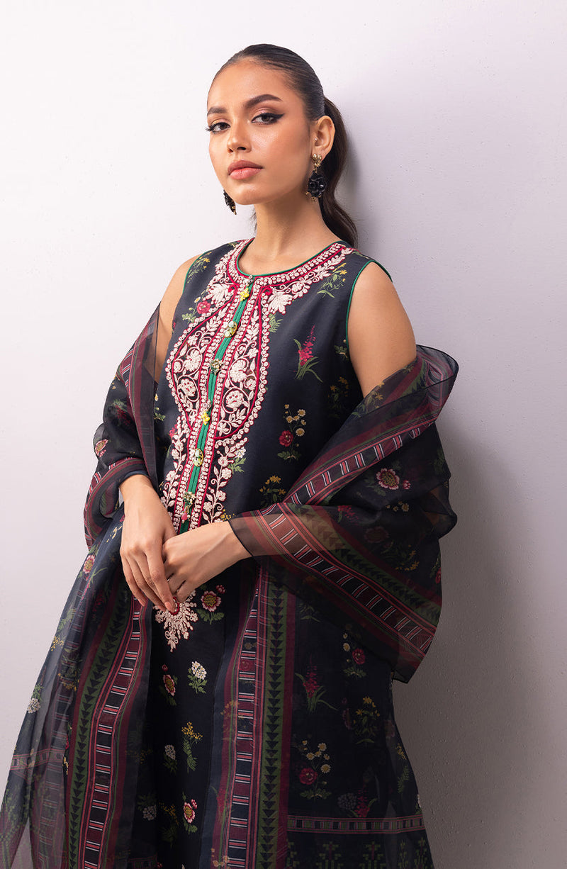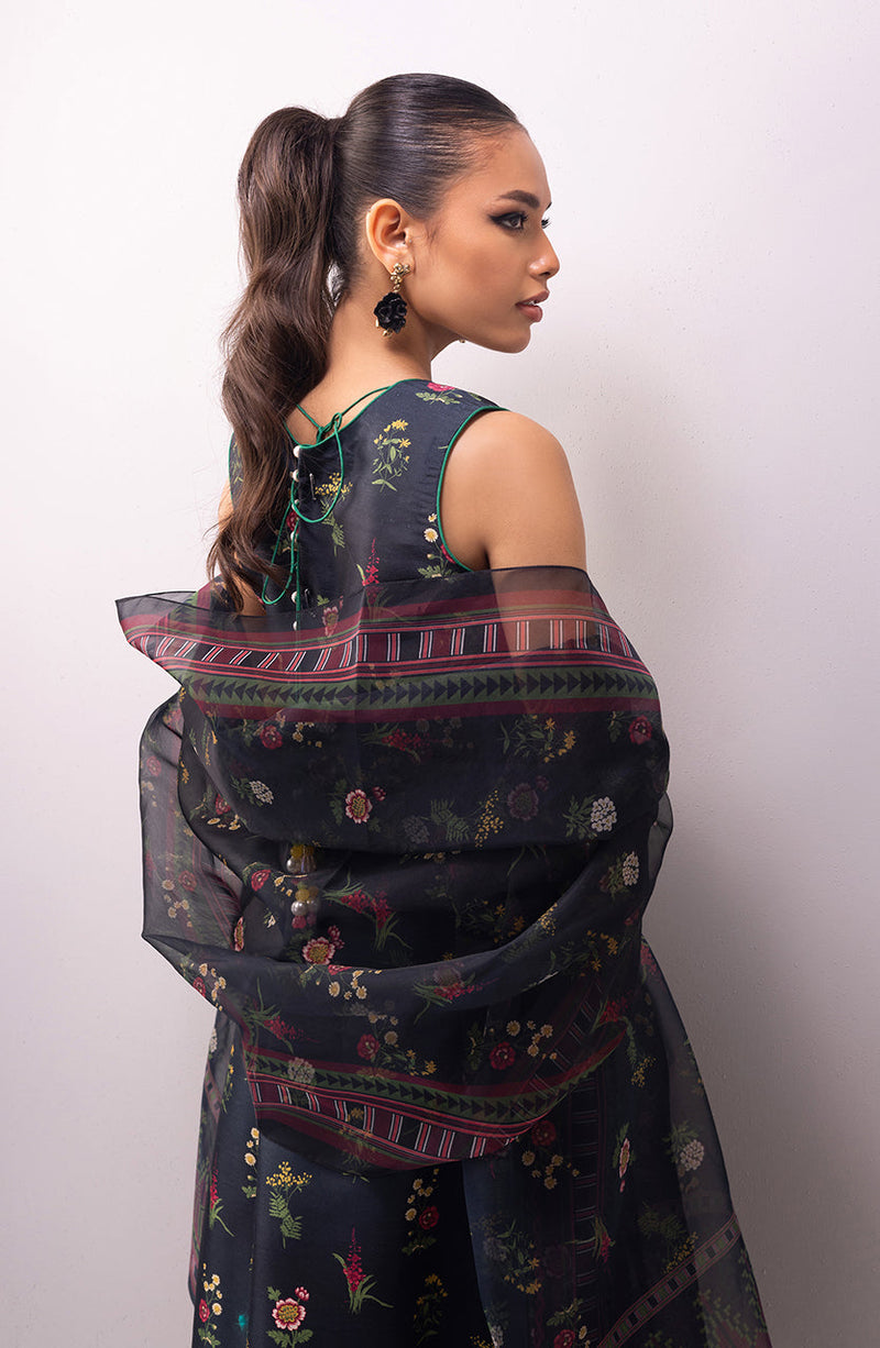 Contrast embroidery and lace detailing on a black floral base, paired with a chic organza dupatta