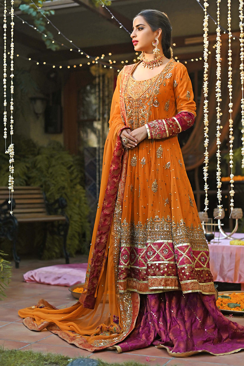 Soothing burnt orange peshwas with zardozi and kamdani work, with hint of gotta. The magenta jamawar lengha and tri color worked borders makes this outfit a perfect mehndi wear.