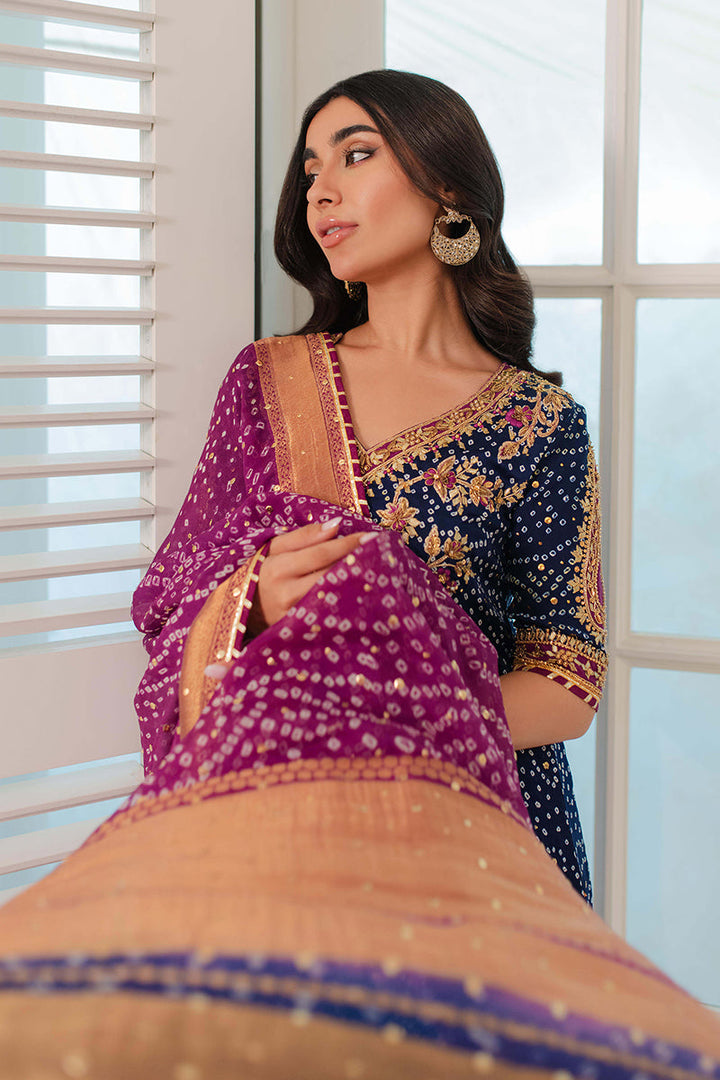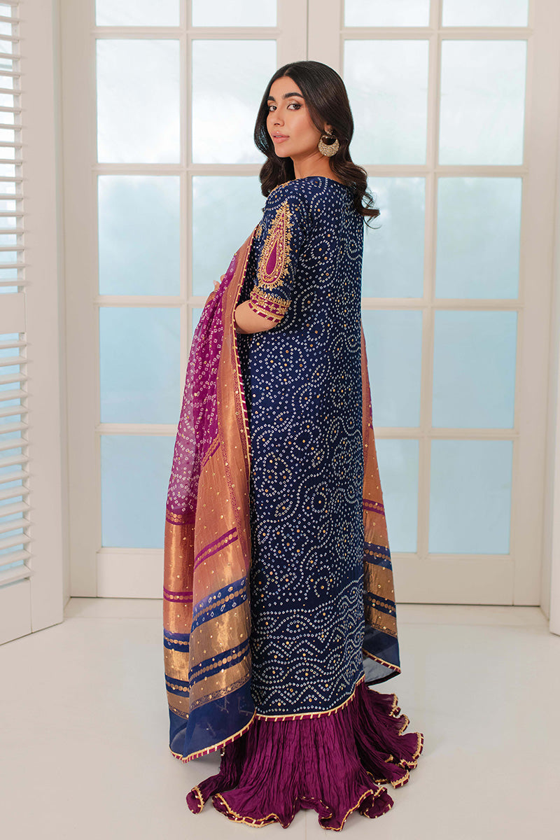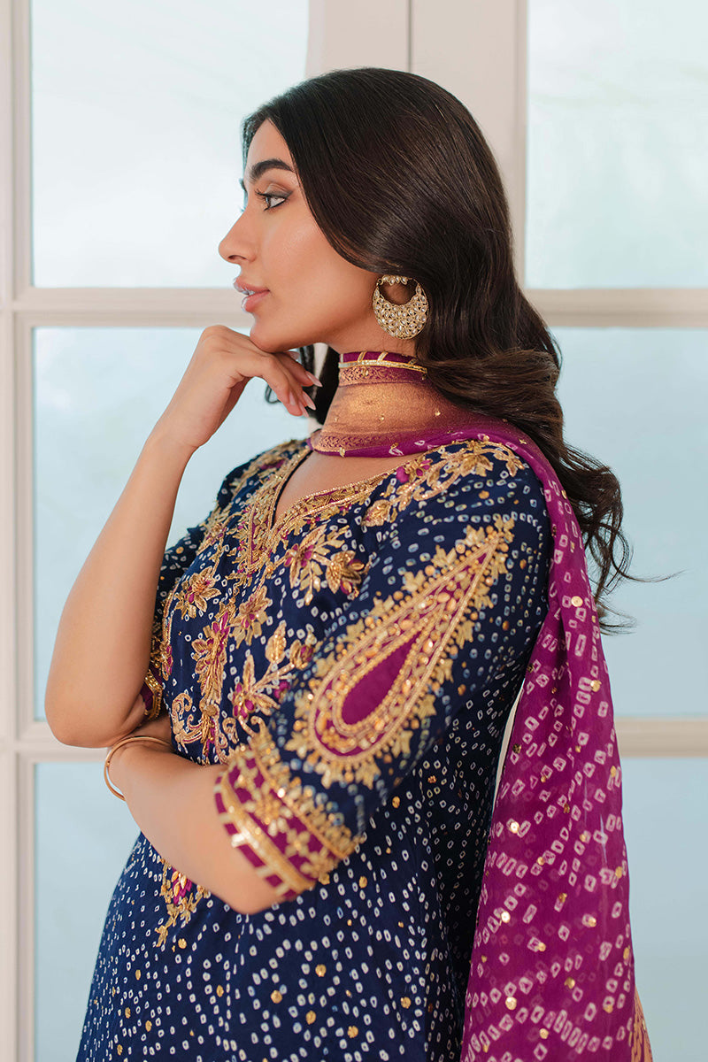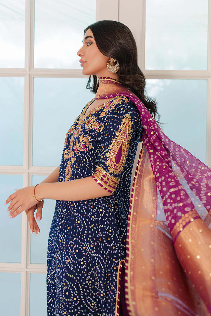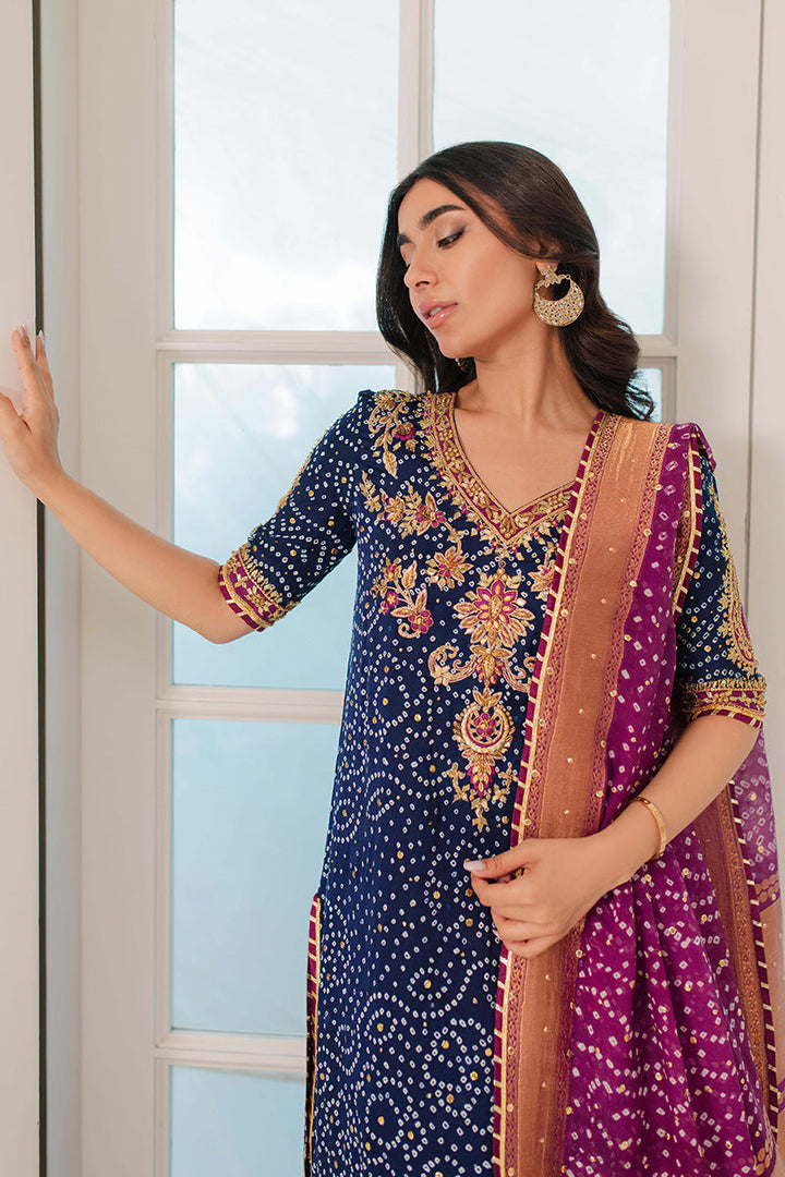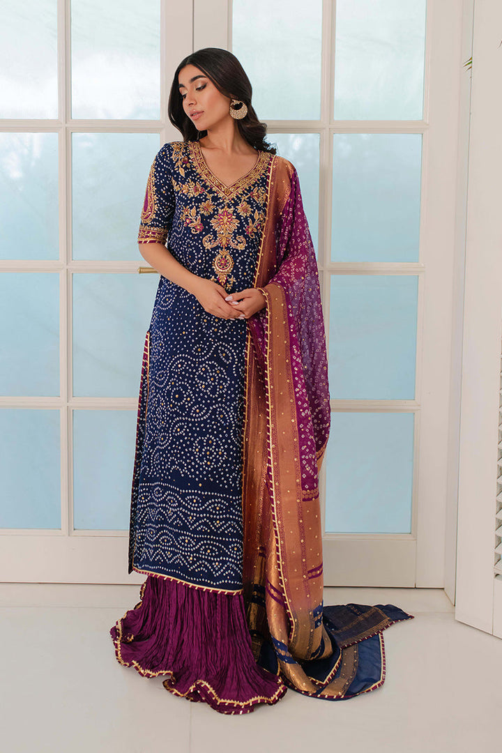 Look forever festive in this blue ensemble. Featuring delicate goat and zardozi kaam on the neckline, sleeves and pants; this ensemble is perfect for any party or shaadi event.