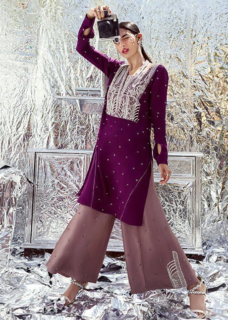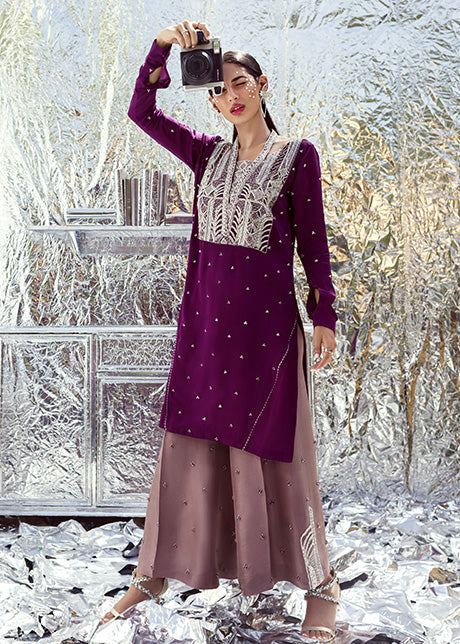 Includes: Kameez Trouser Fabric:Â Trousers: Pure raw silk Kameez: Pure charmeuse silk Color:Â Gothic Grape Description: An innovative A-line silhouette with a lifted collar that separates from the neckline taking this...