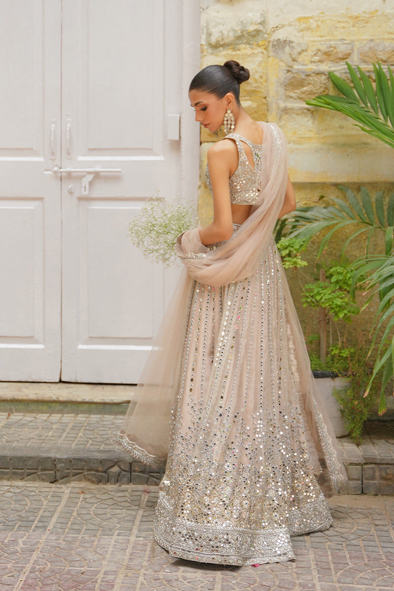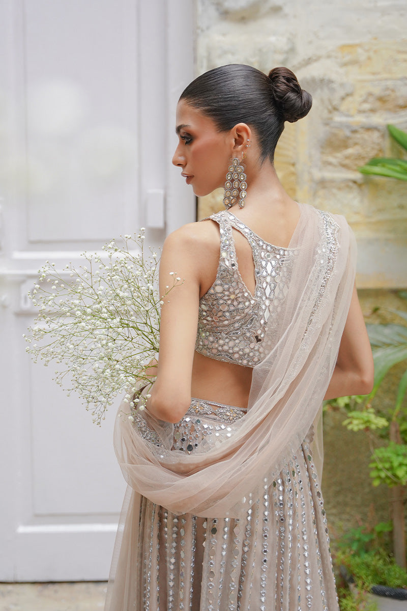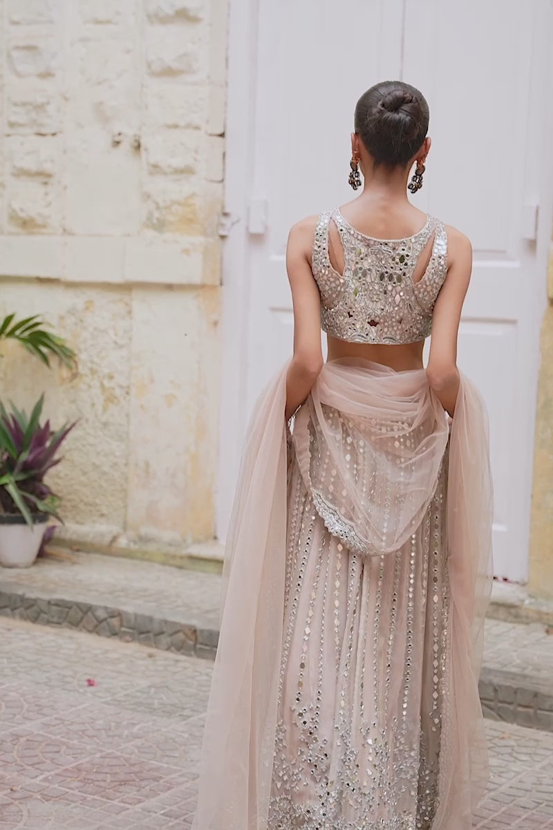 Delicately embellished lehenga choli adorned with mirror and zardozi work. The halter-neck choli with peek-a-boo on the back neckline adds an eloquent accent to the silhouette.