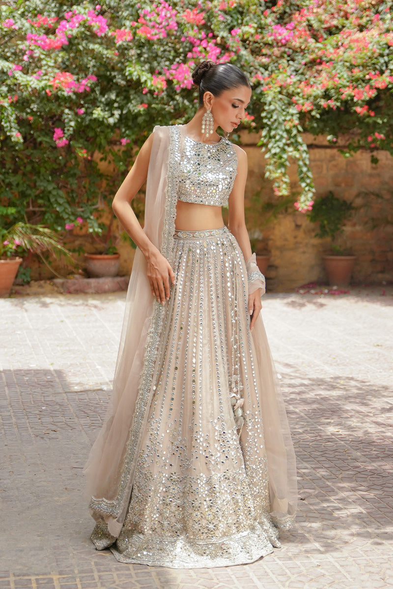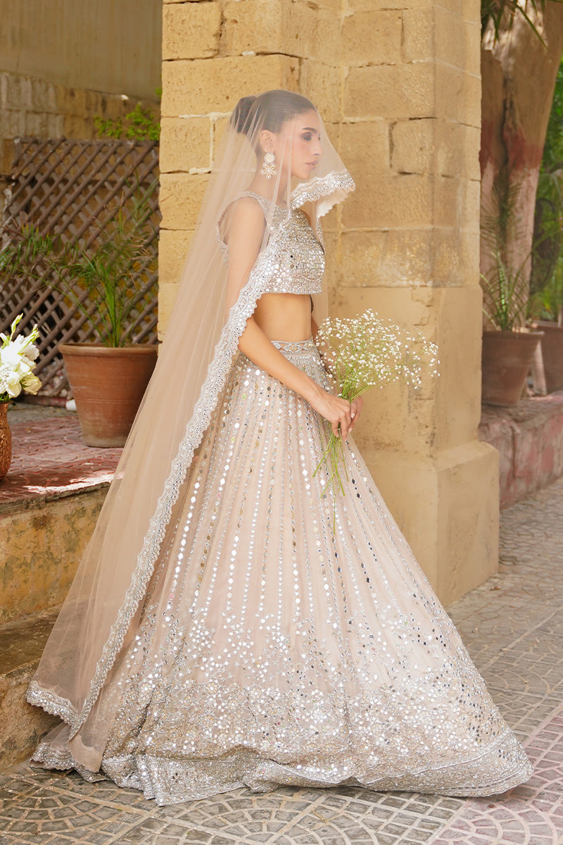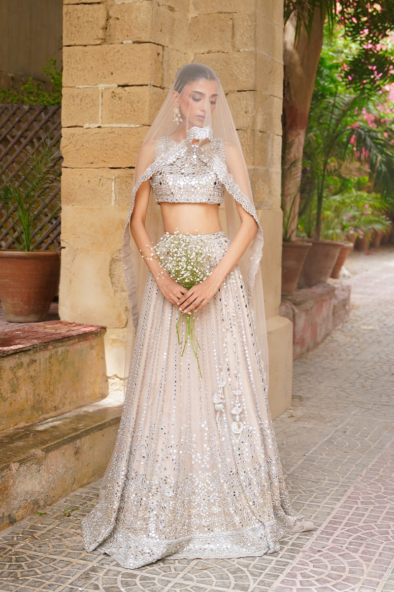 The look is finished with a Korean net dupatta, filled with opulent mirror embroidery and decorated with scalloped borders.ÂÂ