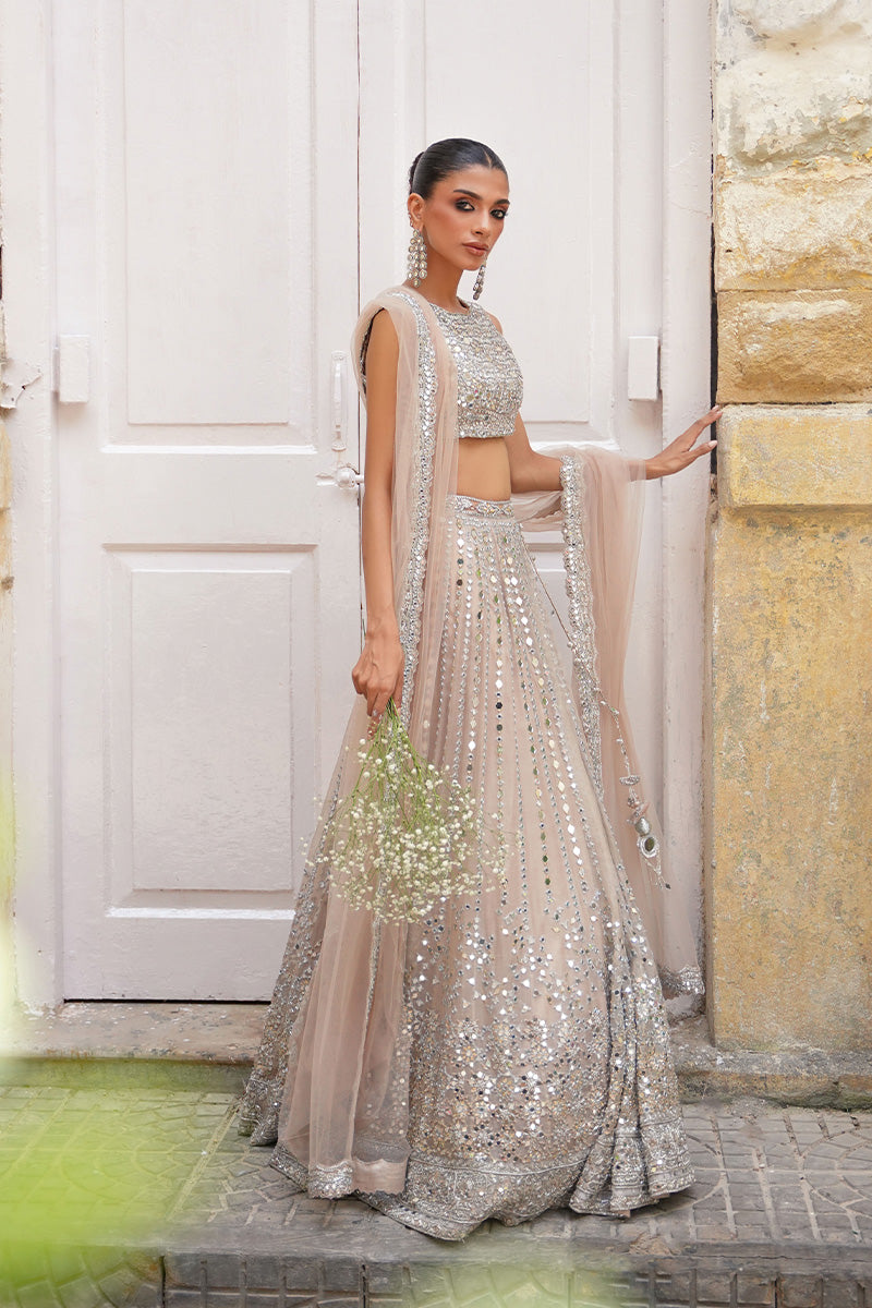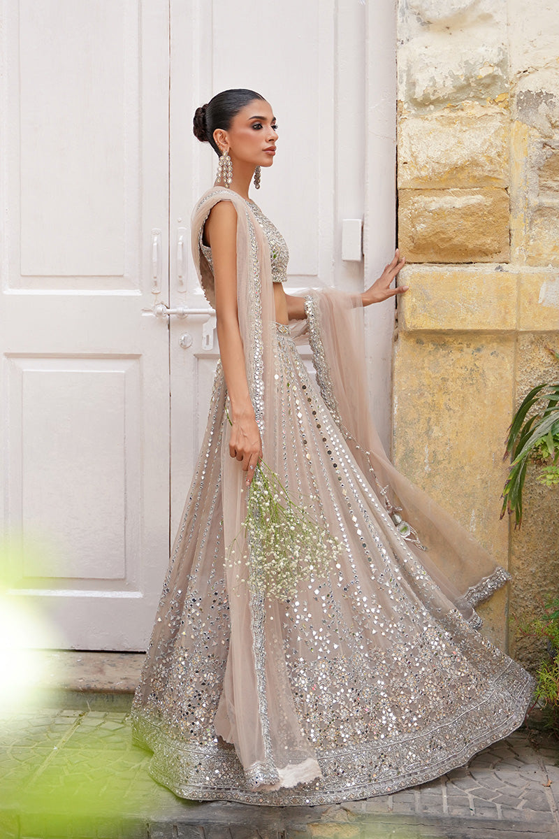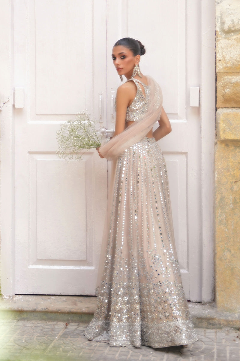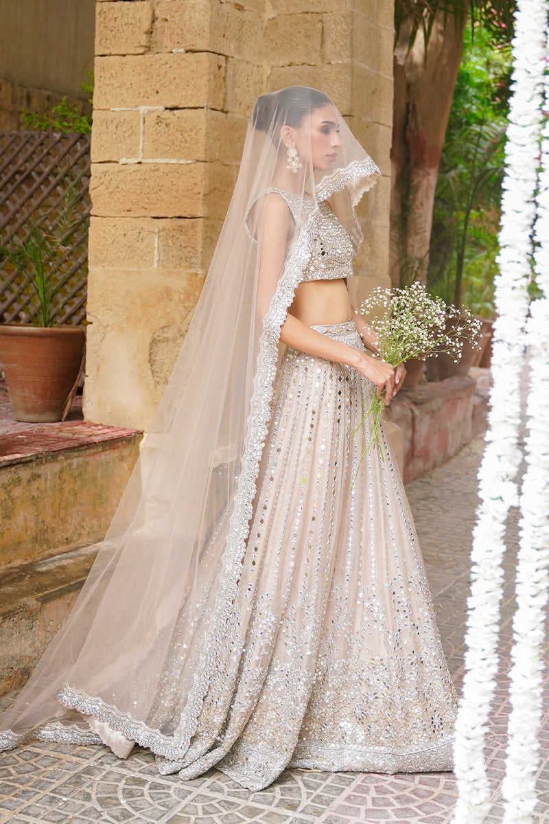 The look is finished with a Korean net dupatta, filled with opulent mirror embroidery and decorated with scalloped borders.ÂÂ