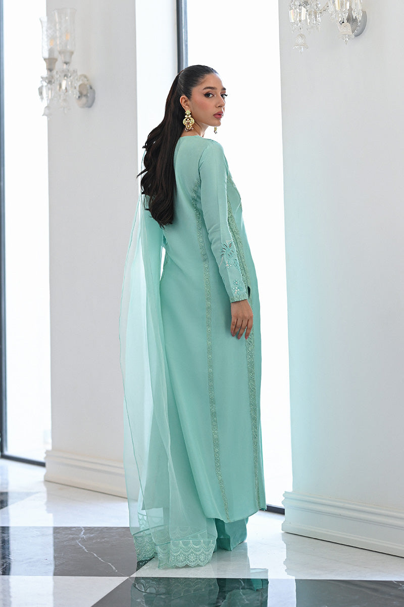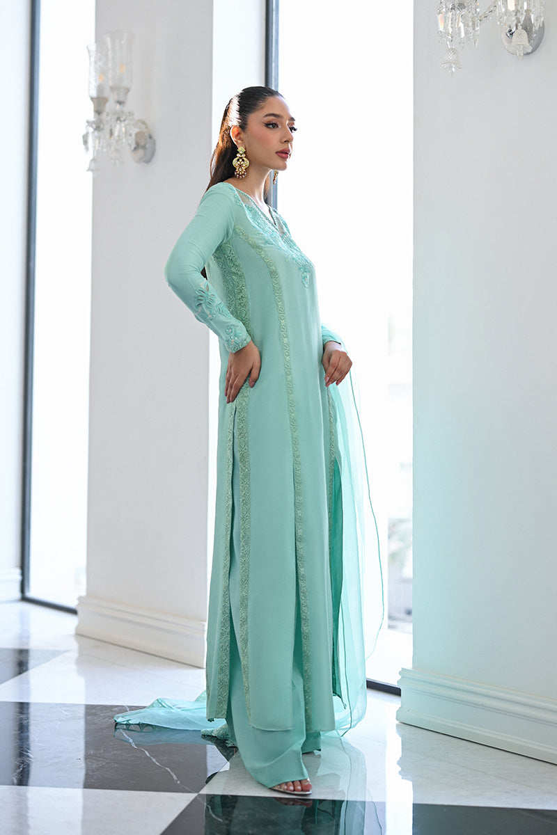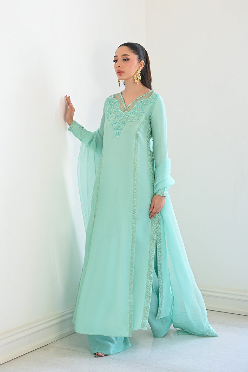 This gorgeous firozi raw silk ensemble is sure to turn heads! With a beautiful embroidered neckline and details in kalis, this silhouette will surely be a staple in your wardrobe.