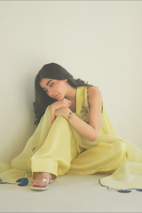 A lemon hued ensemble redefines elegance with its flattering silhouette. The pure rawsilk sleeveless shirt features delicate pleats and intricate floral embroidery, evoking artisanal charm, while a bold front slit adds a contemporary edge. Paired with a voluminous pure rawsilk farshi shalwar for effortless movement, the look is completed with an organza dupatta, adorned with scalloped edges and appliqué florals in deep sapphire tones.