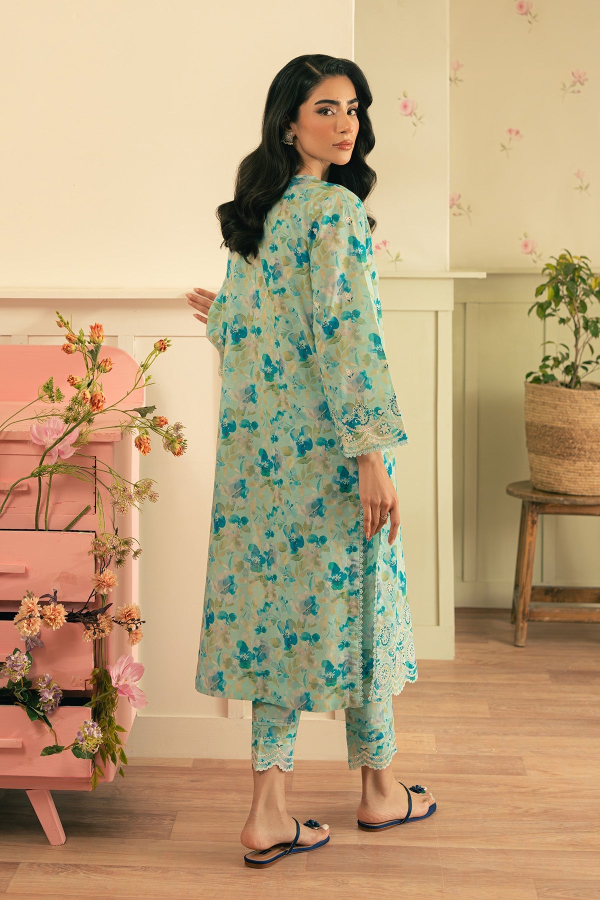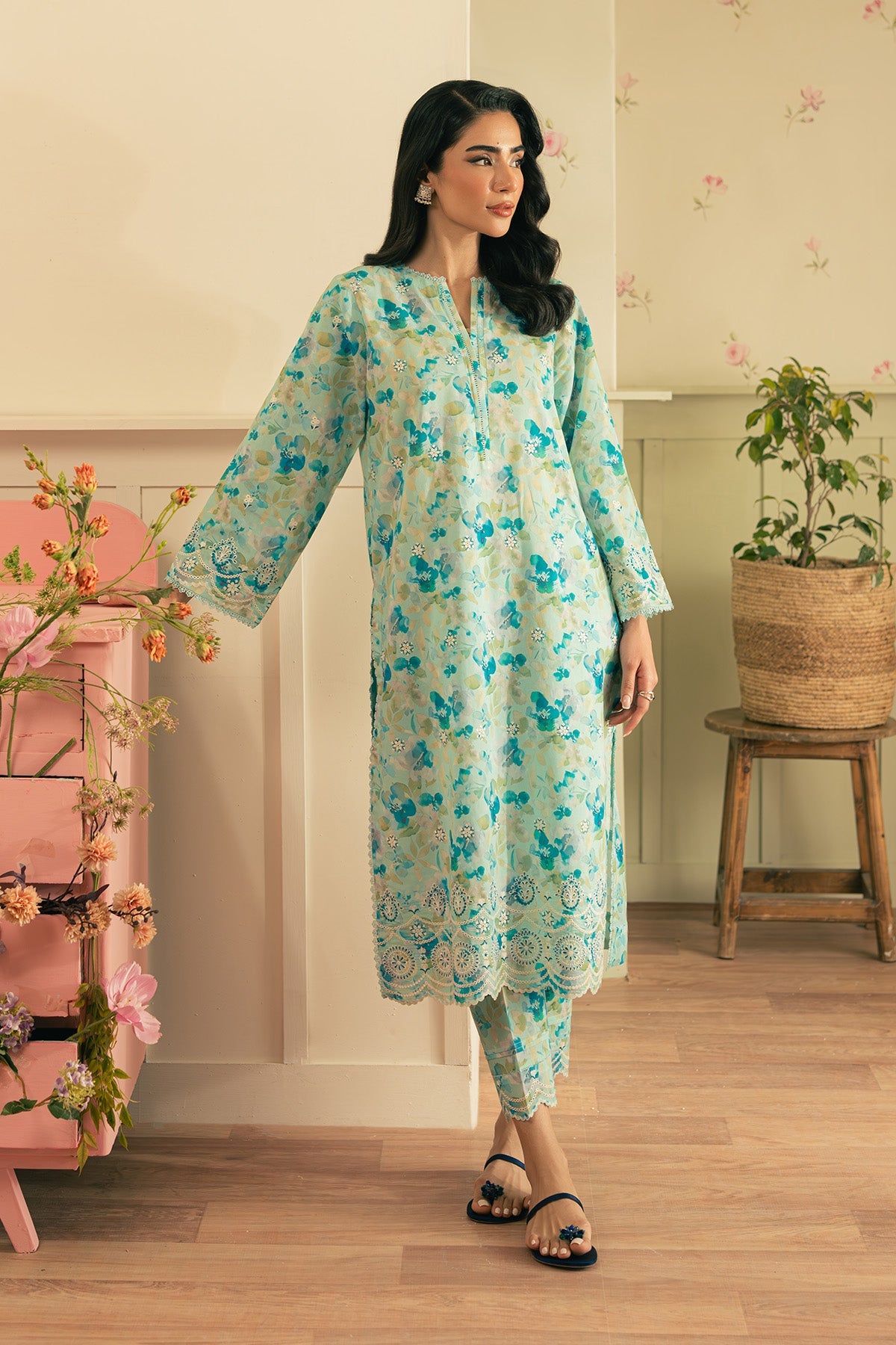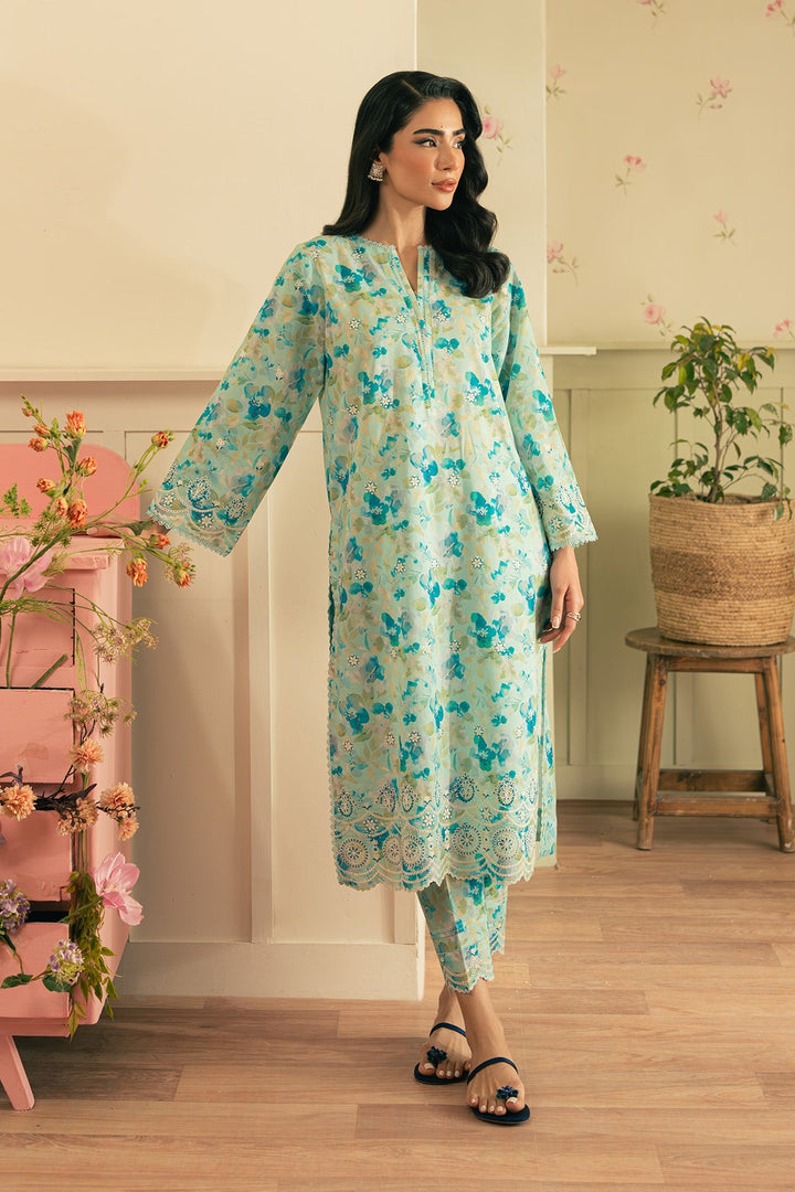 Light green co-ord set featuring a shirt and straight trousers. Adorned with a soft yet vibrant watercolor floral print and dual-tone schiffli embroidery.