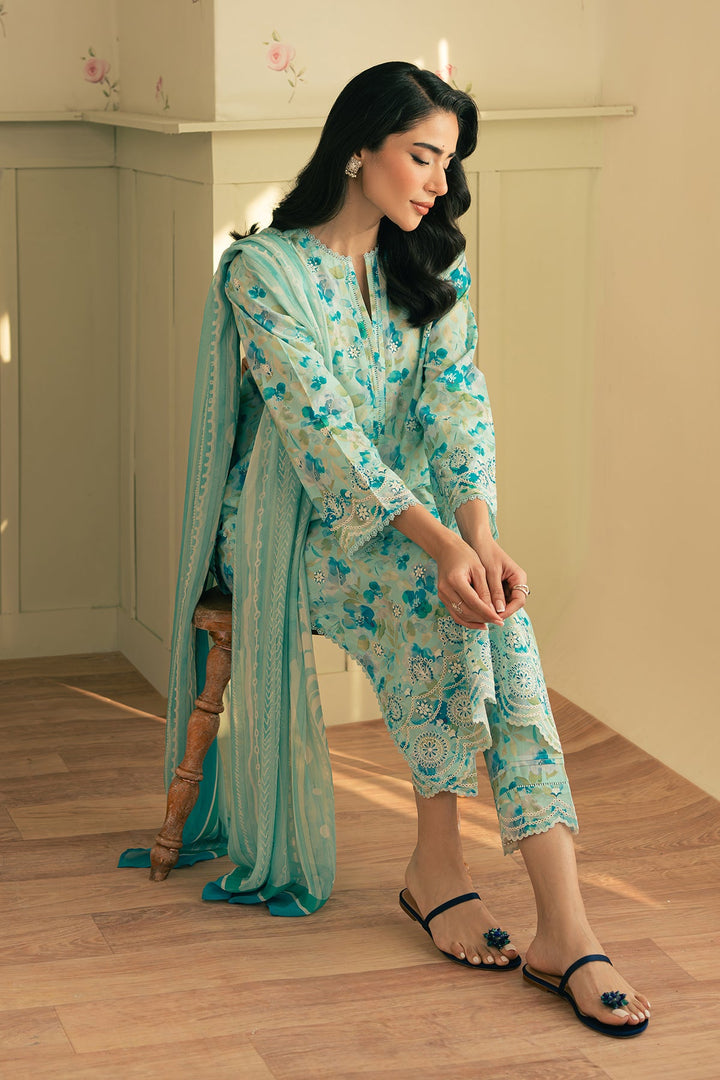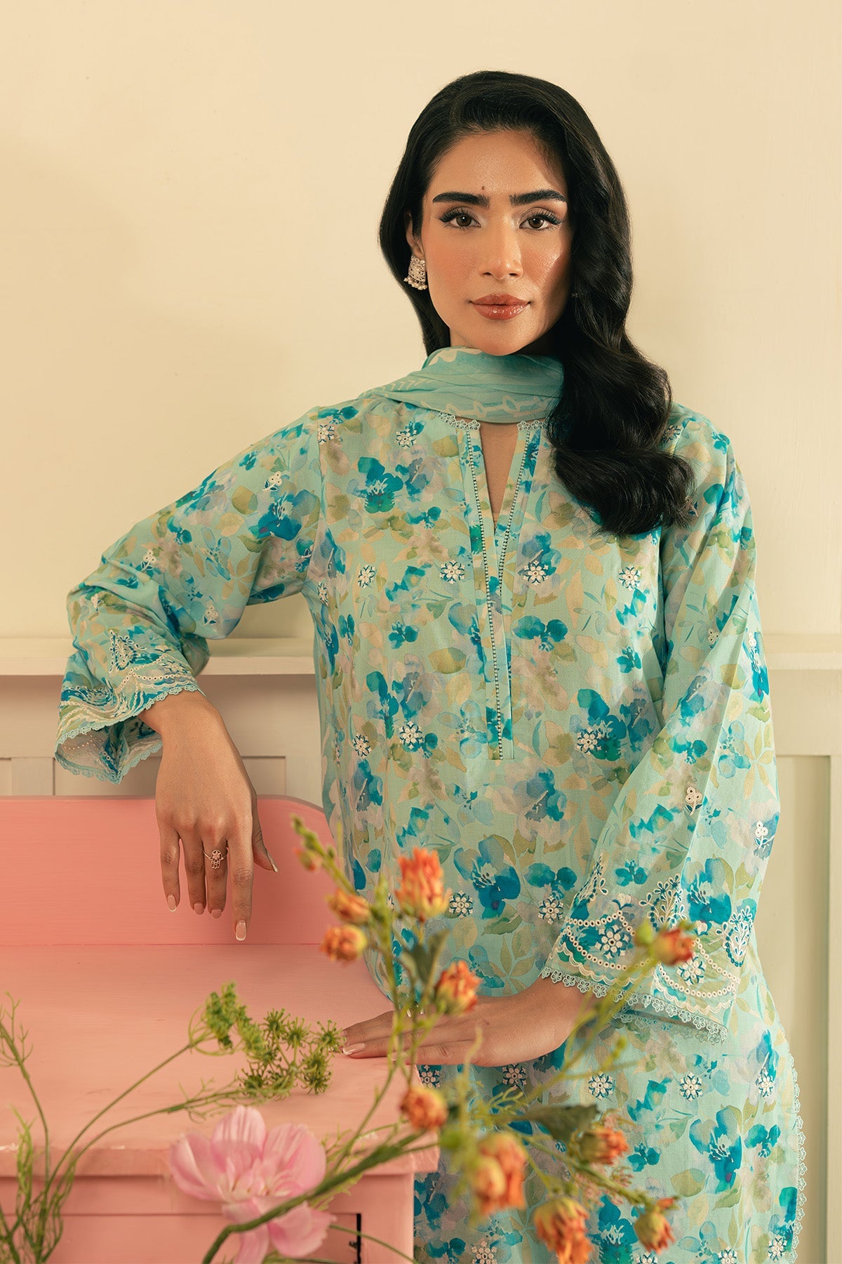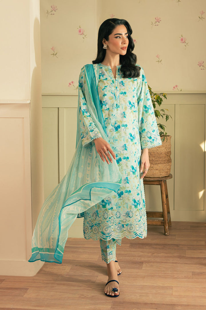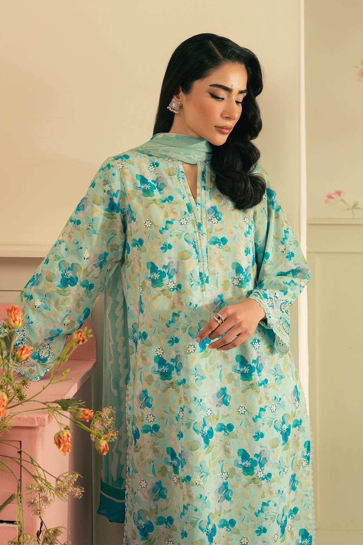 Light green co-ord set featuring a shirt and straight trousers. Adorned with a soft yet vibrant watercolor floral print and dual-tone schiffli embroidery.