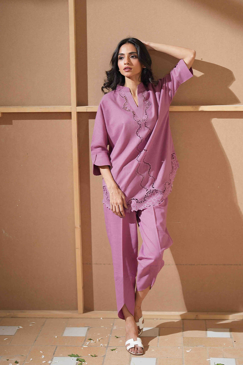 This lavender co-ord set is a beautiful and elegant outfit, perfect for meet-ups. The Irish fabric provides a fine look, while the machine embroidery and resham work add intricate details. The stitching details on the sleeves and V neckline create a delicate and feminine touch. The detailed hand cutwork on the shalwar adds a touch of sophistication, completing the look.