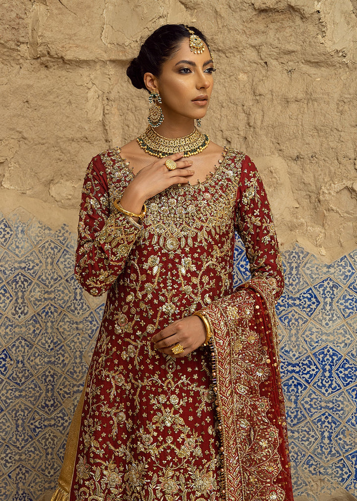 Featuring a scarlet red full length straight all over zardozi laden shirt worked with the french knots, kora dabka work in bright auburn and crimson with copious amounts of gold detailing on pure mesori silk base. What makes this piece especially beautiful are the gold embellishments that run through the dress, further adding grandeur to the honey gold pure katan silk traditional lehnga. It comes with a scarlet red pure french net kamdani dupatta with heavy borders and kamdani flowers spray. It’s heavily gilded on the border with beads and zardozi work to match the ensemble.