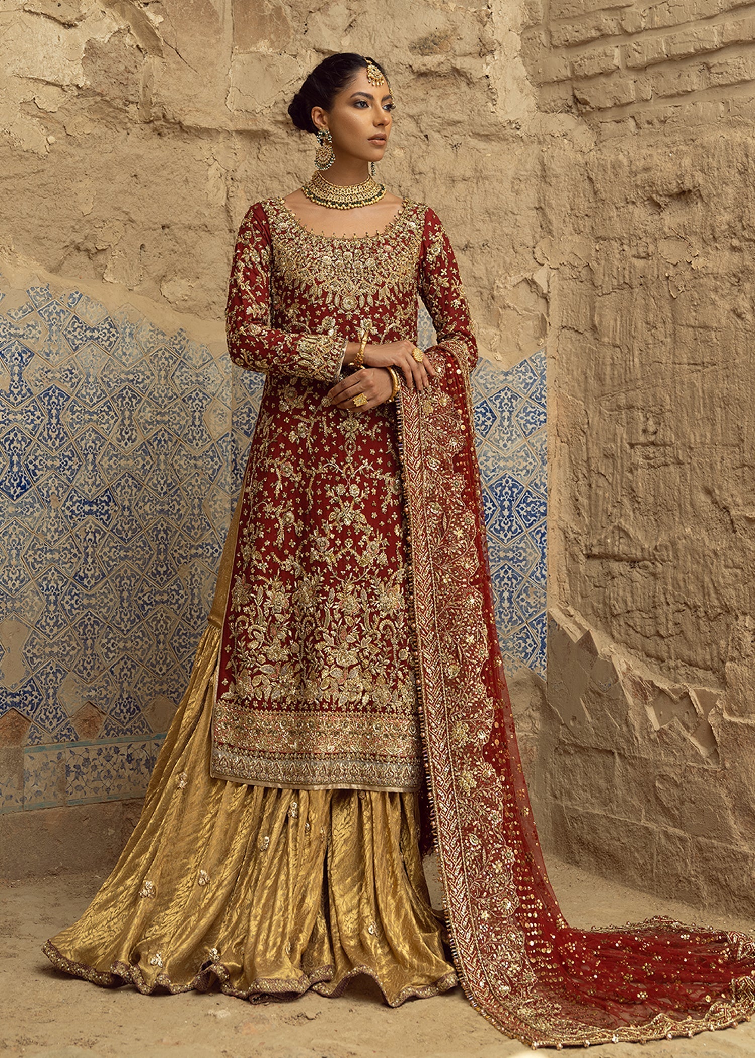 Color: Scarlet red, Honey gold Includes:Â Straight shirt: Pure silk mesori Traditional gharara: Pure katan silk Dupatta: Pure french net Product Descriptions: Featuring a scarlet red full length straight all...