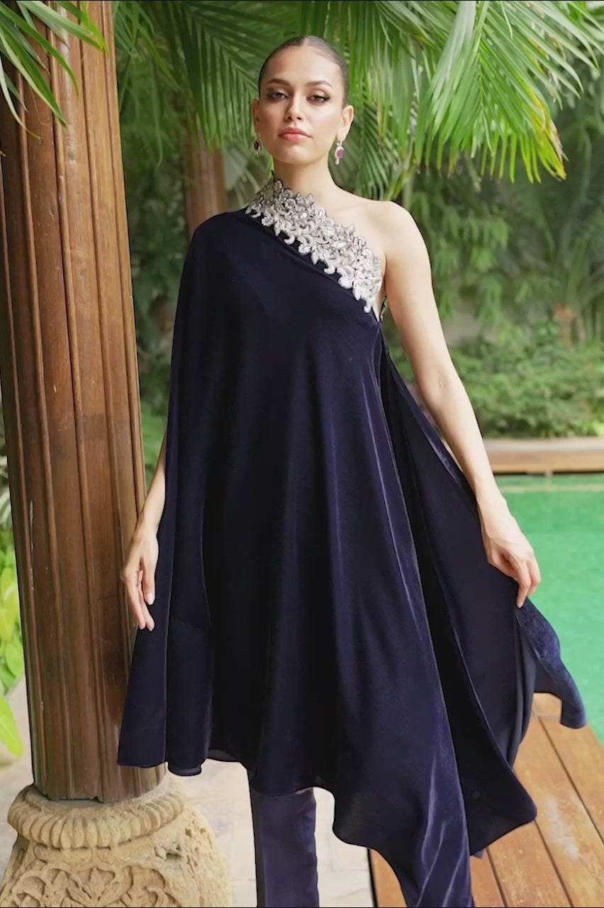 A perfect example of quiet luxury, Orin indulges in the sheen and regal fluidity of velvet. A midnight blue asymmetrical kaftan drapes gracefully, with one of the sleeves making a statement with an embroidered zardoze border with cut-work details. Paired with matching pure rawsilk trousers.