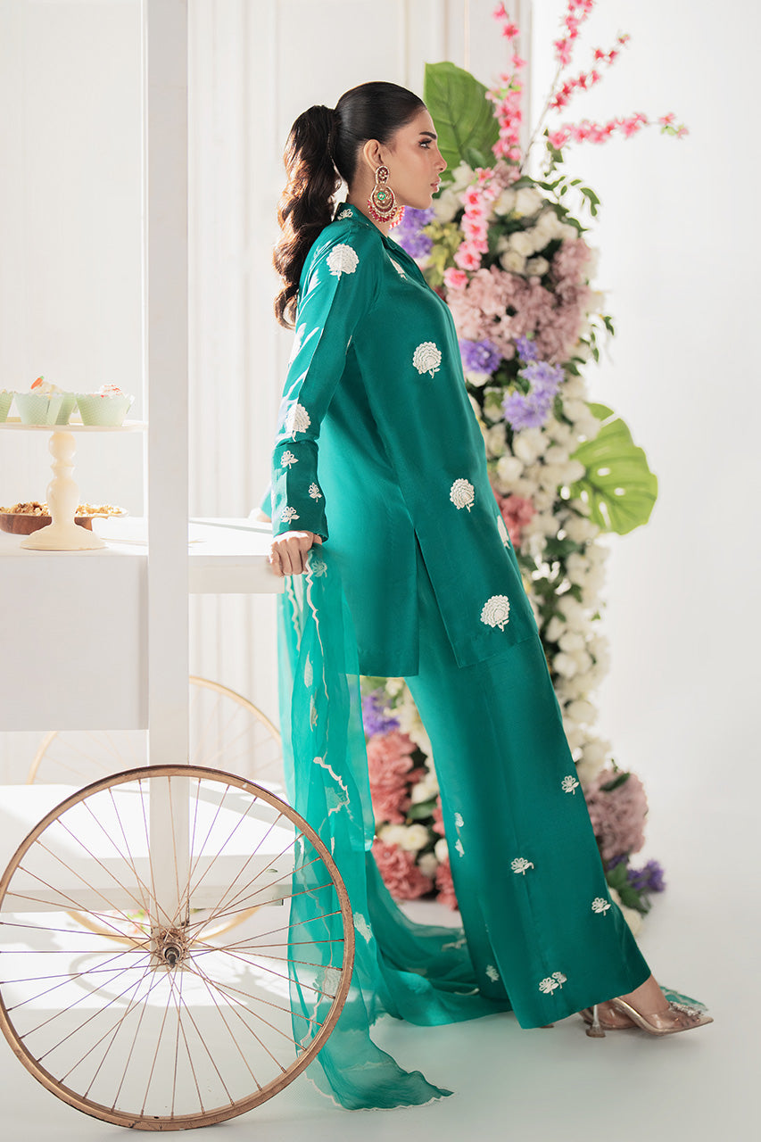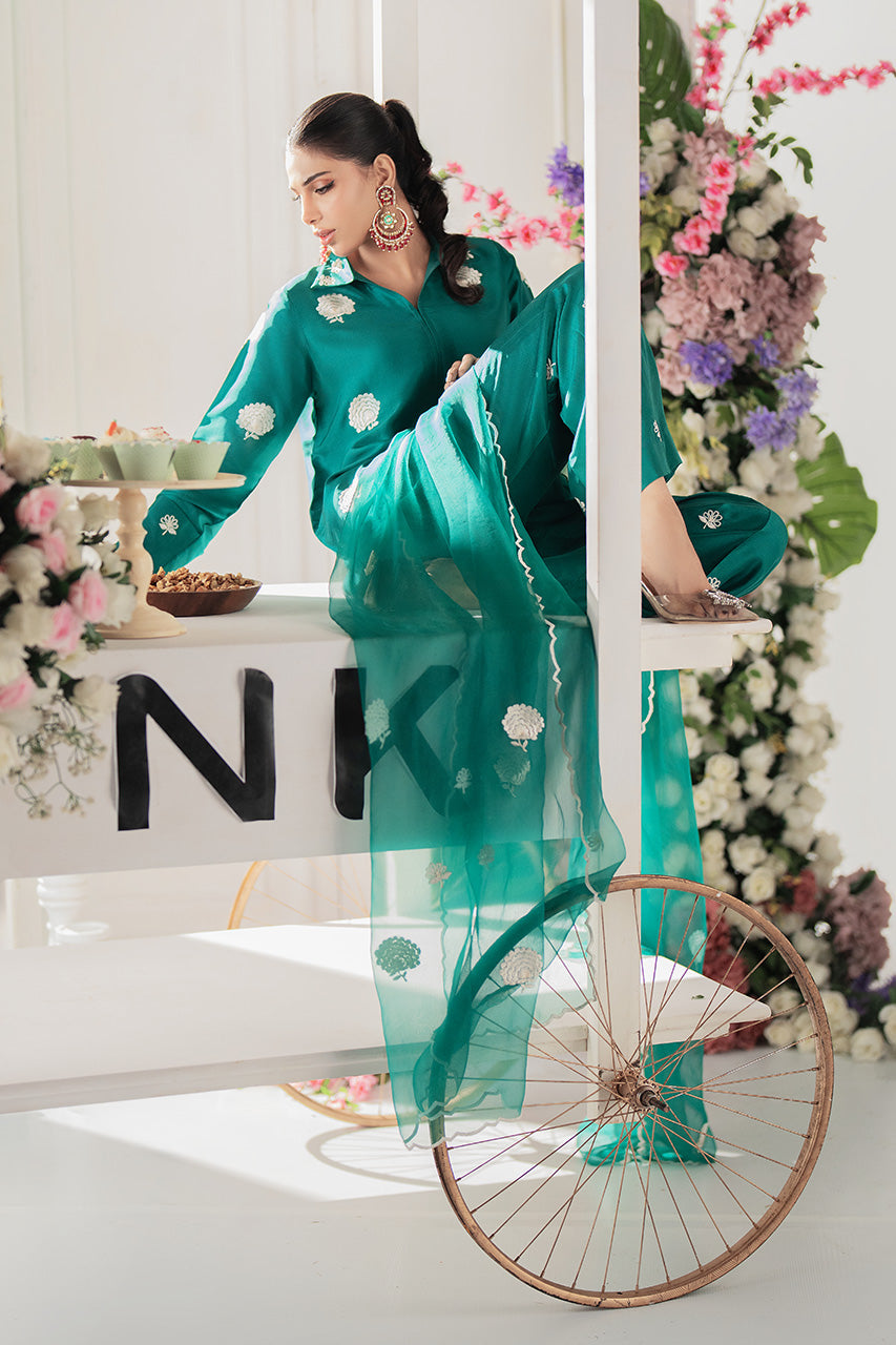 This refined raw silk short shirt is designed with intricate front embroidery and detailed with a structured collar neckline for a polished finish. Embroidered motifs add a touch of elegance, structured collar neckline for a polished finish. Embroidered motifs add a touch of elegance, while the bell-bottom trousers bring a stylish, modern appeal. A scalloped organza dupatta completes the ensemble, making it a statement of effortless sophistication.