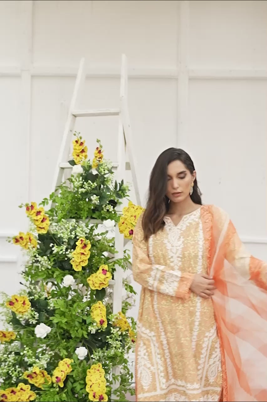 Crafted with impeccable finesse, this stunning ensemble in lavish crepe silk showcases intricate machine embroidery, enriched by tasteful block print motifs. Adorned with delicate lace which is paired elegantly with straight-cut pants, the outfit is completed by a chata pati organza dupatta, embodying a legacy of enduring grace and refinement.