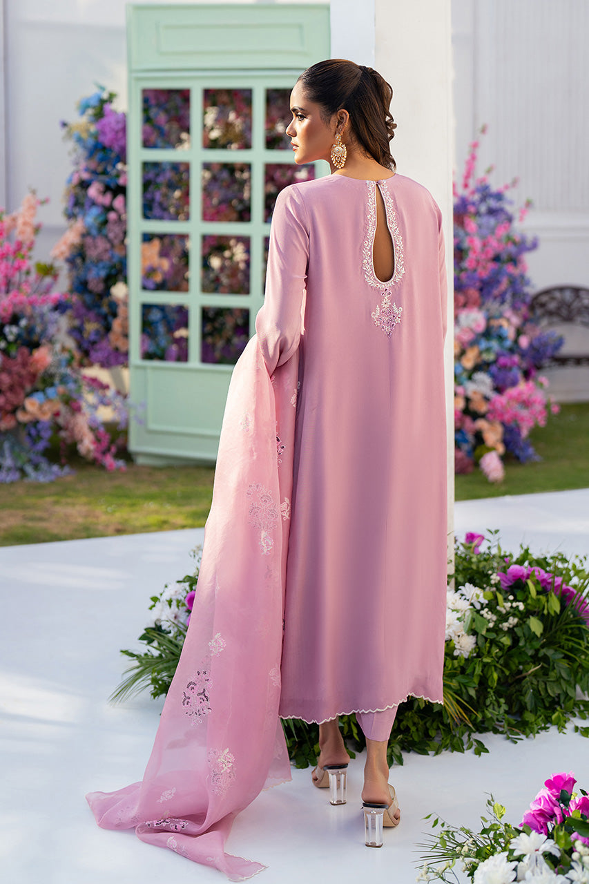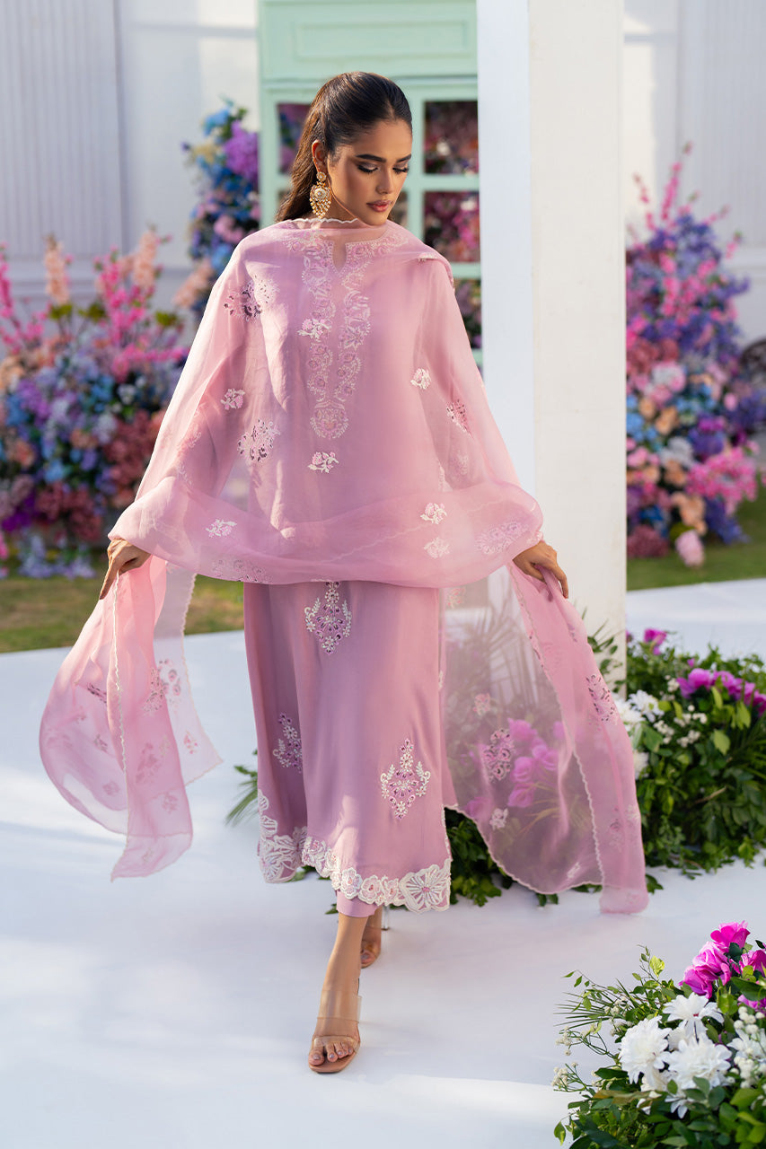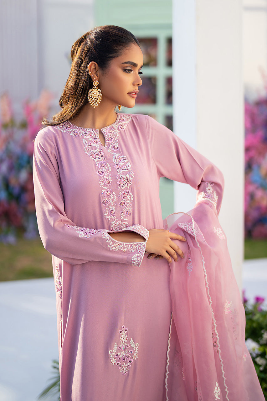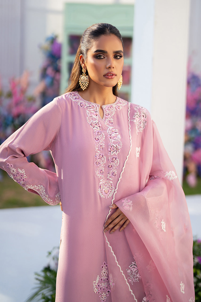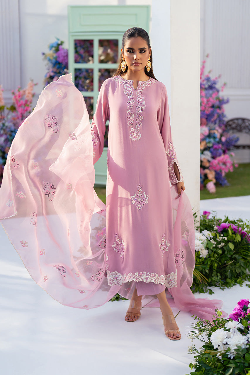 Our shirt features intricate embroidery on the front and back neck, sleeves, and daman, showcasing three beautiful chalk scallops and delicate motifs that add a touch of artistry. Complete with a graceful organza dupatta, beautifully adorned with full block print and scalloped edges, creating an ethereal look and paired with straight-cut crape pants.