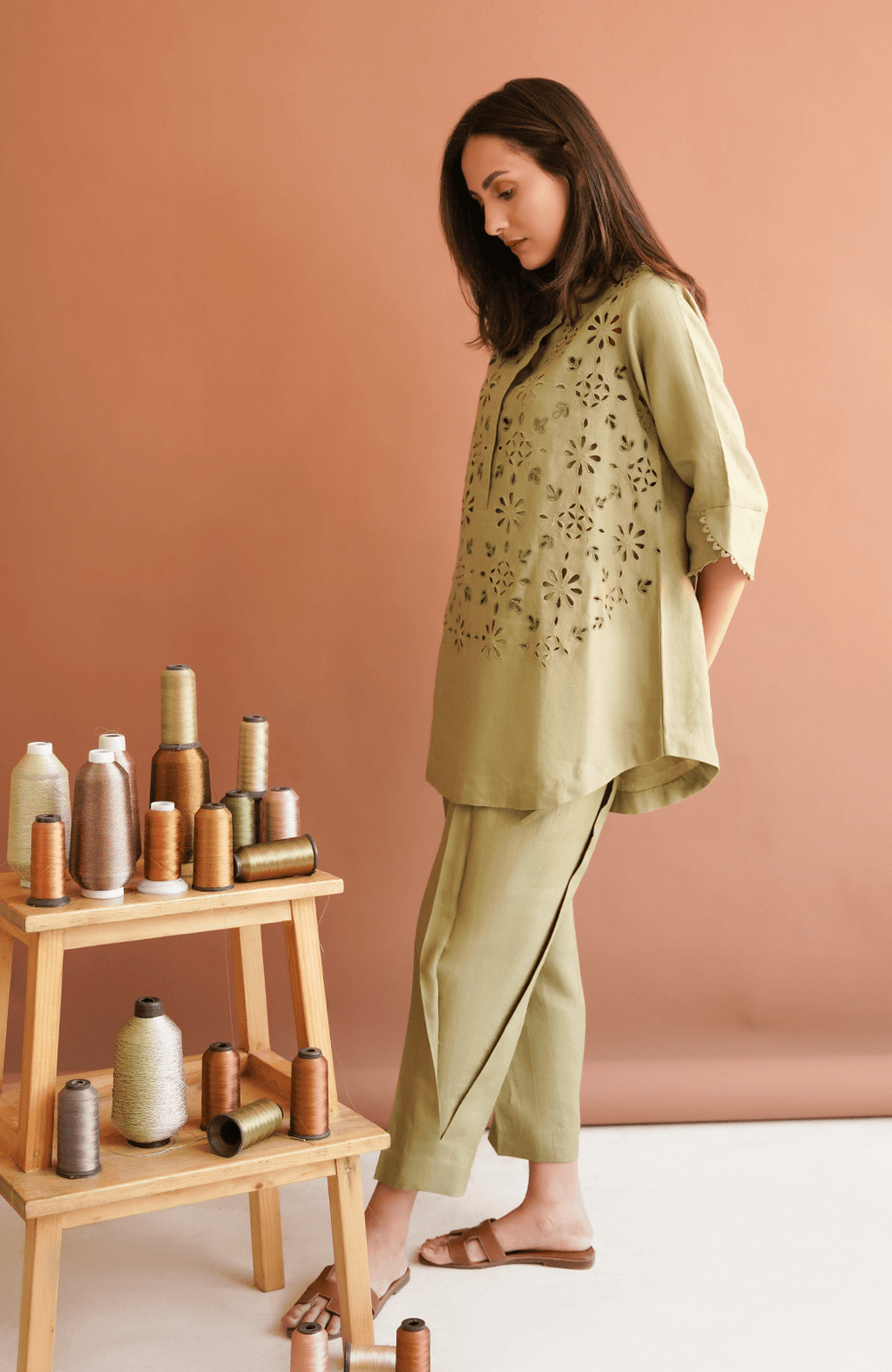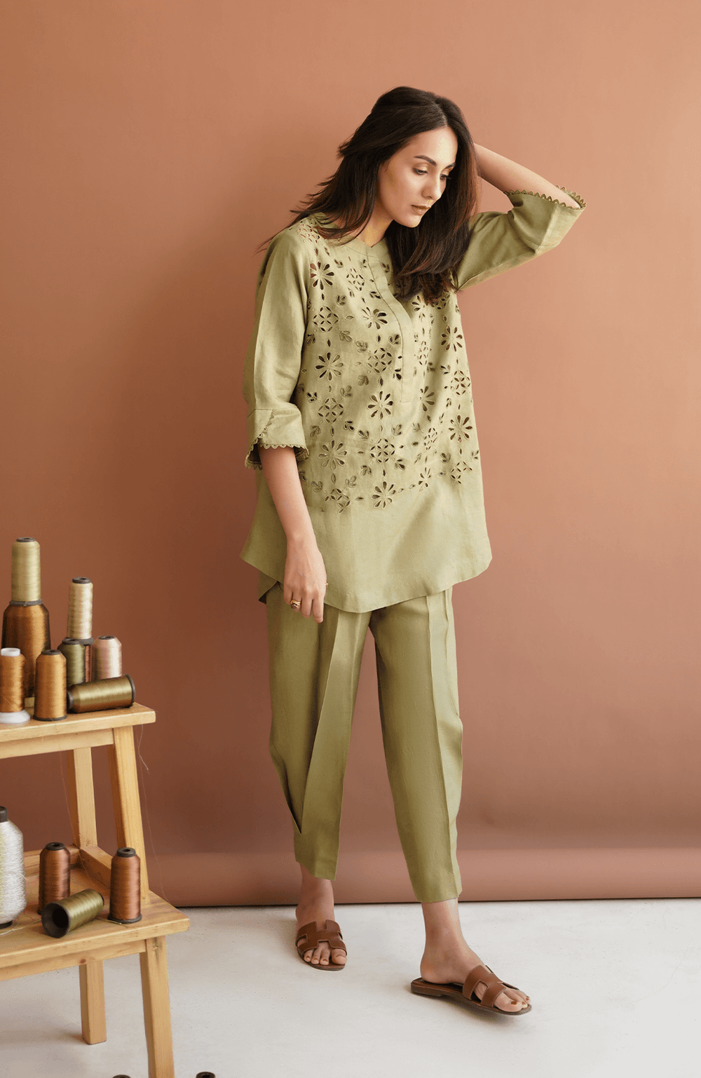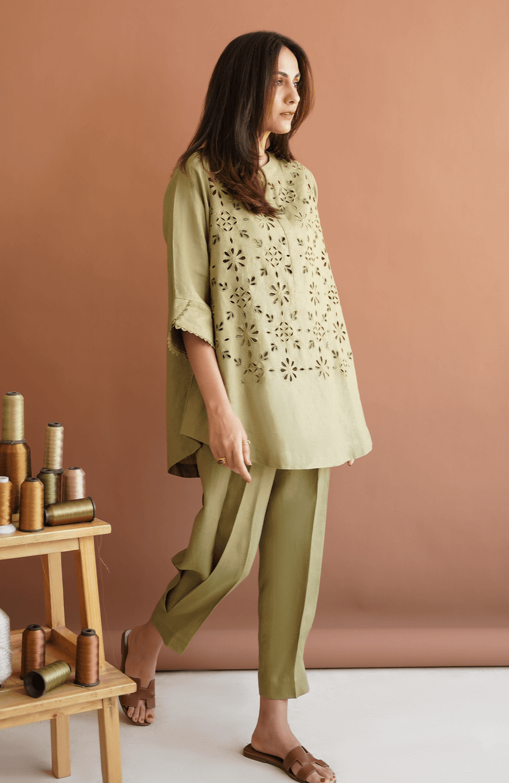 Pepper Stem green matching separates have cutwork on the shirt and a rounded hemline. This olive green shirt is finished with embroidery and resham work. To complete this set, pepper stem matching separates come with a side box pleat straight fit shalwar for a casual and breezy look.